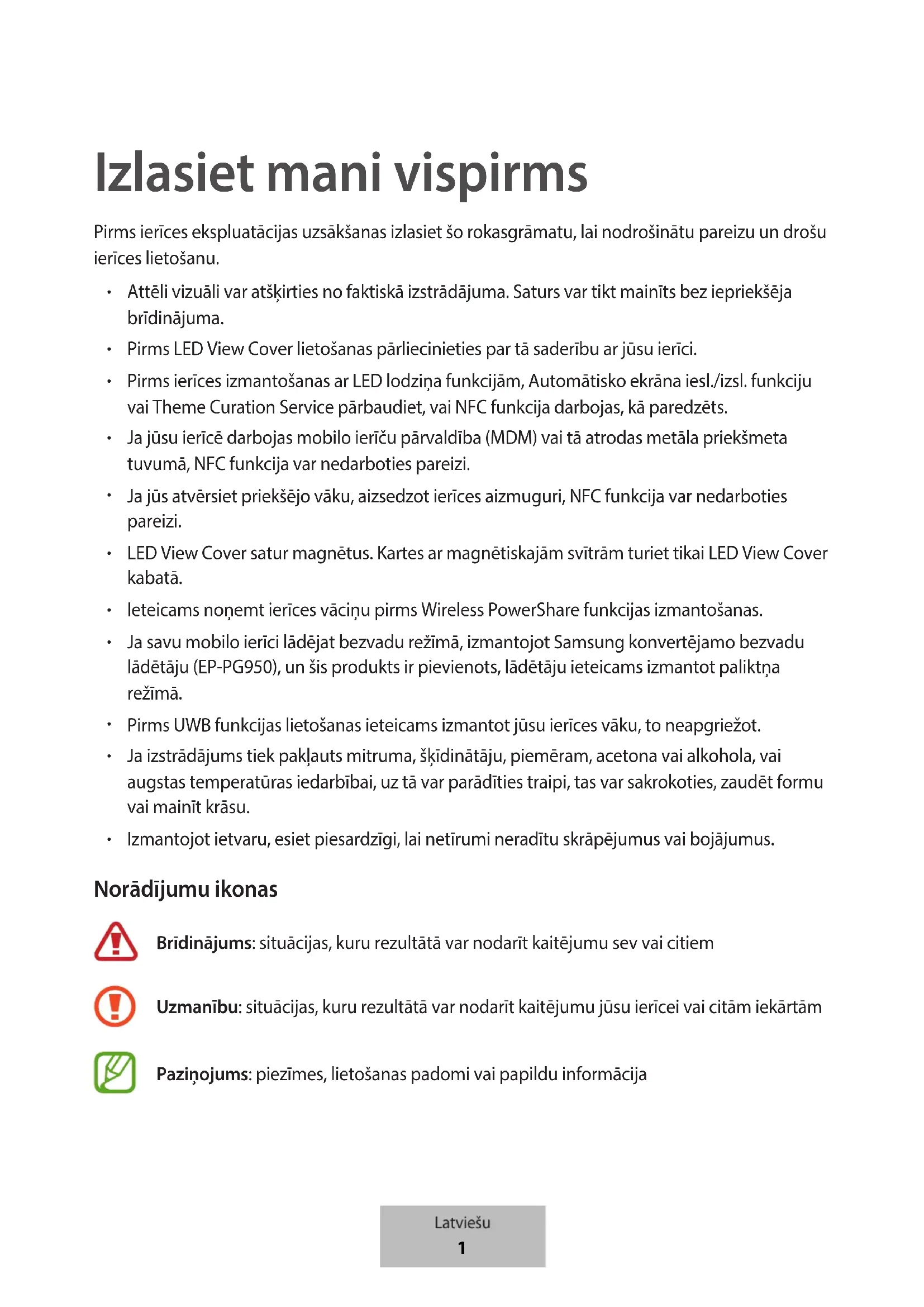 Izmantojot ietvaru, esiet piesardzīgi, lai netīrumi neradītu skrāpējumus vai bojājumus. Norādījumu ikonas Brīdinājums: situācijas, kuru rezultātā var nodarīt kaitējumu sev vai citiem Uzmanību: situācijas, kuru rezultātā var nodarīt kaitējumu jūsu ierīcei vai citām iekārtām Paziņojums: piezīmes, lietošanas padomi vai papildu informācija Latviešu