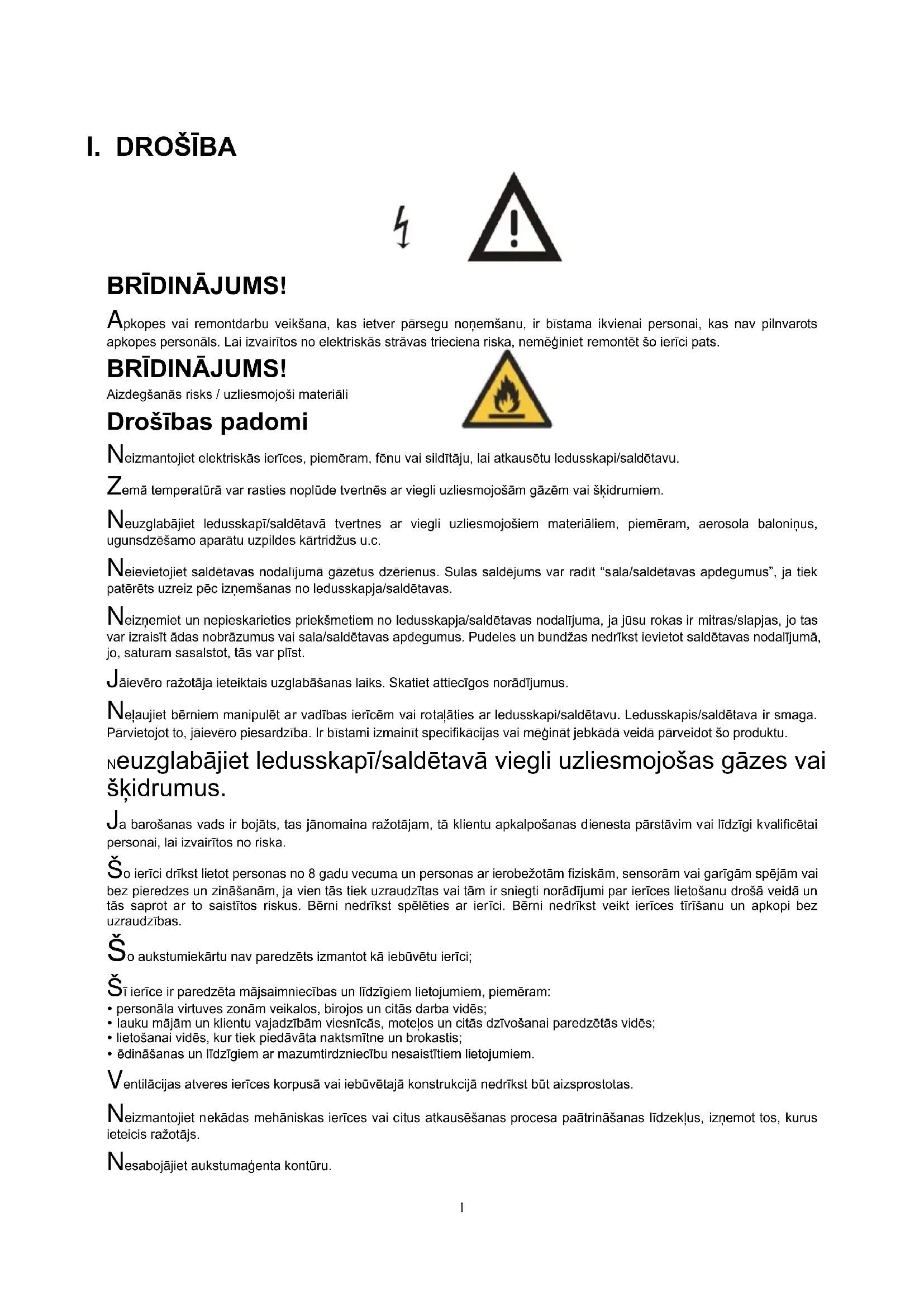 BRĪDINĀJUMS! Apkopes vai remontdarbu veikšana, kas ietver pārsegu noņemšanu, ir bīstama ikvienai personai, kas nav pilnvarots apkopes personāls. Lai izvairītos no elektriskās strāvas trieciena riska, nemēģiniet remontēt šo ierīci pats. BRĪDINĀJUMS! Aizdegšanās risks / uzliesmojoši materiāli Drošības padomi Neizmantojiet elektriskās ierīces, piemēram, fēnu vai sildītāju, lai atkausētu ledusskapi/saldētavu. Zemā temperatūrā var rasties noplūde tvertnēs ar viegli uzliesmojošām gāzēm vai šķidrumiem. Neuzglabājiet ledusskapī/saldētavā tvertnes ar viegli uzliesmojošiem materiāliem, piemēram, aerosola baloniņus, ugunsdzēšamo aparātu uzpildes kārtridžus u.c. Neievietojiet saldētavas nodalījumā gāzētus dzērienus. Sulas saldējums var radīt “sala/saldētavas apdegumus”, ja tiek patērēts uzreiz pēc izņemšanas no ledusskapja/saldētavas. Neizņemiet un nepieskarieties priekšmetiem no ledusskapja/saldētavas nodalījuma, ja jūsu rokas ir mitras/slapjas, jo tas var izraisīt ādas nobrāzumus vai sala/saldētavas apdegumus. Pudeles un bundžas nedrīkst ievietot saldētavas nodalījumā, jo, saturam sasalstot, tās var plīst. Jāievēro ražotāja ieteiktais uzglabāšanas laiks. Skatiet attiecīgos norādījumus. Neļaujiet bērniem manipulēt ar vadības ierīcēm vai rotaļāties ar ledusskapi/saldētavu. Ledusskapis/saldētava ir smaga. Pārvietojot to, jāievēro piesardzība. Ir bīstami izmainīt specifikācijas vai mēģināt jebkādā veidā pārveidot šo produktu. Neuzglabājiet ledusskapī/saldētavā viegli uzliesmojošas gāzes vai šķidrumus. Ja barošanas vads ir bojāts, tas jānomaina ražotājam, tā klientu apkalpošanas dienesta pārstāvim vai līdzīgi kvalificētai personai, lai izvairītos no riska. Šo ierīci drīkst lietot personas no 8 gadu vecuma un personas ar ierobežotām fiziskām, sensorām vai garīgām spējām vai bez pieredzes un zināšanām, ja vien tās tiek uzraudzītas vai tām ir sniegti norādījumi par ierīces lietošanu drošā veidā un tās saprot ar to saistītos riskus. Bērni nedrīkst spēlēties ar ierīci. Bērni nedrīkst veikt ierīces tīrīšanu un apkopi bez uzraudzības. Šo aukstumiekārtu nav paredzēts izmantot kā iebūvētu ierīci; Šī ierīce ir paredzēta mājsaimniecības un līdzīgiem lietojumiem, piemēram: personāla virtuves zonām veikalos, birojos un citās darba vidēs; lauku mājām un klientu vajadzībām viesnīcās, moteļos un citās dzīvošanai paredzētās vidēs; lietošanai vidēs, kur tiek piedāvāta naktsmītne un brokastis; ēdināšanas un līdzīgiem ar mazumtirdzniecību nesaistītiem lietojumiem. Ventilācijas atveres ierīces korpusā vai iebūvētajā konstrukcijā nedrīkst būt aizsprostotas. Neizmantojiet nekādas mehāniskas ierīces vai citus atkausēšanas procesa paātrināšanas līdzekļus, izņemot tos, kurus ieteicis ražotājs. Nesabojājiet aukstumaģenta kontūru.2 Pārtikas uzglabāšanas nodalījumos neizmantojiet nekādas elektroierīces, izņemot tās, kuras ieteicis ražotājs. Neglabājiet šajā ierīcē sprādzienbīstamas vielas, piemēram, aerosola baloniņus ar uzliesmojošu propelentu. Šī ierīci nav paredzēta lietošanai personām (tostarp bērniem) ar ierobežotām fiziskām, sensorām vai garīgām spējām vai bez pieredzes un zināšanām, izņemot tad, ja tās tiek uzraudzītas vai persona, kas atbild par viņu drošību, ir tām sniegusi norādījumus par ierīces lietošanu. Bērni ir jāuzrauga, lai nodrošinātu, ka viņi nespēlējas ar ierīci. - BRĪDINĀJUMS! Ventilācijas atveres ierīces korpusā vai iebūvētajā konstrukcijā nedrīkst būt aizsprostotas. - BRĪDINĀJUMS! Neizmantojiet nekādas mehāniskas ierīces vai citus atkausēšanas procesa paātrināšanas līdzekļus, izņemot tos, kurus ieteicis ražotājs. - BRĪDINĀJUMS! Nesabojājiet aukstumaģenta kontūru. - BRĪDINĀJUMS! Ierīces pārtikas uzglabāšanas nodalījumos neizmantojiet nekādas elektroierīces, izņemot tās, kuras ieteicis ražotājs. - BRĪDINĀJUMS! Aukstumiekārtas, it īpaši I tipa ledusskapis–saldētava, var nedarboties nepārtraukti (iespējama satura atkušana vai pārmērīga temperatūras paaugstināšanās saldētās pārtikas nodalījumā), ja tās ilgstoši atrodas apstākļos, kuros temperatūra ir zemāka par diapazonu, kādam šī aukstumiekārta ir paredzēta. - BRĪDINĀJUMS! Ir svarīgi, lai durvju vai vāku, kas aprīkoti ar slēdzenēm un atslēgām, atslēgas glabātos bērniem nepieejamā vietā, nevis aukstumiekārtas tuvumā, lai novērstu bērnu ieslēgšanu ierīcē. - BRĪDINĀJUMS! Uz ierīcē izmantoto aukstumaģentu un izolācijas materiāliem attiecas atsevišķi utilizācijas noteikumi. - BRĪDINĀJUMS! Novietojot ierīci, pārliecinieties, vai barošanas vads nav iesprostots vai bojāts. - BRĪDINĀJUMS! Ierīces aizmugurē nenovietojiet vairākas pārnēsājamās kontaktligzdas vai pārnēsājamos barošanas blokus. Bērniem vecumā no 3 līdz 8 gadiem ir atļauts ievietot un izņemt produktus no dzesēšanas ierīcēm. Lai izvairītos no pārtikas piesārņojuma, ievērojiet tālāk minētos norādījumus. - Ilgstoši atstājot vaļā durvis, var būtiski paaugstināties temperatūra ierīces nodalījumos. - Regulāri tīriet virsmas, kas var nonākt saskarē ar pārtiku, un pieejamās drenāžas sistēmas. - Iztīriet ūdens tvertnes, ja tās nav lietotas 48 stundas; izskalojiet ūdensapgādes sistēmai pievienoto ūdensvadu, ja ūdens padeve nav notikusi 5 dienas. - Jēlu gaļu un zivis uzglabājiet piemērotos traukos ledusskapī tā, lai tās nepieskartos citiem pārtikas produktiem un nepilētu uz tiem. - Ar divām zvaigznītēm apzīmētie saldētas pārtikas nodalījumi ir piemēroti iepriekš sasaldētas pārtikas uzglabāšanai, saldējuma uzglabāšanai vai pagatavošanai un ledus kubiņu sagatavošanai. - Ar vienu, divām un trīs zvaigznītēm apzīmē