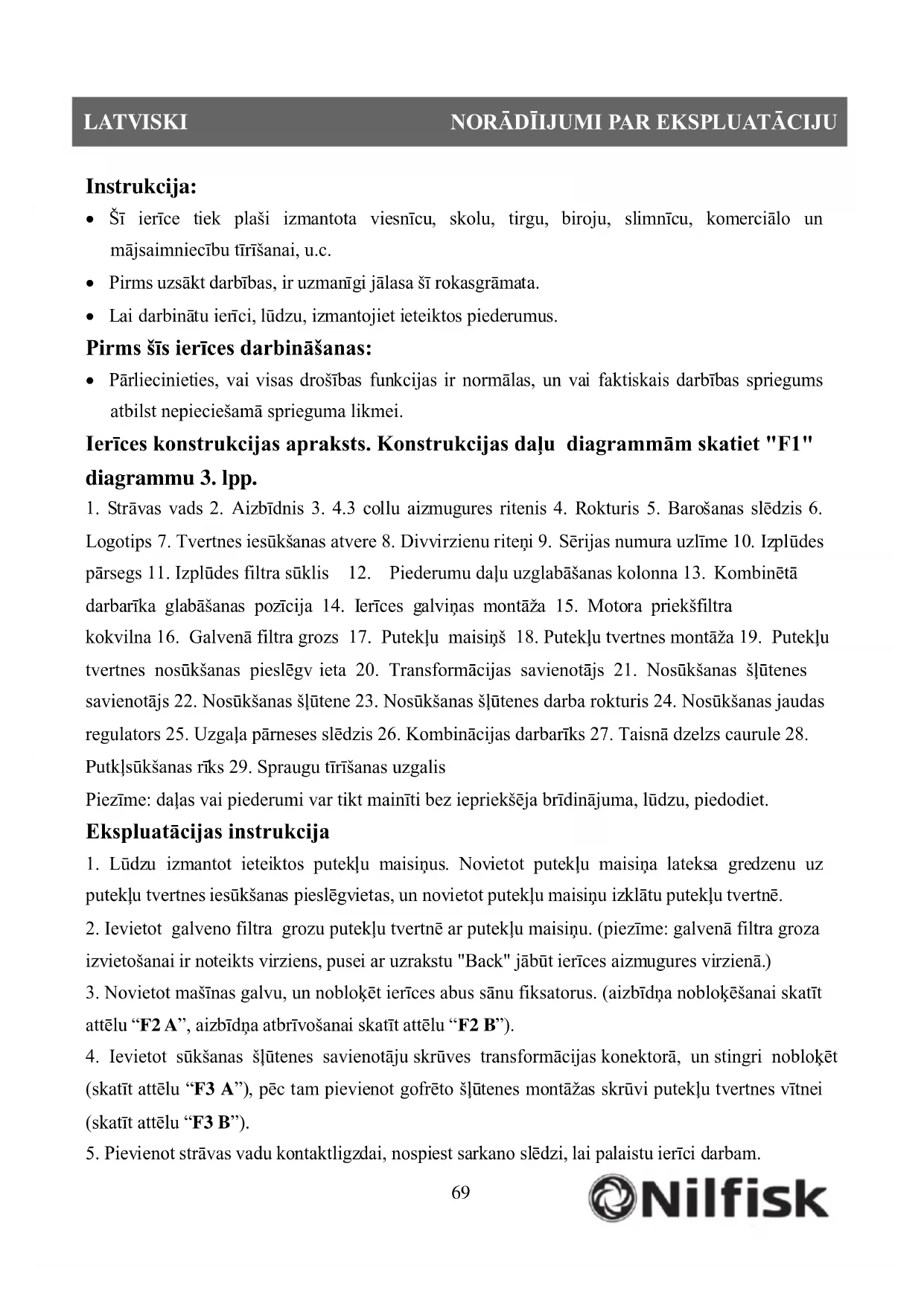 Instrukcija: Šī ierīce tiek plaši izmantota viesnīcu, skolu, tirgu, biroju, slimnīcu, komerciālo un mājsaimniecību tīrīšanai, u.c. Pirms uzsākt darbības, ir uzmanīgi jālasa šī rokasgrāmata. Lai darbinātu ierīci, lūdzu, izmantojiet ieteiktos piederumus. Pirms šīs ierīces darbināšanas: Pārliecinieties, vai visas drošības funkcijas ir normālas, un vai faktiskais darbības spriegums atbilst nepieciešamā sprieguma likmei. Ierīces konstrukcijas apraksts. Konstrukcijas daļu diagrammām skatiet "F1" diagrammu 3. lpp.
