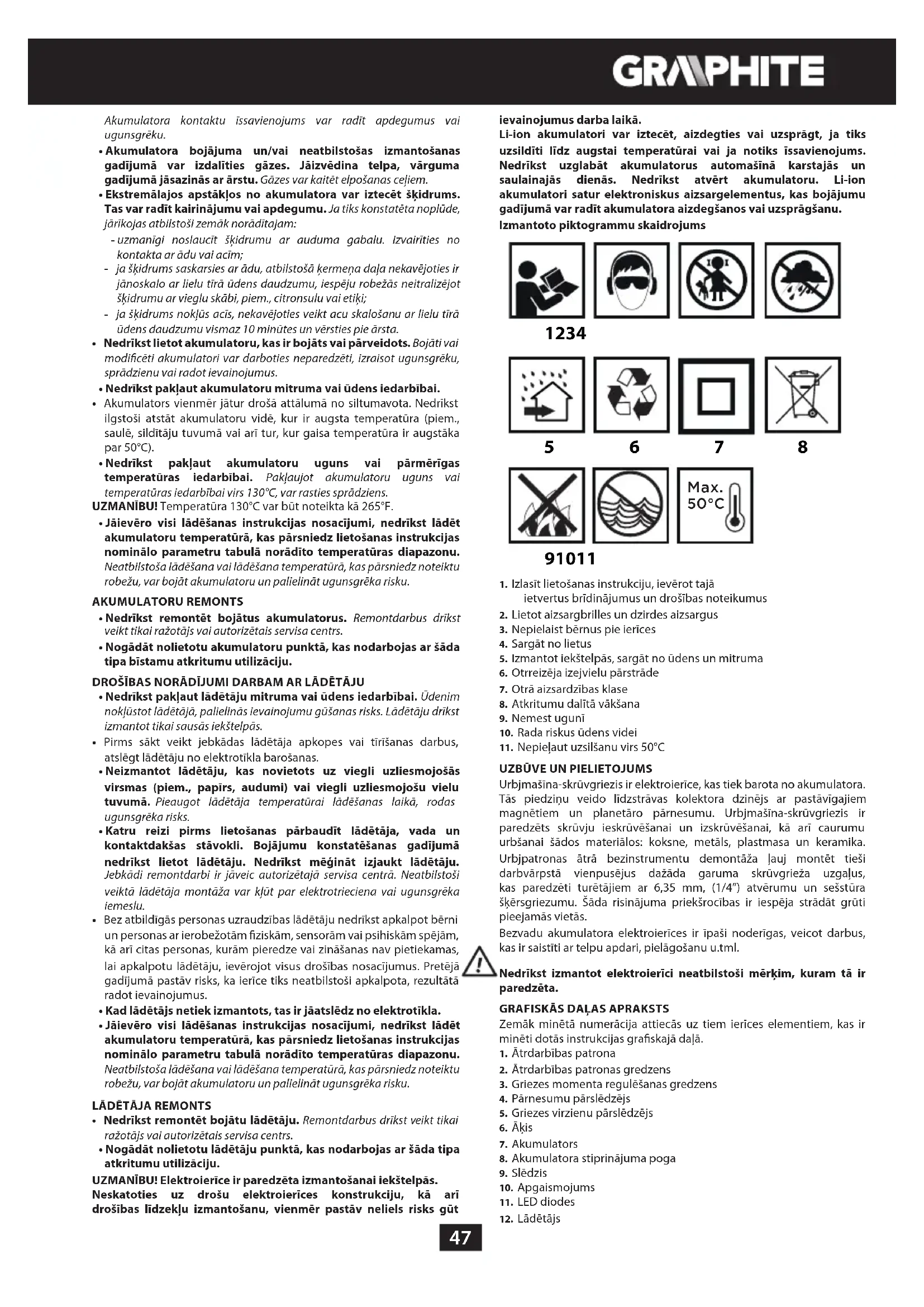 Zemāk minētā numerācija attiecās uz tiem ierīces elementiem, kas ir minēti dotās instrukcijas graskajā daļā. 1. Ātrdarbības patrona2. Ātrdarbības patronas gredzens3. Griezes momenta regulēšanas gredzens4. Pārnesumu pārslēdzējs 5. Griezes virzienu pārslēdzējs6. Āķis7. Akumulators8. Akumulatora stiprinājuma poga9. Slēdzis10. Apgaismojums11. LED diodes12. Lādētājs48