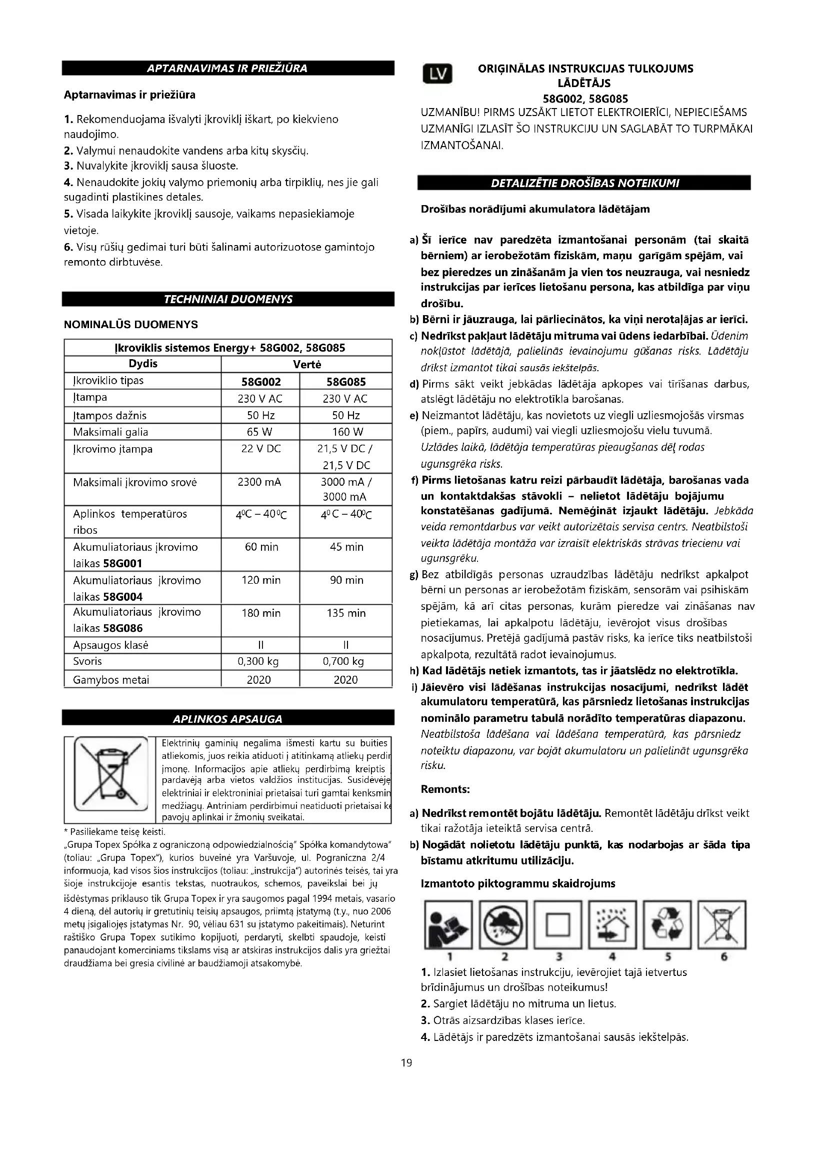 - Lādētāji 58G002 un 58G085 ir paredzēti vienīgi sistēmas Energy+ litija jonu (Li-Ion) akumulatoru uzlādēšanai.