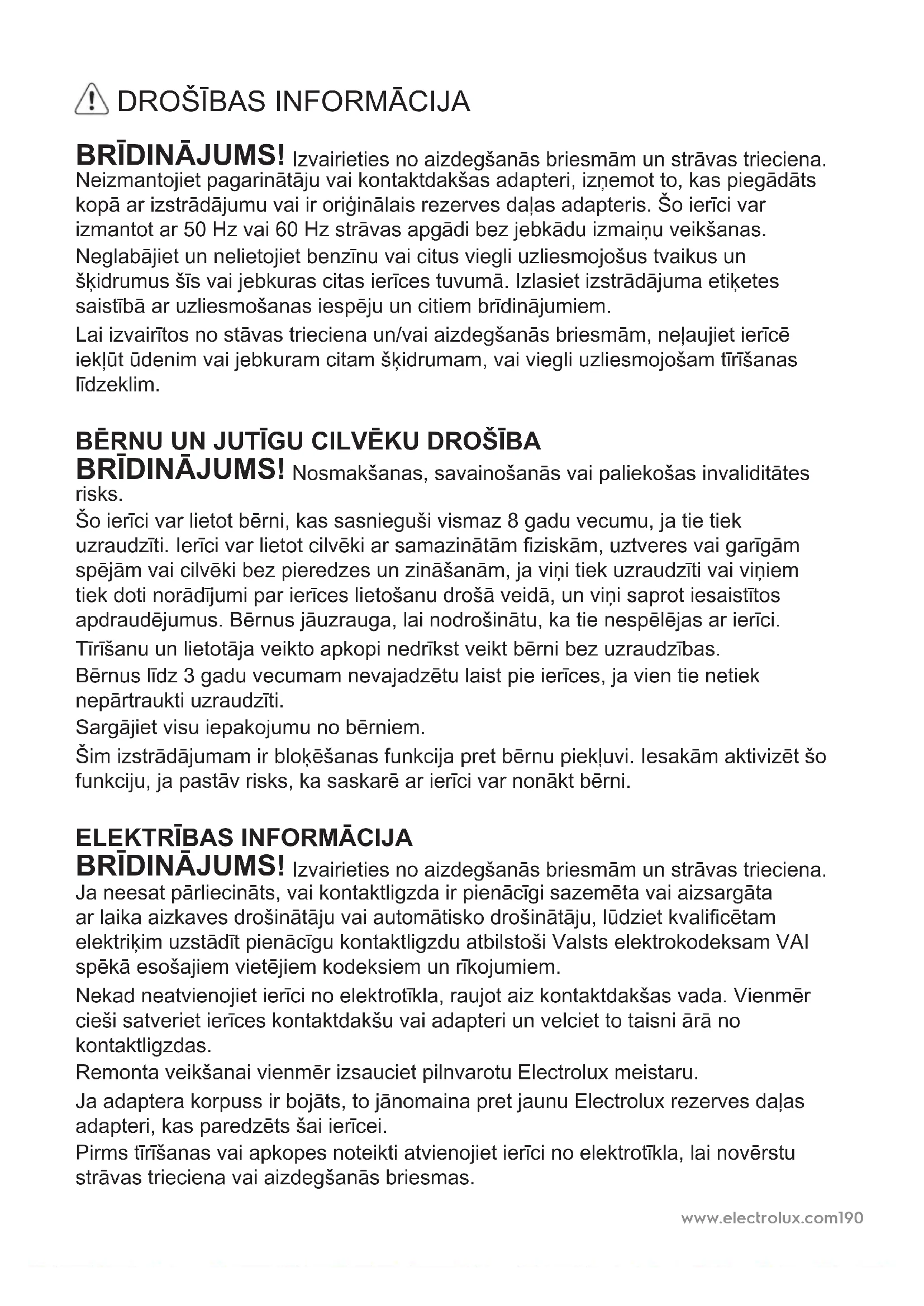 BRĪDINĀJUMS! Izvairieties no aizdegšanās briesmām un strāvas trieciena. Ja neesat pārliecināts, vai kontaktligzda ir pienācīgi sazemēta vai aizsargāta ar laika aizkaves drošinātāju vai automātisko drošinātāju, lūdziet kvalicētam elektriķim uzstādīt pienācīgu kontaktligzdu atbilstoši Valsts elektrokodeksam VAI spēkā esošajiem vietējiem kodeksiem un rīkojumiem. Nekad neatvienojiet ierīci no elektrotīkla, raujot aiz kontaktdakšas vada. Vienmēr cieši satveriet ierīces kontaktdakšu vai adapteri un velciet to taisni ārā no kontaktligzdas. Remonta veikšanai vienmēr izsauciet pilnvarotu Electrolux meistaru. Ja adaptera korpuss ir bojāts, to jānomaina pret jaunu Electrolux rezerves daļas adapteri, kas paredzēts šai ierīcei. Pirms tīrīšanas vai apkopes noteikti atvienojiet ierīci no elektrotīkla, lai novērstu strāvas trieciena vai aizdegšanās briesmas.www.electrolux.com 191