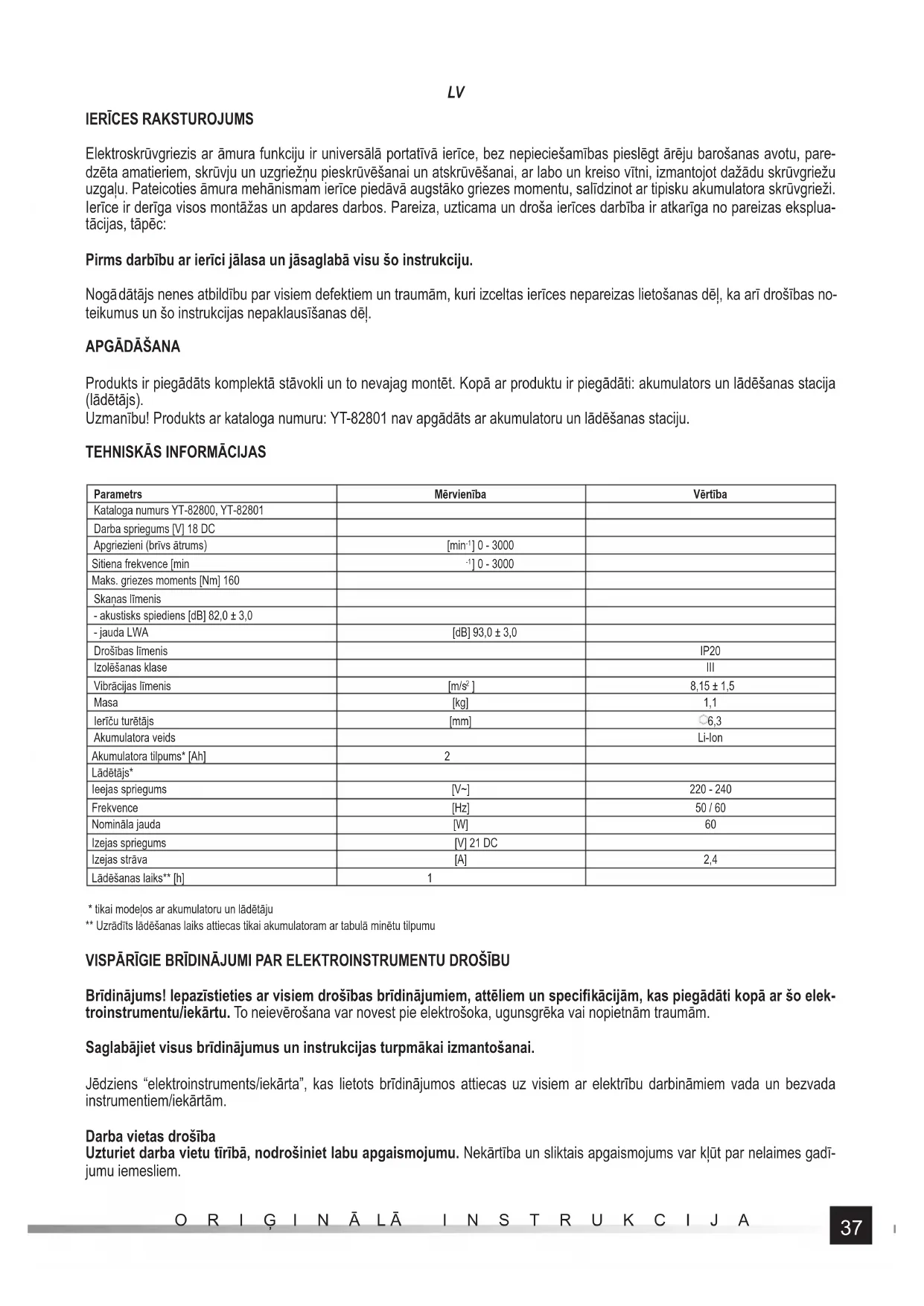 Parametrs Mērvienība Vērtība Kataloga numurs YT-82800, YT-82801 Darba spriegums [V] 18 DC Apgriezieni (brīvs ātrums) [min