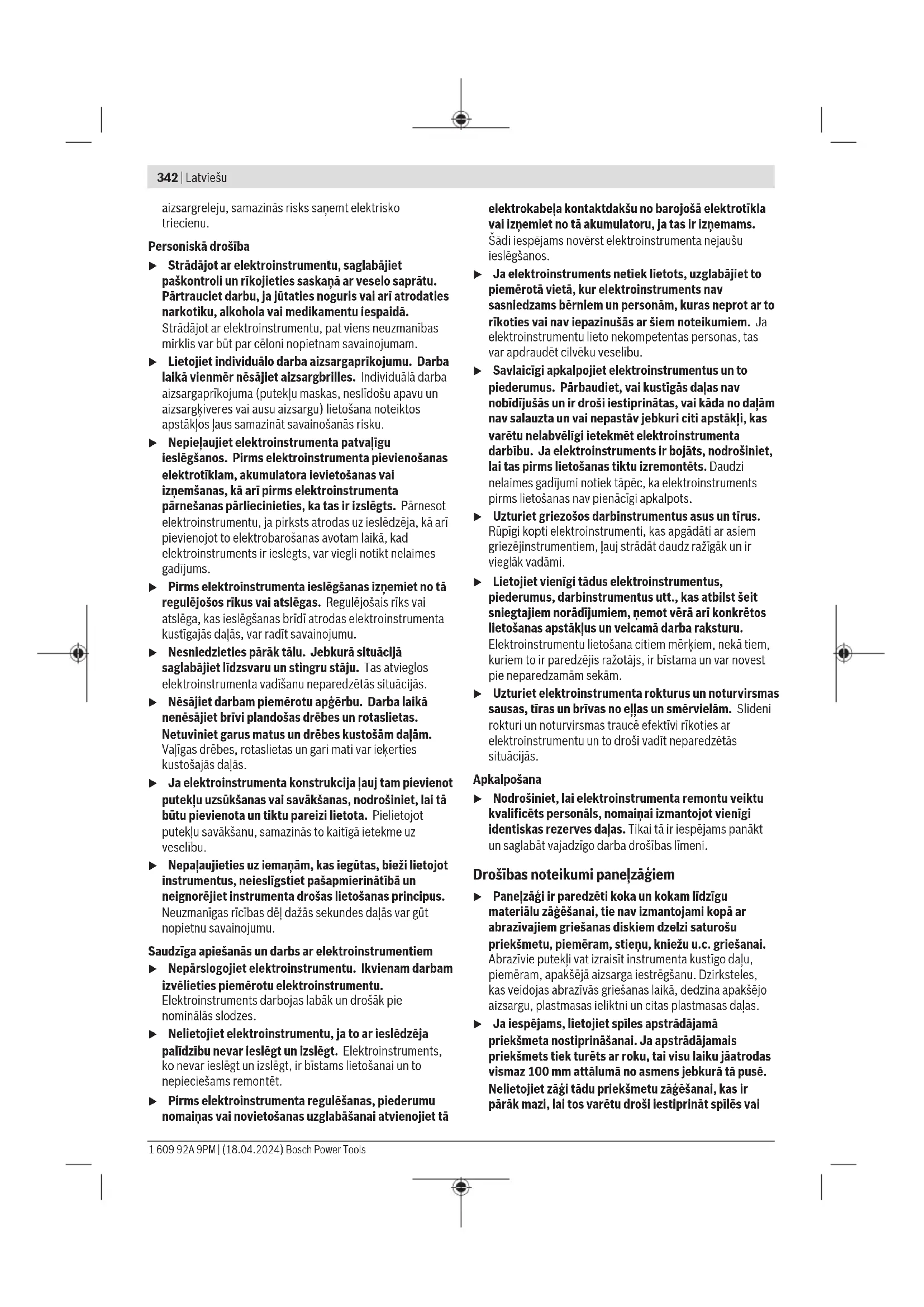 kg 16,8 16,8 Aizsardzības klase /II /II Piemērotu zāģa asmeņu izmēri Zāģa asmens diametrs D mm 216 216 Pamatnes plāksnes biezums mm 1,2−1,8 1,2−1,8 Urbuma diametrsd mm 30 25,4 A) Svars bez elektrotīkla pieslēguma kabeļa un elektrotīkla kontaktdakšas Šādi parametri tiek nodrošināti pie nominālā elektrobarošanas sprieguma [U] 220V. Elektroinstrumentiem, kas ir paredzēti zemākam spriegumam vai modificēti atbilstoši nacionālajiem standartiem, šie parametri var atšķirties. Pieļaujamie apstrādājamā priekšmeta izmēri (maksimālais/minimālais): (skatīt „Pieļaujamie apstrādājamā priekšmeta izmēri“, Lappuse351) Vērtības var atšķirties atkarībā no konkrētā izstrādājuma un izmantošanas vai apkārtējās vides apstākļiem. Plašāku informāciju skatiet vietnē www.bosch-professional.com/wac. Informācija par troksni Trokšņa emisijas vērtības ir noteiktas atbilstīgiENIEC62841-3-9. Elektroinstrumenta trokšņa līmeņa Aizsvarotās tipiskās vērtības: skaņas spiediena līmenis95dB(A), skaņas jaudas līmenis109dB(A). Mērījumu nenoteiktība K=3dB. Lietojiet dzirdes aizsarglīdzekļus! Šajā pamācībā norādītais trokšņa līmenis ir izmērīts atbilstoši standartā noteiktajai procedūrai un var tikt izmantots elektroinstrumentu savstarpējai salīdzināšanai. To var izmantot arī trokšņa radītās papildu slodzes iepriekšējai novērtēšanai. Šeit norādītais vibrācijas līmenis ir attiecināms uz elektroinstrumenta galvenajiem pielietojuma veidiem. Ja elektroinstruments tiek lietots netipiskiem mērķiem, kopā ar netipiskiem darbinstrumentiem vai nav vajadzīgajā veidā apkalpots, tā radītā trokšņa līmenis var atšķirties no šeit norādītās vērtības. Tas var ievērojami palielināt trokšņa radīto papildu slodzi kopējam darba laika posmam. Lai precīzi izvērtētu trokšņa radīto papildu slodzi zināmam darba laika posmam, jāņem vērā arī laiks, kad elektroinstruments ir izslēgts vai arī darbojas, taču faktiski netiek izmantots paredzētā darba veikšanai. Tas var ievērojami samazināt trokšņa radīto papildu slodzi kopējam darba laika posmam. Montāža u Nepieļaujiet elektroinstrumenta patvaļīgu ieslēgšanos. Elektroinstrumenta montāžas un apkalpošanas laikā tā elektrokabeļa kontaktdakša nedrīkst būt pievienota pie elektrotīkla kontaktligzdas. Piegādes komplekts Lūdzu, ievērojiet piegādes apjoma aprakstu lietošanas instrukcijas sākumā. Pirms lietojat elektroinstrumentu pirmo reizi, pārliecinieties, ka tā piegādes komplektā ietilpst visas tālāk norādītās daļas: – Paneļzāģis ar tajā iestiprinātu zāģa asmeni – Fiksators (45) – Pārbīdāmā vadotne (28) – Skrūvspīles (41) – Sešstūra stieņatslēga/plakanrievas skrūvgriezis (43) – Putekļu maisiņš (37) – Apstrādājamā priekšmeta paliktnis (26) (2gab.) Norāde: pārbaudiet, vai elektroinstruments nav bojāts. Pirms turpināt lietot elektroinstrumentu, rūpīgi pārbaudiet, vai tā aizsargierīces un daļas ar nelieliem bojājumiem funkcionē pareizi un bez traucējumiem. Pārbaudiet, vai elektroinstrumenta kustīgās daļas netraucēti pārvietojas un 1 609 92A 9PM | (18.04.2024) Bosch Power ToolsLatviešu | 347 nav iespīlētas un vai kāda no daļām nav bojāta. Ikvienai daļai jābūt pareizi montētai un jāatbilst paredzētajiem nosacījumiem, tādējādi nodrošinot pareizu elektroinstrumenta darbību. Bojātās aizsargierīces vai daļas nekavējoties jānomaina vai kvalificēti jāizremontē pilnvarotā remonta darbnīcā. Atsevišķo daļu montāža – Uzmanīgi izsaiņojiet visas piegādātās daļas. – Noņemiet iesaiņojuma materiālu no elektroinstrumenta un no piederumiem, kas ir piegādāti ar to kopā. – Lai piegādes komplektā iekļautās instrumenta daļas būtu vieglāk montēt, elektroinstrumentam ir jābūt transportēšanas stāvoklī. Apstrādājamā priekšmeta paliktņu montāža (skat. attēlu A1) Apstrādājamā priekšmeta paliktņus var samontēt (26) elektroinstrumenta kreisajā vai labajā pusē, vai tieši uz paša elektroinstrumenta. Elastīgā uzlikšanas sistēma sniedz jums vairākas pagarināšanas vai paplašināšanas iespējas (skat. attēluG). – Pēc nepieciešamības ievietojiet apstrādājamā priekšmeta paliktni (26) stiprinājumos (47) uz elektroinstrumenta vai stiprinājumos (48) uz otrā apstrādājamā prieksmeta paliktņa. u Nekad nepārnēsājiet elektroinstrumentu, turot to aiz apstrādājamā priekšmeta paliktņiem. Elektroinstrumenta transportēšanas laikā izmantojiet vienīgi transportēšanas ierīces, bet ne aizsargierīces. Fiksatora montāža (skat. attēlu A2) Fiksators(45) nofiksē iestatīto vertikālo zāģēšanas leņķi, un tas ir nepieciešams drošai instrumenta izmantošanai. – Noskrūvējiet sešstūra uzgriezni no vītnes bultskrūvēm (49) . – Uzskrūvējiet fiksatoru (45) pulksteņrādītāja virzienā uz vītnes bultskrūvēm (49) un cieši pievelciet to. Pārbīdāmās vadotnes montāža (skat. attēluA3) Pārbīdāmā vadotne (28) ir jāuzstāda pirms zāģēšanas sākšanas. – Iebīdiet vadotni (28) pa labi no zāģa asmens attiecīgajā gropē un pievelciet fiksējošo skrūvi. (44) Vadotnes plakanajai daļai ir jābūt pavērstai uz iekšpusi pret zāģa asmeni. Stacionāra vai pusstacionāra montāža u Lai varētu droši strādāt ar elektroinstrumentu, tas pirms lietošanas jānostiprina uz līdzenas un stabilas virsmas (piemēram, uz darba galda). Montāža uz darba virsmas (attēls B1−B2) – Nostipriniet elektroinstrumentu uz darba virsmas, lietojot piemērotus skrūvju savienojumus. Šim nolūkam kalpo urbumi (15). vai – Nostipriniet elektroinstrumentu uz darba virsmas, piespiežot tā balstus ar tirdzniecībā pieejamām skrūvspīlēm. Montāža uz Bosch darba galda Pateicoties kājām ar regulējamu garumu, Bosch darba galds GTA nodrošina elektroinstrumentu ar atbals