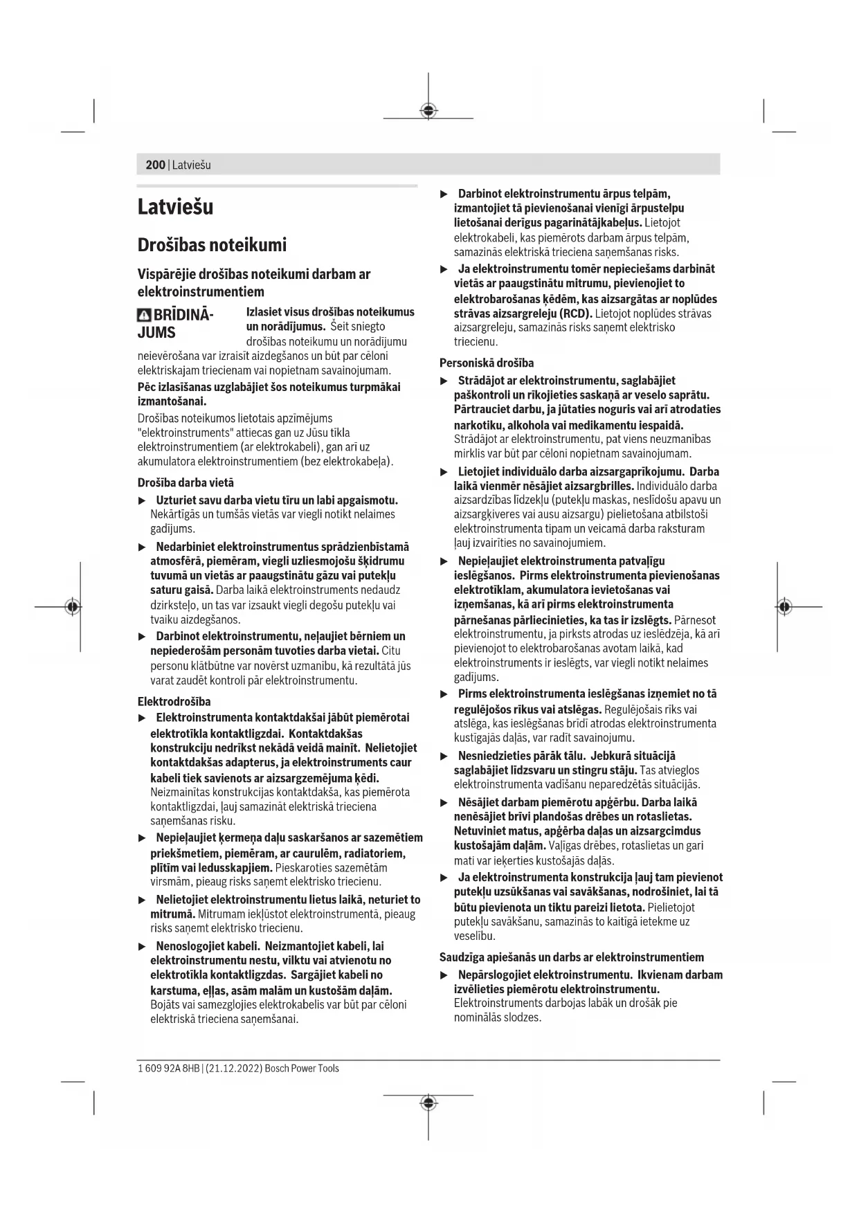 Pidev valgus 1 x valge 5000 Pidev valgus 2 x valge 7500 Pidev valgus 3 x valge 10000 Pidev valgus 4 x valge 12500 Pidev valgus 5 x valge 15000 u Veenduge, et tarvikule märgitud pöörlemiskiirus sama või suurem kui tööriista pöörlemiskiirus. Tarvikud, mis pöörlevad lubatust kiiremini, võivad puruneda ja tükkidena laiali paiskuda. LED-näidud (vaata joonistB) Järgnev tabel selgitab võimalikke LED-näitusid(2). Värv Seisund Tähendus/põhjus Lahendus valge Pidev valgus (1x...5x) Pöörlemiskiiruse eelvalik (vaadake „Pöörlemiskiiruse eelvalimine (vaata joonistB)“, Lehekülg198) roheline Pidev valgus (2x...5x) Aku on laetud (vaadake „Aku laetuse taseme näidik“, Lehekülg197) kollane Pidev valgus (1x) Aku on peaaegu tühi (vaadake „Aku laetuse taseme näidik“, Lehekülg197) Vahetage aku peagi või laadige akut 1 609 92A 8HB | (21.12.2022) Bosch Power ToolsEesti | 199 Värv Seisund Tähendus/põhjus Lahendus Vilkuv valgus (5x) Saavutatud on kriitiline temperatuur (mootor, elektroonika, aku) Laske elektrilisel tööriistal tühikäigul töötada ja jahtuda punane Pidev valgus (1x) Aku on tühi (vaadake „Aku laetuse taseme näidik“, Lehekülg197) Vahetage aku või laadige akut Vilkuv valgus (5x) Elektriline tööriist on üle kuumenenud ja lülitub välja Laske elektrilisel tööriistal jahtuda ja lülitage uuesti sisse Elektriline tööriist on blokeeritud ja lülitub välja Kõrvaldage blokaad ja lülitage elektriline tööriist uuesti sisse Spindlilukustus on aktiveeritud ja elektriline tööriist lülitub välja Inaktiveerige spindlilukustus ja lülitage elektriline tööriist uuesti sisse Elektrooniline püsikiiruse hoidja Elektrooniline püsikiiruse hoidja hoiab pöörlemiskiiruse tühikäigul ja koormusel peaaegu konstantsena ja tagab ühtlase töövõime. Tööjuhised Optimaalse töötulemuse saamiseks liigutage kettaga tugitaldrikut kerge survega ühtlaselt edasi-tagasi. Liiga tugev surve vähendab elektrilise tööriista jõudlust ja põhjustab lihvkeha kiiremat kulumist. u Kaitske lihvimistööriistu löökide eest. Hooldus ja korrashoid Hooldus ja puhastus u Eemaldage aku seadmest enne mis tahes töid seadme kallal (nt hooldus, tarvikute vahetus jmt), samuti enne seadme transportimist ja hoiulepanekut. Lüliti (sisse/ välja) juhuslik käsitsemine toob kaasa vigastuste ohu. u Seadme laitmatu ja ohutu töö tagamiseks hoidke seade ja selle ventilatsiooniavad puhtad. Klienditeenindus ja kasutusalane nõustamine Klienditeeninduse töötajad vastavad teie küsimustele teie toote remondi ja hoolduse ning varuosade kohta. Joonised ja info varuosade kohta leiate ka veebisaidilt: www.bosch-pt.com Boschi nõustajad on meeleldi abiks, kui teil on küsimusi toodete ja lisatarvikute kasutamise kohta. Päringute esitamisel ja varuosade tellimisel teatage meile kindlasti toote tüübisildil olev 10‑kohaline tootenumber. Eesti Vabariik Teeninduskeskus Tel.: (+372) 6549 575 Faks: (+372) 6549 576 E-posti: service-pt@lv.bosch.com Muud teeninduse aadressid leiate jaotisest: www.bosch-pt.com/serviceaddresses Transport Soovitatud liitiumioonakude suhtes kohaldatakse ohtlike veoste eeskirjade nõudeid. Akude puhul on lubatud kasutajapoolne piiranguteta maanteevedu. Kolmandate isikute teostatava veo korral (nt õhuvedu või ekspedeerimine) tuleb järgida pakendi ja tähistuse osas kehtivaid erinõudeid. Sellisel juhul peab veose ettevalmistamisel alati osalema ohtlike ainete veo ekspert. Aku vedu on lubatud vaid siis, kui aku korpus on vigastusteta. Katke lahtised kontaktid teibiga ja pakkige aku nii, et see pakendis ei liiguks. Järgige ka võimalikke täiendavaid siseriiklikke nõudeid. Kasutuskõlbmatuks muutunud seadmete käitlus Elektrilised tööriistad, akud, lisatarvikud ja pakendid tuleb keskkonnasäästlikult ringlusse võtta. Ärge käidelge elektrilisi tööriistu ja akusid/ patareisid koos olmejäätmetega! Üksnes ELliikmesriikidele: Vastavalt direktiivile 2012/19/EL elektri- ja elektroonikaseadmete jäätmete kohta ning nende kohaldamisele riigi õigusaktides tuleb kasutusressursi ammendanud elektritööriistad ja vastavalt direktiivile 2006/66/EÜ defektsed või kasutusressursi ammendanud akud/patareid eraldi kokku koguda ja suunata keskkonnasäästlikku taaskasutusse. Vale jäätmekäitluse korral võivad vanad elektri- ja elektroonikaseadmed, milles sisaldub kahjulikke aineid, kahjustada keskkonda ja inimeste tervist. Akud/patareid: Li-Ion: Järgige punktis Transport toodud juhiseid (vaadake „Transport“, Lehekülg199). Bosch Power Tools 1 609 92A 8HB | (21.12.2022)200 | Latviešu Latviešu Drošības noteikumi Vispārējie drošības noteikumi darbam ar elektroinstrumentiem BRĪDINĀ- JUMS Izlasiet visus drošības noteikumus un norādījumus. Šeit sniegto drošības noteikumu un norādījumu neievērošana var izraisīt aizdegšanos un būt par cēloni elektriskajam triecienam vai nopietnam savainojumam. Pēc izlasīšanas uzglabājiet šos noteikumus turpmākai izmantošanai. Drošības noteikumos lietotais apzīmējums "elektroinstruments" attiecas gan uz Jūsu tīkla elektroinstrumentiem (ar elektrokabeli), gan arī uz akumulatora elektroinstrumentiem (bez elektrokabeļa). Drošība darba vietā u Uzturiet savu darba vietu tīru un labi apgaismotu. Nekārtīgās un tumšās vietās var viegli notikt nelaimes gadījums. u Nedarbiniet elektroinstrumentus sprādzienbīstamā atmosfērā, piemēram, viegli uzliesmojošu šķidrumu tuvumā un vietās ar paaugstinātu gāzu vai putekļu saturu gaisā. Darba laikā elektroinstruments nedaudz dzirksteļo, un tas var izsaukt viegli degošu putekļu vai tvaiku aizdegšanos. u Darbinot elektroinstrumentu, neļaujiet bērniem un nepiederošām personām tuvoties darba vietai. Citu personu klātbūtne var novērst uzmanību, kā rezultātā jūs varat zaudēt kontroli pār elektroinstrumentu. Elektrodrošība u Elektroinstrumenta kontaktdakšai jābūt piemērotai elektrotīkla kontaktligzdai. Kontaktdakšas 