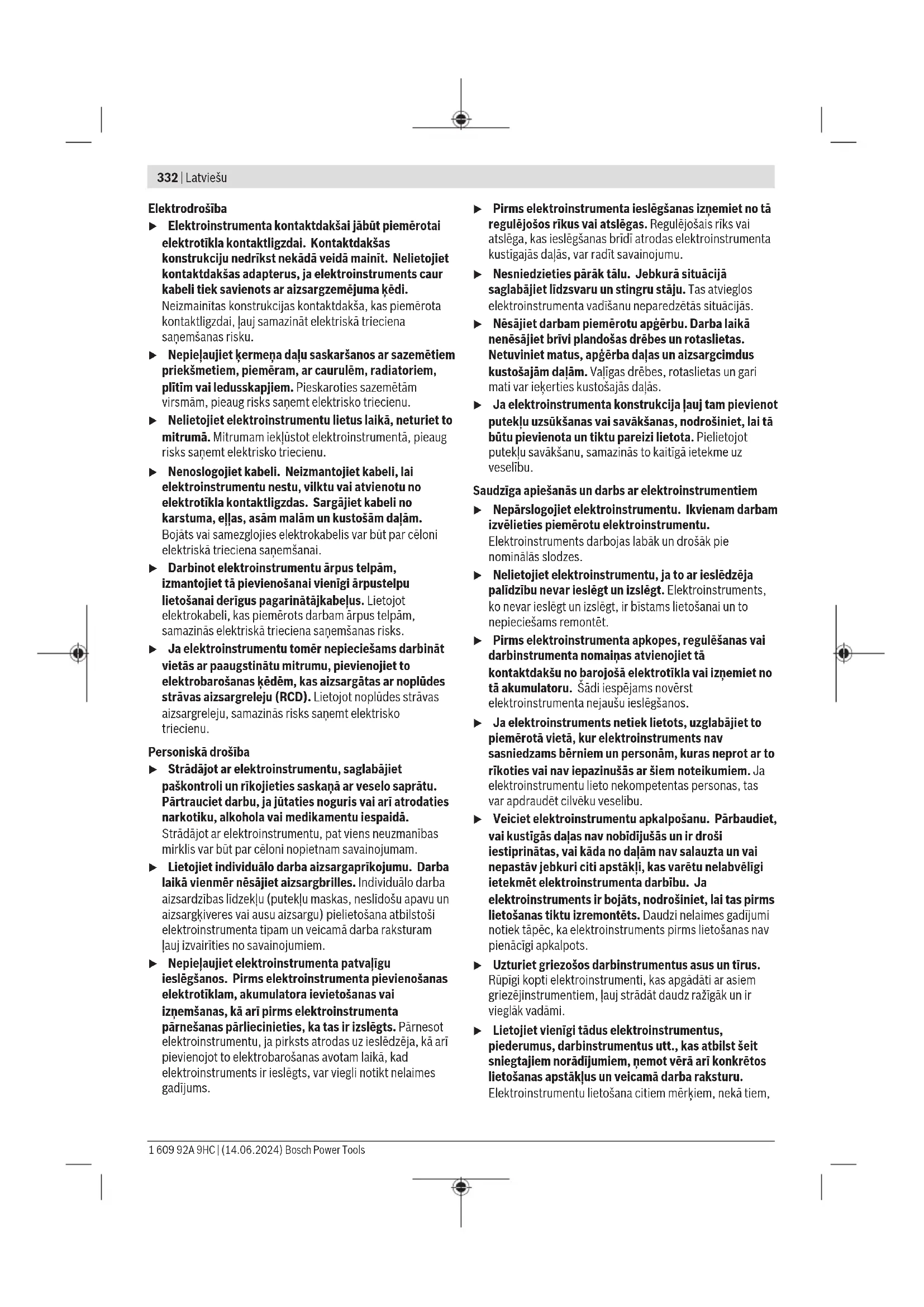 Aluspind on liiga kõva Kõvade siseosadega betooni korral proovige kinnitamist teisest kohast. Vastasel korral kasutage alternatiivseid kinnitusmeetodeid, nt tüübleid. Nael ei püsi terases. Terasest aluspind on liiga õhuke Kasutage alternatiivseid kinnitusmeetodeid, nt kruvisid. 1 609 92A 9HC | (14.06.2024) Bosch Power ToolsLatviešu | 331 Probleem Põhjus Kõrvaldamine Nael ei tule kontaktelemendist välja või kontaktelement jääb sissesurutud asendisse. Kiildumine kontaktelemendis (nt võõrkehade või mustuse tõttu) Kõrvaldage kiildumine (vaadake „Kiildumiste kõrvaldamine/ Reset“, Lehekülg328). Liiga palju vigu Aluspind on liiga kõva Kasutage alternatiivseid kinnitusmeetodeid, nt tüübleid. Löögitempel on kulunud Laske elektrilist tööriista Bosch elektriliste tööriistade volitatud klienditeeninduskohas parandada. Naelad ei libise magasini. Magasin on määrdunud Puhastage magasin (12), nt pintsliga. Klienditeenindus ja kasutusalane nõustamine Klienditeeninduse töötajad vastavad teie küsimustele teie toote remondi ja hoolduse ning varuosade kohta. Joonised ja info varuosade kohta leiate ka veebisaidilt: www.bosch-pt.com Boschi nõustajad on meeleldi abiks, kui teil on küsimusi toodete ja lisatarvikute kasutamise kohta. Päringute esitamisel ja varuosade tellimisel teatage meile kindlasti toote tüübisildil olev 10‑kohaline tootenumber. Eesti Vabariik Teeninduskeskus Tel.: (+372) 6549 575 Faks: (+372) 6549 576 E-posti: service-pt@lv.bosch.com Muud teeninduse aadressid leiate jaotisest: www.bosch-pt.com/serviceaddresses Transport Soovitatud liitiumioonakude suhtes kohaldatakse ohtlike veoste autoveo eeskirja nõudeid. Kasutaja võib akusid ilma täiendavate kohustusteta maanteel vedada. Kolmandate isikute poolt teostatava veo korral (nt õhuvedu või edasitoimetamine) tuleb järgida pakendi ja tähistuse osas kehtivaid erinõudeid. Sellisel juhul peab veose ettevalmistamisel alati osalema ohtlike ainete ekspert. Aku vedu on lubatud vaid siis, kui aku korpus on vigastusteta. Katke lahtised kontaktid teibiga ja pakkige aku nii, et see pakendis ei liiguks. Järgige ka võimalikke täiendavaid siseriiklikke nõudeid. Kasutuskõlbmatuks muutunud seadmete käitlus Elektrilised tööriistad, akud, lisatarvikud ja pakendid tuleb keskkonnasäästlikult ringlusse võtta. Ärge käidelge elektrilisi tööriistu ja akusid/ patareisid koos olmejäätmetega! Üksnes ELliikmesriikidele: Kasutuselt kõrvaldatud elektrilised tööriistad ja defektsed või kasutatud akud/patareid tuleb eraldi jäätmekäitlusse suunata. Kasutage selleks ettenähtud kogumissüsteeme. Vale jäätmekäitluse korral võivad vanad elektri- ja elektroonikaseadmed, milles sisaldub kahjulikke aineid, kahjustada keskkonda ja inimeste tervist. Akud/patareid: Li-Ion: Järgige punktis Transport toodud juhiseid (vaadake „Transport“, Lehekülg331). Latviešu Drošības noteikumi Vispārējie drošības noteikumi darbam ar elektroinstrumentiem BRĪDINĀ- JUMS Izlasiet visus drošības noteikumus un norādījumus. Šeit sniegto drošības noteikumu un norādījumu neievērošana var izraisīt aizdegšanos un būt par cēloni elektriskajam triecienam vai nopietnam savainojumam. Pēc izlasīšanas uzglabājiet šos noteikumus turpmākai izmantošanai. Drošības noteikumos lietotais apzīmējums "elektroinstruments" attiecas gan uz Jūsu tīkla elektroinstrumentiem (ar elektrokabeli), gan arī uz akumulatora elektroinstrumentiem (bez elektrokabeļa). Drošība darba vietā u Uzturiet savu darba vietu tīru un labi apgaismotu. Nekārtīgās un tumšās vietās var viegli notikt nelaimes gadījums. u Nedarbiniet elektroinstrumentus sprādzienbīstamā atmosfērā, piemēram, viegli uzliesmojošu šķidrumu tuvumā un vietās ar paaugstinātu gāzu vai putekļu saturu gaisā. Darba laikā elektroinstruments nedaudz dzirksteļo, un tas var izsaukt viegli degošu putekļu vai tvaiku aizdegšanos. u Darbinot elektroinstrumentu, neļaujiet bērniem un nepiederošām personām tuvoties darba vietai. Citu personu klātbūtne var novērst uzmanību, kā rezultātā jūs varat zaudēt kontroli pār elektroinstrumentu. Bosch Power Tools 1 609 92A 9HC | (14.06.2024)332 | Latviešu Elektrodrošība u Elektroinstrumenta kontaktdakšai jābūt piemērotai elektrotīkla kontaktligzdai. Kontaktdakšas konstrukciju nedrīkst nekādā veidā mainīt. Nelietojiet kontaktdakšas adapterus, ja elektroinstruments caur kabeli tiek savienots ar aizsargzemējuma ķēdi. Neizmainītas konstrukcijas kontaktdakša, kas piemērota kontaktligzdai, ļauj samazināt elektriskā trieciena saņemšanas risku. u Nepieļaujiet ķermeņa daļu saskaršanos ar sazemētiem priekšmetiem, piemēram, ar caurulēm, radiatoriem, plītīm vai ledusskapjiem. Pieskaroties sazemētām virsmām, pieaug risks saņemt elektrisko triecienu. u Nelietojiet elektroinstrumentu lietus laikā, neturiet to mitrumā. Mitrumam iekļūstot elektroinstrumentā, pieaug risks saņemt elektrisko triecienu. u Nenoslogojiet kabeli. Neizmantojiet kabeli, lai elektroinstrumentu nestu, vilktu vai atvienotu no elektrotīkla kontaktligzdas. Sargājiet kabeli no karstuma, eļļas, asām malām un kustošām daļām. Bojāts vai samezglojies elektrokabelis var būt par cēloni elektriskā trieciena saņemšanai. u Darbinot elektroinstrumentu ārpus telpām, izmantojiet tā pievienošanai vienīgi ārpustelpu lietošanai derīgus pagarinātājkabeļus. Lietojot elektrokabeli, kas piemērots darbam ārpus telpām, samazinās elektriskā trieciena saņemšanas risks. u Ja elektroinstrumentu tomēr nepieciešams darbināt vietās ar paaugstinātu mitrumu, pievienojiet to elektrobarošanas ķēdēm, kas aizsargātas ar noplūdes strāvas aizsargreleju (RCD). Lietojot noplūdes strāvas aizsargreleju, samazinās risks saņemt elektrisko triecienu. Personiskā drošība u Strādājot ar elektroinstrumentu, saglabājiet paškontroli un rīkojieties saskaņā ar veselo saprātu. Pārtrauc