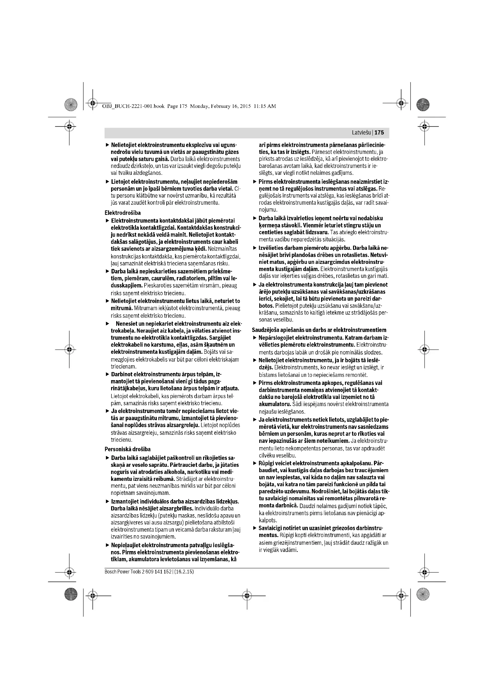 rējo putekļu uzsūkšanas vai savākšanas/uzkrāšanas ierīci, sekojiet, lai tā būtu pievienota un pareizi dar- botos. Pielietojot putekļu uzsūkšanu vai savākšanu/uz- krāšanu, samazinās to kaitīgā ietekme uz strādājošās per- sonas veselību. Saudzējoša apiešanās un darbs ar elektroinstrumentiem Nepārslogojiet elektroinstrumentu. Katram darbam iz- vēlieties piemērotu elektroinstrumentu. Elektroinstru- ments darbojas labāk un drošāk pie nominālās slodzes. Nelietojiet elektroinstrumentu, ja ir bojāts tā ieslē- dzējs. Elektroinstruments, ko nevar ieslēgt un izslēgt, ir bīstams lietošanai un to nepieciešams remontēt. Pirms elektroinstrumenta apkopes, regulēšanas vai darbinstrumenta nomaiņas atvienojiet tā kontakt- dakšu no barojoš ā elektrotīkla vai izņemiet no tā akumulatoru. Šādi iespējams novērst elektroinstrumenta nejaušu ieslēgšanos. Ja elektroinstruments netiek lietots, uzglabājiet to pie- mērotā vietā, kur elektroinstruments nav sasniedzams bērniem un personām, kuras neprot ar to rīkoties vai nav iepazinušās ar šiem noteikumiem. Ja elektroinstru- mentu lieto nekompetentas personas, tas var apdraudēt cilvēku veselību. Rūpīgi veiciet elektroinstrumenta apkalpošanu. Pār- baudiet, vai kustīgās daļas darbojas bez traucējumiem un nav iespiestas, vai kāda no daļām nav salauzta vai bojāta, vai katra no tām pareizi funkcionē un pilda tai paredzēto uzdevumu. Nodrošiniet, lai bojātās daļas tik- tu savlaicīgi nomainītas vai remontētas pilnvarotā re- monta darbnīcā. Daudzi nelaimes gadījumi notiek tāpēc, ka elektroinstruments pirms lietošanas nav pienācīgi ap- kalpots. Savlaicīgi notīriet un uzasiniet griezošos darbinstru- mentus. Rūpīgi kopti elektroinstrumenti, kas apgādāti ar asiem griezējinstrumentiem, ļauj strādāt daudz ražīgāk un ir vieglāk vadāmi. OBJ_BUCH-2221-001.book Page 175 Monday, February 16, 2015 11:15 AM176 | Latviešu 2 609 141 152 | (16.2.15) Bosch Power Tools Lietojiet vienīgi tādus elektroinstrumentus, papild- piederumus, darbinstrumentus utt., kas atbilst šeit sniegtajiem norādījumiem, ņemot vērā arī konkrētos darba apstākļus un pielietojuma īpatnības. Elektro- instrumentu lietošana citiem mērķiem, nekā tiem, kuriem to ir paredzējusi ražotājfirma, ir bīstama un var novest pie neparedzamām sekām. Saudzējoša apiešanās un darbs ar akumulatora elektro- instrumentiem Akumulatora uzlādei lietojiet tikai tādu uzlādes ierīci, ko ir ieteikusi elektroinstrumenta ražotājfirma. Katra uzlādes ierīce ir paredzēta tikai noteikta tipa akumulato- ram, un mēģinājums to lietot cita tipa akumulatoru uzlādei var novest pie uzlādes ierīces un/vai akumulatora aiz- degšanās. Pievienojiet elektroinstrumentam tikai tādu akumula- toru, ko ir ieteikusi ražotā jfirma. Cita tipa akumulatoru lietošana var būt par cēloni savainojumam vai novest pie elektroinstrumenta un/vai akumulatora aizdegšanās. Laikā, kad akumulators netiek lietots, nepieļaujiet, lai tā kontakti saskartos ar saspraudēm, monētām, atslē- gām, naglām, skrūvēm vai citiem nelieliem metāla priekšmetiem, kas varētu izraisīt īsslēgumu. Īsslēgums starp akumulatora kontaktiem var radīt apdegumus un būt par cēloni ugunsgrēkam. Nepareizi lietojot akumulatoru, no tā var izplūst šķid- rais elektrolīts. Nepieļaujiet elektrolīta nonākšanu sa- skarē ar ādu. Ja tas tomēr ir nejauši noticis, noskalojiet elektrolītu ar ūdeni. Ja elektrolīts nonāk acīs, nekavē- joties griezieties pie ā rsta. No akumulatora izplūdušais elektrolīts var izsaukt ādas iekaisumu vai pat apdegumu. Apkalpošana Nodrošiniet, lai elektroinstrumenta remontu veiktu kvalificēts personāls, nomaiņai izmantojot oriģinālās rezerves daļas un piederumus. Tikai tā iespējams panākt un saglabāt vajadzīgo darba drošības līmeni. Drošības noteikumi triecienskrūvgriežiem Veicot darbu, kura laikā ieskrūvējamā skrūve var skart slēptus elektriskos vadus, turiet instrumentu tikai aiz izolētajām virsmām. Skrūvei skarot spriegumnesošus va- dus, spriegums nonāk arī uz instrumenta metāla daļām un var būt par cēloni elektriskajam triecienam. Nostipriniet apstrādājamo priekšmetu. Iestiprinot ap- strādājamo priekšmetu skrūvspīlēs vai citā stiprinājuma ie- rīcē, strādāt ir drošāk, nekā tad, ja tas tiek turēts ar rokām. Pirms elektroinstrumenta novietošanas nogaidiet, līdz tas pilnīgi apstājas. Kustībā esošs darbinstruments var ie- strēgt, izsaucot kontroles zaudēšanu pār elektroinstru- mentu. Neatveriet akumulatoru. Tas var radīt īsslēgumu. Sargājiet akumulatoru no karstuma, piemēram, no ilgstošas atrašanās saules staros vai uguns tuvumā, kā arī no ūdens un mitruma. Tas var iz- raisīt sprādzienu. Bojājuma vai nepareizas lietošanas rezultātā akumula- tors var izdalīt kaitīgus izgarojumus. Šādā gadījumā iz- vēdiniet telpu un, ja jūtaties slikti, griezieties pie ārsta. Izgarojumi var izraisīt elpošanas ceļu kairinājumu. Lietojiet akumulatoru vienīgi kopā ar Bosch izstrādāju- mu, kuram tas ir paredzēts. Tikai tā akumulatoru iespē- jams pasargāt no kaitīgās pārslodzes. Asi priekšmeti, piemēram, nagla vai skrūvgriezis, k