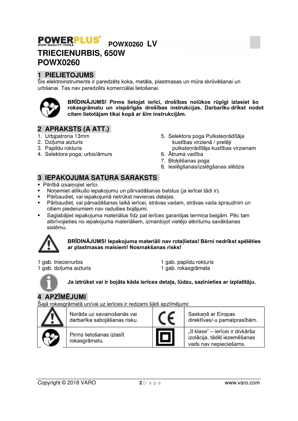 - Izmantojiet tikai oriģinālās rezerves daļas.POWX0260 LV Copyright © 2018 VARO 5 | l a p a www.varo.com