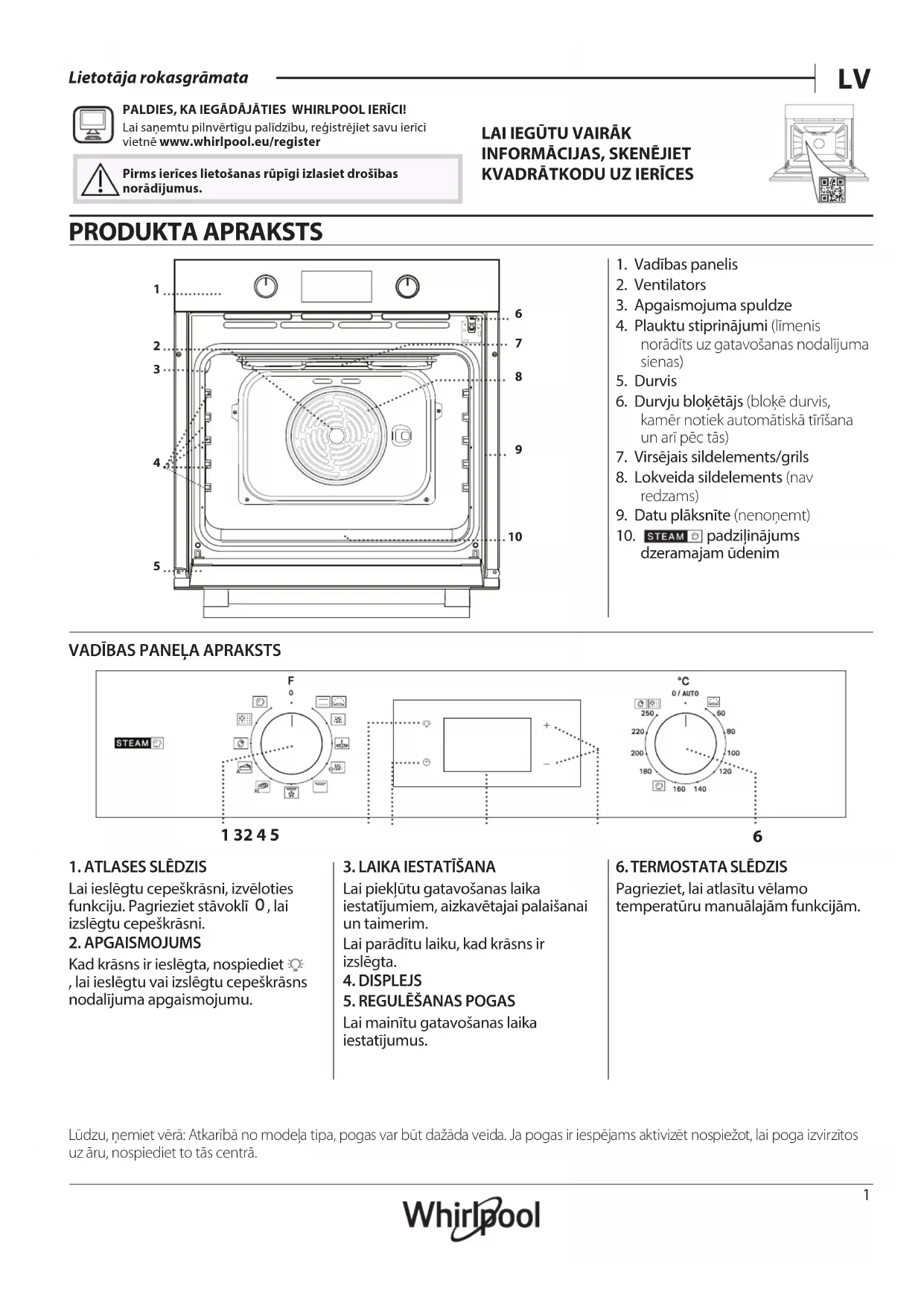 Lietotāja rokasgrāmata PALDIES, KA IEGĀDĀJĀTIES WHIRLPOOL IERĪCI!Lai saņemtu pilnvērtīgu palīdzību, reģistrējiet savu ierīci vietnē www . whirlpool . eu/ register