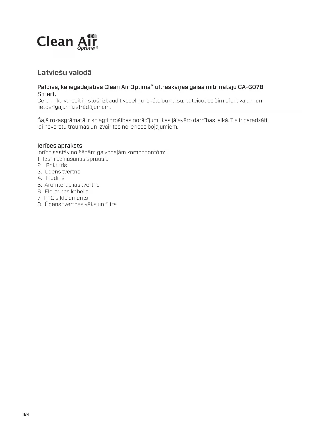 CA-607B Smart / Displejs184 Latviešu valodā Paldies, ka iegādājāties Clean Air Optima® ultraskaņas gaisa mitrinātāju CA-607B Smart. Ceram, ka varēsit ilgstoši izbaudīt veselīgu iekštelpu gaisu, pateicoties šim efektīvajam un lietderīgajam izstrādājumam. Šajā rokasgrāmatā ir sniegti drošības norādījumi, kas jāievēro darbības laikā. Tie ir paredzēti, lainovērstu traumas un izvairītos no ierīces bojājumiem. Ierīces apraksts Ierīce sastāv no šādām galvenajām komponentēm: