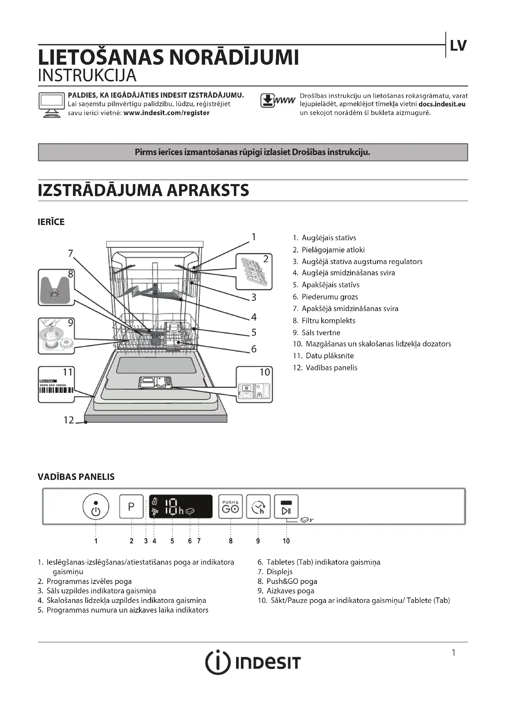 VADĪBAS PANELISPALDIES, KA IEGĀDĀJĀTIES INDESIT IZSTRĀDĀJUMU. Lai saņemtu pilnvērtīgu palīdzību, lūdzu, reģistrējiet savu ierīci vietnē: www.indesit.com/registerDrošības instrukciju un lietošanas rokasgrāmatu, varat lejupielādēt, apmeklējot tīmekļa vietni docs.indesit.eu un sekojot norādēm šī bukleta aizmugurē.1. Augšējais statīvs2. Pielāgojamie atloki3. Augšējā statīva augstuma regulators4. Augšējā smidzināšanas svira5. Apakšējais statīvs6. Piederumu grozs7. Apakšējā smidzināšanas svira8. Filtru komplekts9. Sāls tvertne10. Mazgāšanas un skalošanas līdzekļa dozators11. Datu plāksnīte12. Vadības panelis0000 000 00000 Service: