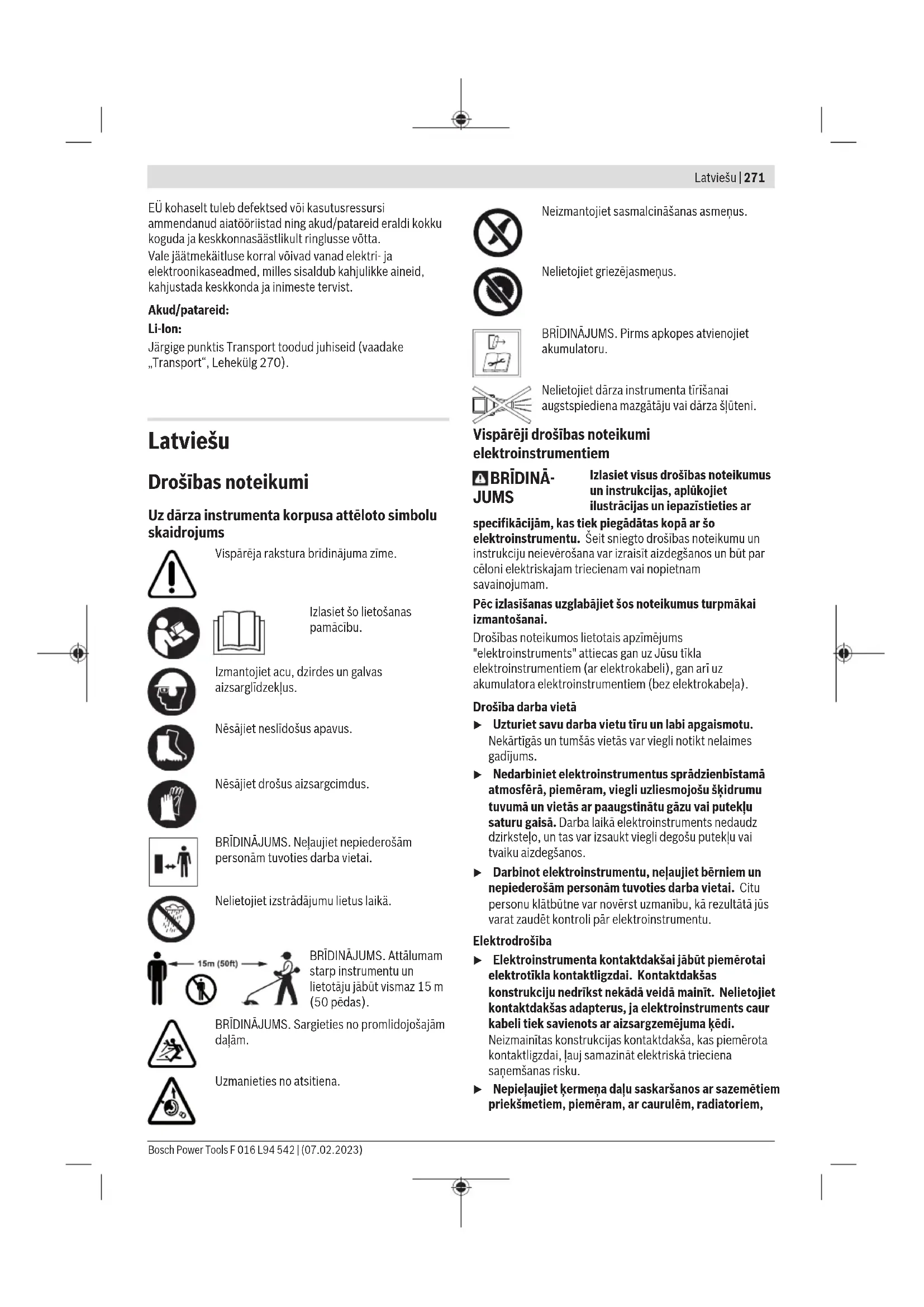 = 1,3 = 1,3 Norādītā(-s) radītā(-s) vibrācijas un trokšņa vērtība(-s) ir izmērīta(-s) saskaņā ar standartizētu pārbaužu metodi un var tikt izmantota(-s), lai savā starpā salīdzinātu elektroinstrumentus. Tās, ka norādīto kopējo vibrācijas vērtību un norādīto radītā trokšņa vērtību, var izmantot arī sākotnējai iedarbības izvērtēšanai. Tā kā elektroinstrumenta faktiskās lietošanas laikā radušās vibrācijas un trokšņa faktiskās vērtības ir atkarīgas no elektroinstrumenta lietošanas veida un jo īpaši no priekšmeta apstrādes veida un var atšķirties no norādītajām vērtībām, ir nepieciešams noteikt atbilstošus drošības pasākumus lietotāja aizsardzībai, pamatojoties uz vibrācijas iedarbības novērtējumu faktiskajos lietošanas apstākļos (pie tam jāņem vērā visas elektroinstrumenta darbības cikla daļas, piemēram, laika posmi, kad tas ir izslēgts, kā arī laika posmi, kad tas darbojas bez slodzes). Akumulators Bosch pārdod akumulatora elektriskos darbinstrumentus arī bez akumulatora. Tas, vai Jūsu elektriskā darbinstrumenta piegādes komplektācijā ir iekļauts akumulators, ir norādīts uz iesaiņojuma. Akumulatora uzlāde u Izmantojiet vienīgi tehniskajos datos norādītās uzlādes ierīces. Vienīgi šī uzlādes ierīce ir piemērota jūsu elektroinstrumentā izmantojamā litija-jonu akumulatora uzlādei. Norāde: atbilstoši starptautiskajiem kravu pārvadāšanas noteikumiem litija jonu akumulatori tiek piegādāti daļēji uzlādētā stāvoklī. Lai nodrošinātu pilnu akumulatora jaudu, pirms pirmās lietošanas reizes pilnībā uzlādējiet akumulatoru. Akumulatora ielikšana Ievietojiet uzlādēto akumulatoru akumulatora stiprinājumā, līdz tas tiek nofiksēts. Akumulatora izņemšana Lai izņemtu akumulatoru, nospiediet akumulatora atbrīvošanas taustiņu un izvelciet akumulatoru. Nedarbojieties ar spēku. Akumulatoram 2 ir divpakāpju fiksators, kas neļauj tam izkrist, kad nejauši nospiež akumulatora atbrīvošanas pogu. Kamēr akumulators ir ielikts elektroinstrumentā, to notur atspere. Akumulatora uzlādes pakāpes indikators Akumulatora uzlādes pakāpes indikatora zaļās LEDs diodes parāda akumulatora uzlādes pakāpi. Vadoties no drošības apsvērumiem, uzlādes pakāpe ir nolasāma tikai tad, ja elektroinstruments atrodas miera stāvoklī. Lai nolasītu akumulatora uzlādes pakāpi, nospiediet akumulatora uzlādes pakāpes nolasīšanas taustiņu vai . Tas iespējams arī tad, ja akumulators ir izņemts no elektroinstrumenta. Ja pēc akumulatora uzlādes pakāpes nolasīšanas taustiņa nospiešanas neiedegas neviena no uzlādes pakāpes indikatora LED diodēm, tas nozīmē, ka akumulators ir bojāts un to nepieciešams nomainīt. Akumulatora tips GBA 18V... LED Uzlādes līmenis Pastāvīgi deg 3zaļas LED diodes 60–100% Pastāvīgi deg 2zaļas LED diodes 30–60% Pastāvīgi deg 1zaļa LED diode 5–30% Mirgo 1zaļa LED diode 0–5% Akumulatora tips ProCORE18V... LED Uzlādes līmenis Pastāvīgi deg 5zaļas LED diodes 80–100% Pastāvīgi deg 4zaļas LED diodes 60–80% Pastāvīgi deg 3zaļas LED diodes 40–60% Pastāvīgi deg 2zaļas LED diodes 20–40% Pastāvīgi deg 1zaļa LED diode 5–20% Mirgo 1zaļa LED diode 0–5% Pareiza apiešanās ar akumulatoru Sargājiet akumulatoru no mitruma un ūdens. Uzglabājiet akumulatoru pie temperatūras no −20°C līdz 50°C. Neatstājiet akumulatoru karstumā, piemēram, vasaras laikā neatstājiet to automašīnā. Laiku pa laikam iztīriet akumulatora ventilācijas atvērumus ar mīkstu, tīru un sausu otu. Ja manāmi samazinās instrumenta darbības laiks starp akumulatora uzlādēm, tas norāda, ka akumulators ir nolietojies un to nepieciešams nomainīt. Bosch Power Tools F 016 L94 542 | (07.02.2023)278 | Latviešu Ievērojiet norādījumus par atbrīvošanos no nolietotajiem izstrādājumiem. Akumulatora apkope Lai nodrošinātu optimālu akumulatora izmantošanu, ievērojiet šādas norādes un veiciet šādas darbības: – Sargājiet akumulatoru no mitruma un ūdens. – Uzglabājiet elektroinstrumentu un akumulatoru tikai temperatūras amplitūdā no –20°C līdz 50°C. Vasaras periodā neatstājiet akumulatoru, piemēram, automašīnas salonā. – Uzglabājiet akumulatoru atsevišķi, nevis ievietotu dārza instrumentā. – Neatstājiet akumulatoru dārza instrumentā, ja tas ir pakļauts tiešai saules staru iedarbībai. – Optimālā temperatūra akumulatora uzglabāšanai ir 5°C. – Laiku pa laikam iztīriet akumulatora ventilācijas atvērumus ar mīkstu, tīru un sausu otu. Ja ievērojami samazinās dārza instrumenta darbības laiks starp divām akumulatora uzlādēm, tas liecina, ka akumulators ir nolietojies un to nepieciešams nomainīt. Montāža un lietošana Darbība un tās mērķis Attēls Lappuse Attēlotās sastāvdaļas