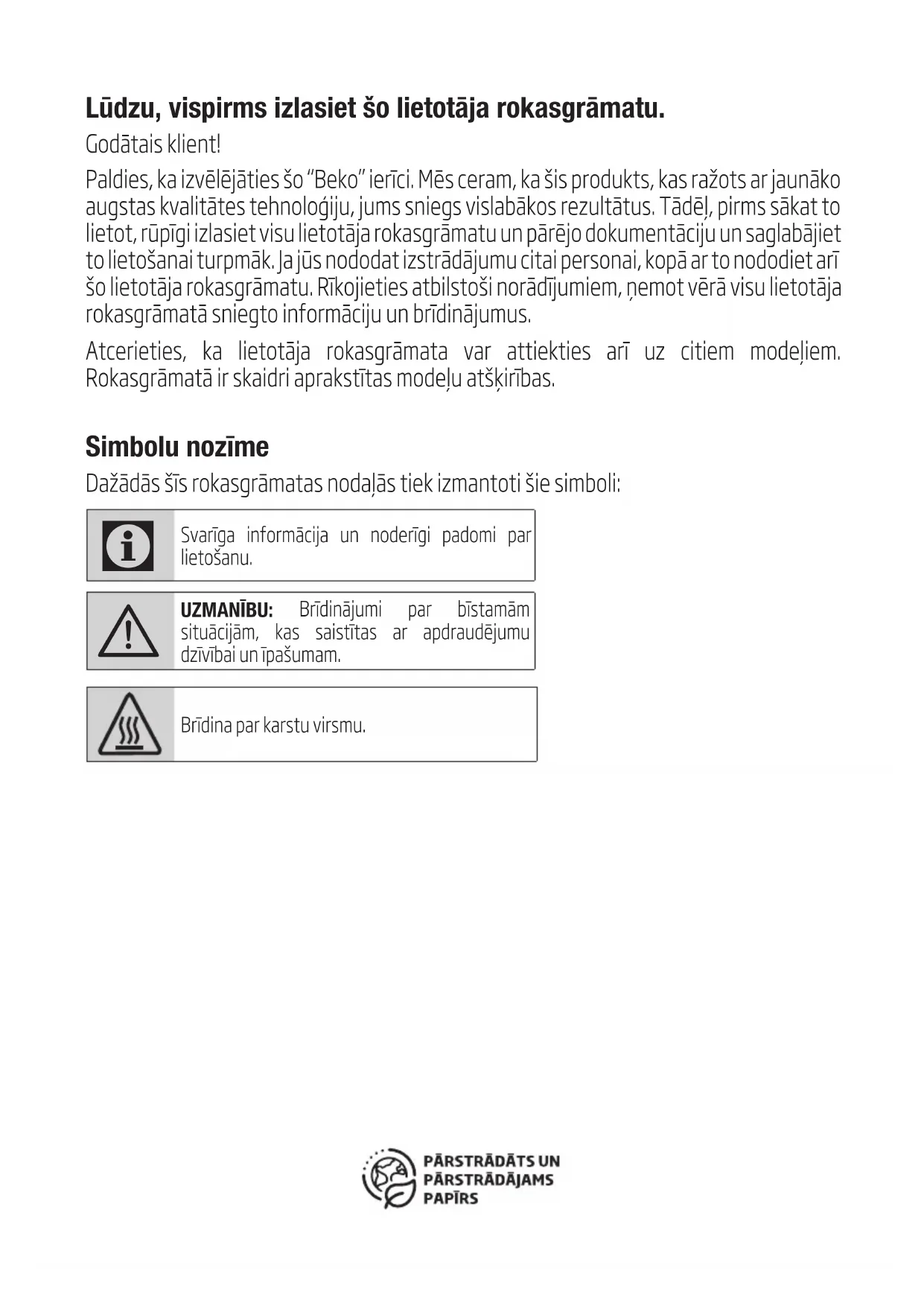 - Med rokovanjem in transportom nosite aparat v originalni embalaži. Embalaža aparata ščiti pred fizičnimi poškodbami. • Na aparat ali embalažo ne postavljajte težkih bremen. Aparat je lahko poškodovan. • Če aparat pade, bo nedelujoč ali povzročil trajno škodo.Lūdzu, vispirms izlasiet šo lietotāja rokasgrāmatu. Godātais klient! Paldies, ka izvēlējāties šo “Beko” ierīci. Mēs ceram, ka šis produkts, kas ražots ar jaunāko augstas kvalitātes tehnoloģiju, jums sniegs vislabākos rezultātus. Tādēļ, pirms sākat to lietot, rūpīgi izlasiet visu lietotāja rokasgrāmatu un pārējo dokumentāciju un saglabājiet to lietošanai turpmāk. Ja jūs nododat izstrādājumu citai personai, kopā ar to nododiet arī šo lietotāja rokasgrāmatu. Rīkojieties atbilstoši norādījumiem, ņemot vērā visu lietotāja rokasgrāmatā sniegto informāciju un brīdinājumus. Atcerieties, ka lietotāja rokasgrāmata var attiekties arī uz citiem modeļiem. Rokasgrāmatā ir skaidri aprakstītas modeļu atšķirības. Simbolu nozīme Dažādās šīs rokasgrāmatas nodaļās tiek izmantoti šie simboli: