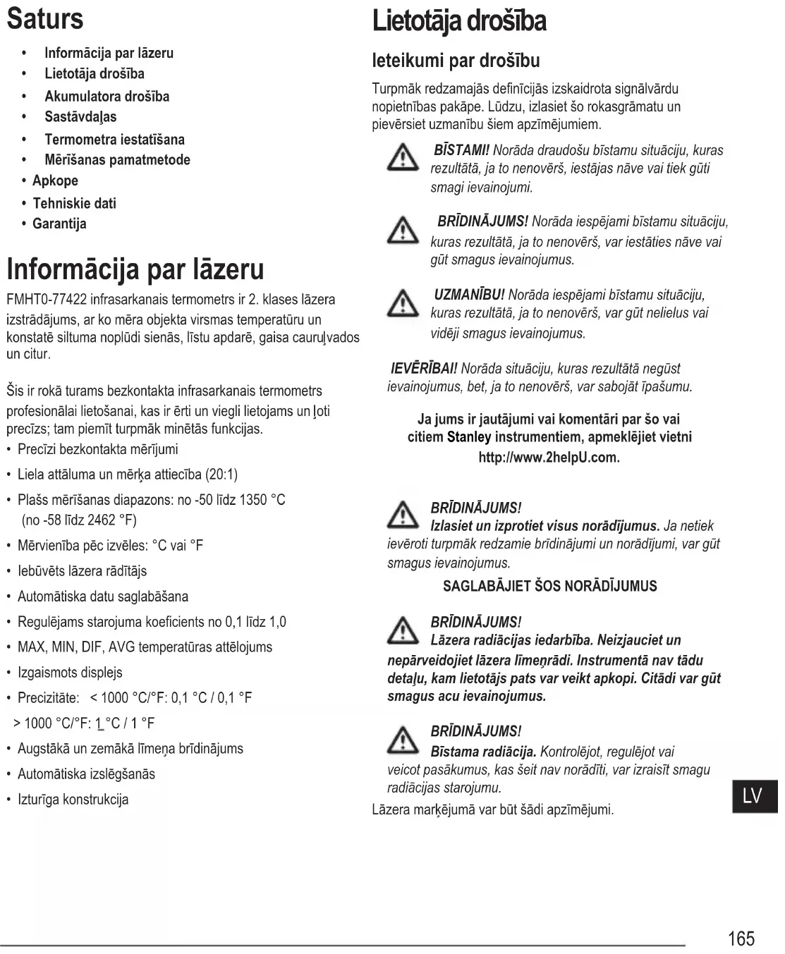 Šī garantija neattiecas uz defektiem, kas radušies negadījumu, nodiluma, nolietojuma un ražotāja lietošanas norādījumu neievērošanas dēļ, kā arī tādu remontu un pārveidojumu rezultātā, kas veikti bez Stanley atļaujas. Remonts vai aizstāšana ar jaunu izstrādājumu neietekmē šīs garantijas termiņu. Ciktāl to atļauj tiesību akti, saskaņā ar šo garantiju Stanley neatbild par netiešiem vai izrietošiem zaudējumiem, kas radušies šī izstrādājuma defektu dēļ. Šo garantiju nedrīkst grozīt bez Stanley atļaujas. Šī garantija nekavē šī izstrādājuma pircēju līgumiskās tiesības. Šī garantija tiek regulēta un ir sastādīta saskaņā ar tās valsts tiesību aktiem, kurā izstrādājums ir pārdots, kā rezultātā Stanley un pircējs neatsaucami piekrīt attiecīgās valsts tiesu piekritībai, ja ir iesniegta sūdzība vai ir jārisina jautājumi šīs garantijas dēļ vai saistībā ar šo garantiju. Garantija neattiecas uz kalibrēšanu un apkopi. PIEZĪME. Klients atbild par instrumenta pareizu lietošanu un apkopi. Turklāt klients pilnībā atbild par lāzera iekārtas precizitātes regulāru pārbaudi un tādējādi par instrumenta kalibrēšanu. Šiī rokasgrāmata var tikt mainīta bez iepriekšēja brīdinājuma.