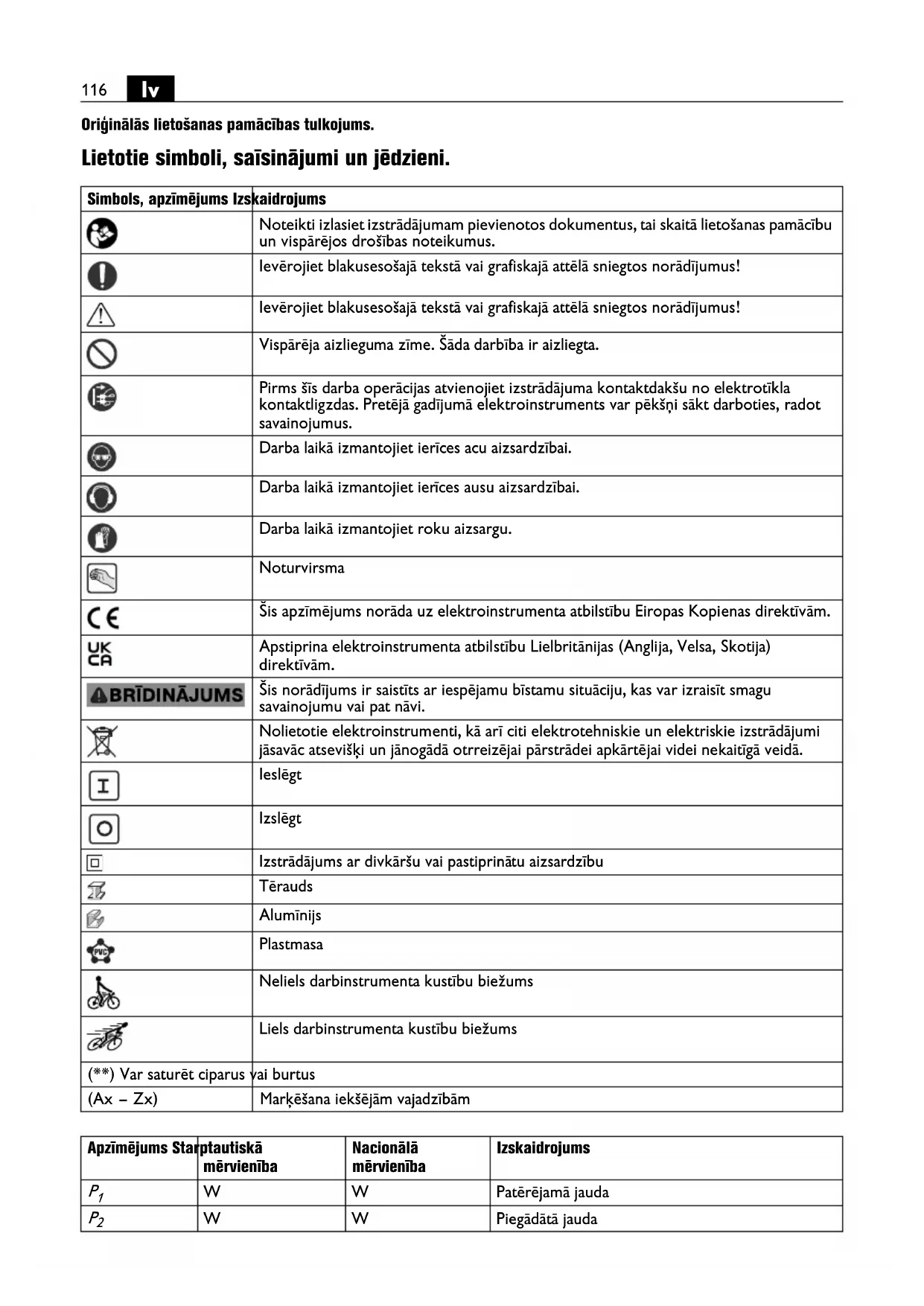 Oriģinālās lietošanas pamācības tulkojums. Lietotie simboli, saīsinājumi un jēdzieni. Simbols, apzīmējums Izskaidrojums Noteikti izlasiet izstrādājumam pievienotos dokumentus, tai skaitā lietošanas pamācību un vispārējos drošības noteikumus. Ievērojiet blakusesošajā tekstā vai grafiskajā attēlā sniegtos norādījumus! Ievērojiet blakusesošajā tekstā vai grafiskajā attēlā sniegtos norādījumus! Vispārēja aizlieguma zīme. Šāda darbība ir aizliegta. Pirms šīs darba operācijas atvienojiet izstrādājuma kontaktdakšu no elektrotīkla kontaktligzdas. Pretējā gadījumā elektroinstruments var pēkšņi sākt darboties, radot savainojumus. Darba laikā izmantojiet ierīces acu aizsardzībai. Darba laikā izmantojiet ier īces ausu aizsardzībai. Darba laikā izmantojiet roku aizsargu. Noturvirsma Šis apzīmējums norāda uz elektroinstrumenta atbilstību Eiropas Kopienas direktīvām. Apstiprina elektroinstrumenta atbilstību Lielbritānijas (Anglija, Velsa, Skotija) direktīvām. Šis norādījums ir saistīts ar iespējamu bīstamu situāciju, kas var izraisīt smagu savainojumu vai pat nāvi. Nolietotie elektroinstrumenti, kā arī citi elektrotehniskie un elektriskie izstrādājumi jāsavāc atsevišķi un jānogādā otrreizējai pārstrādei apkārtējai videi nekaitīgā veidā. Ieslēgt Izslēgt Izstrādājums ar divkāršu vai pastiprinā tu aizsardzību Tērauds Alumīnijs Plastmasa Neliels darbinstrumenta kustību biežums Liels darbinstrumenta kustību biežums (**) Var saturēt ciparus vai burtus (Ax – Zx) Marķēšana iekšējām vajadzībām Apzīmējums Starptautiskā mērvienība Nacionālā mērvienība Izskaidrojums