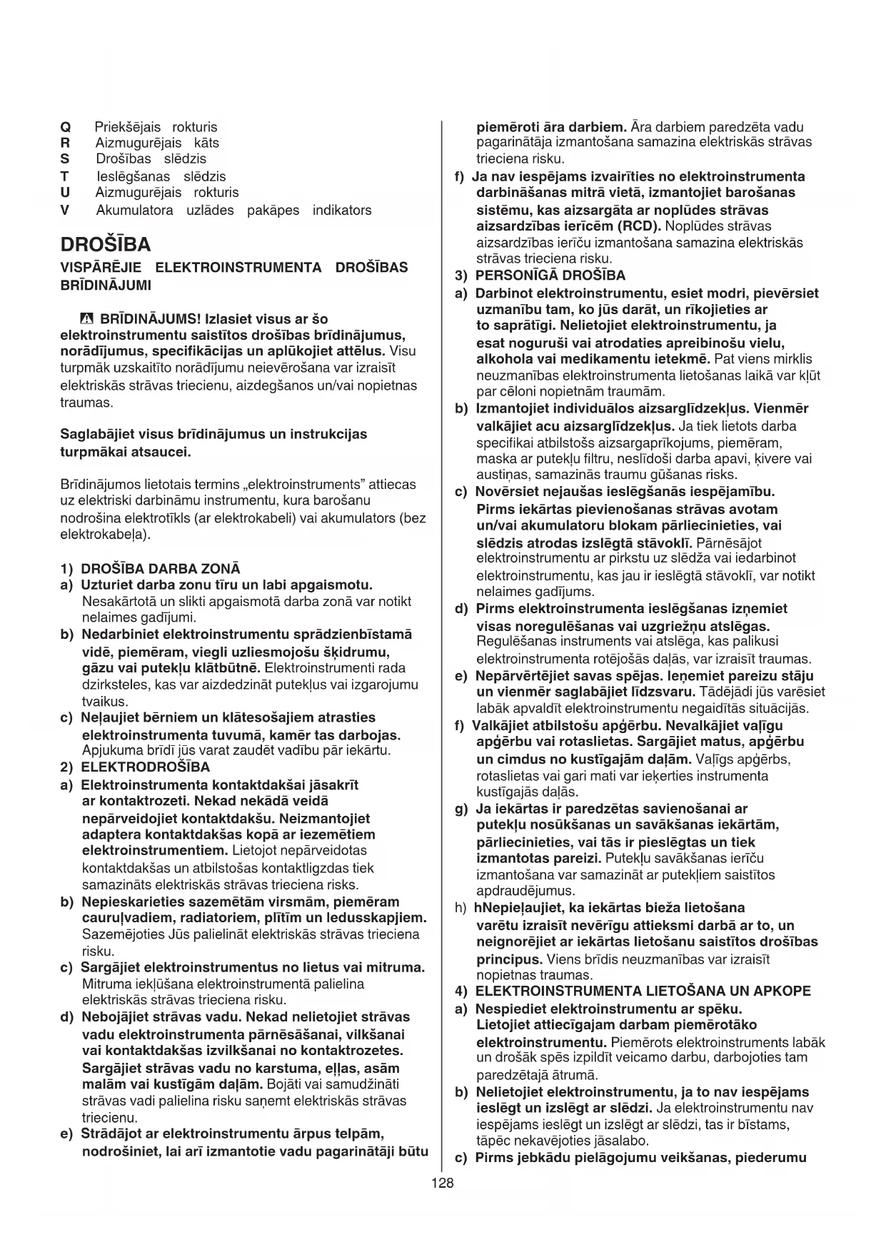 a) Nespiediet elektroinstrumentu ar spēku. Lietojiet attiecīgajam darbam piemērotāko elektroinstrumentu. Piemērots elektroinstruments labāk un drošāk spēs izpildīt veicamo darbu, darbojoties tam paredzētajā ātrumā. b) Nelietojiet elektroinstrumentu, ja to nav iespējams ieslēgt un izslēgt ar slēdzi. Ja elektroinstrumentu nav iespējams ieslēgt un izslēgt ar slēdzi, tas ir bīstams, tāpēc nekavējoties jāsalabo. c) Pirms jebkādu pielāgojumu veikšanas, piederumu Q Priekšējais rokturis R Aizmugurējais kāts S Drošības slēdzis T Ieslēgšanas slēdzis U Aizmugurējais rokturis V Akumulatora uzlādes pakāpes indikators DROŠĪBA