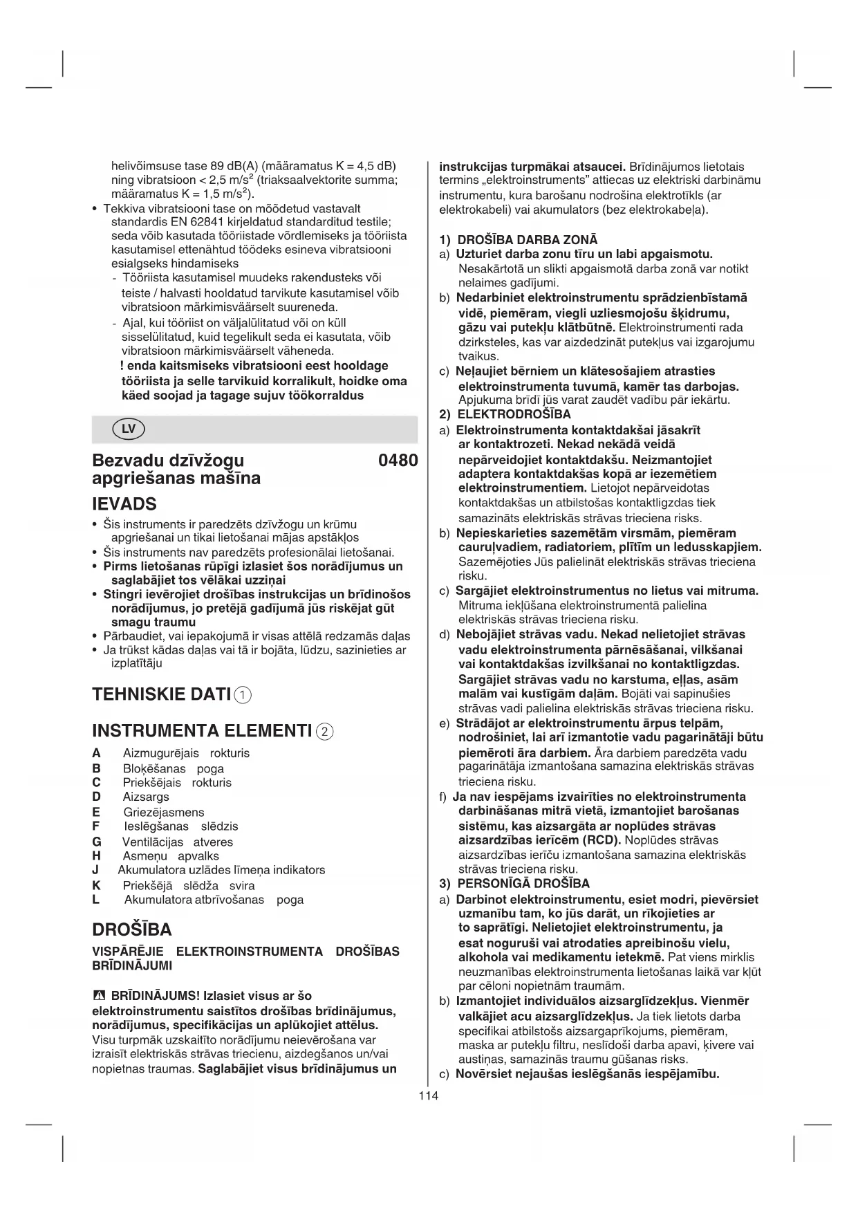 - BRĪDINĀJUMS! Izlasiet visus ar šo elektroinstrumentu saistītos drošības brīdinājumus, norādījumus, specikācijas un aplūkojiet attēlus. Visu turpmāk uzskaitīto norādījumu neievērošana var izraisīt elektriskās strāvas triecienu, aizdegšanos un/vai nopietnas traumas. Saglabājiet visus brīdinājumus un115 elementus atbilstoši šiem norādījumiem, ņemot vērā darba apstākļus un veicamo uzdevumu. Elektroinstrumenta lietošana neparedzētiem mērķiem var radīt bīstamu situāciju. f) Rokturiem un satveršanas daļām jābūt sausiem, tīriem un uz tiem nedrīkst būt eļļa vai smērviela. Ja rokturi un satveršanas daļas ir mitras, tās slīdēs, un ar instrumentu vairs nebūs droši strādāt, kā arī apvaldīt neparedzētu apstākļu gadījumos.