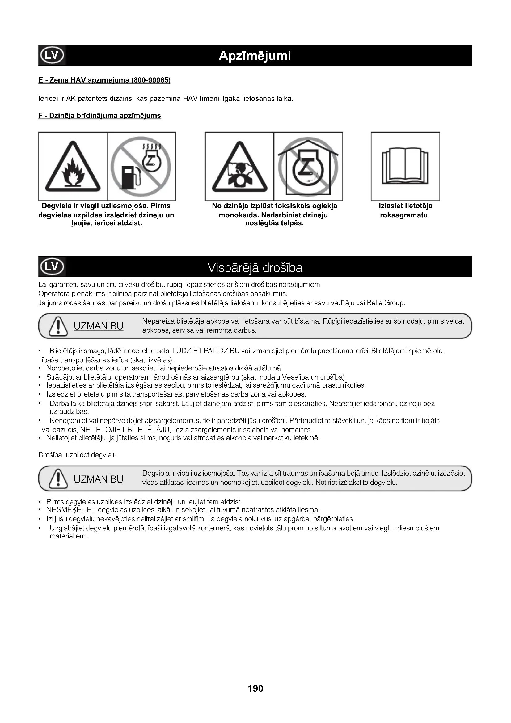 - Uzglabājiet degvielu piemērotā, īpaši izgatavotā konteinerā, kas novietots tālu prom no siltuma avotiem vai viegli uzliesmojošiem materiāliem. E - Zema HAV apz½m¾jums (800-99965) Ier¢cei ir AK patent¡ts dizains, kas pazemina HAV l¢meni ilg£k£ lietošanas laik£. F - Dzin¾ja br½dinjuma apz½m¾jums Apz½m¾jumi Izlasiet lietotja rokasgrmatu. Degviela ir viegli uzliesmojoša. Pirms degvielas uzpildes izsl¾dziet dzin¾ju un ¿aujiet ier½cei atdzist. No dzin¾ja izplÂst toksiskais oglek¿a monoks½ds. Nedarbiniet dzin¾ju nosl¾gts telps. LV191 Veselība un drošība