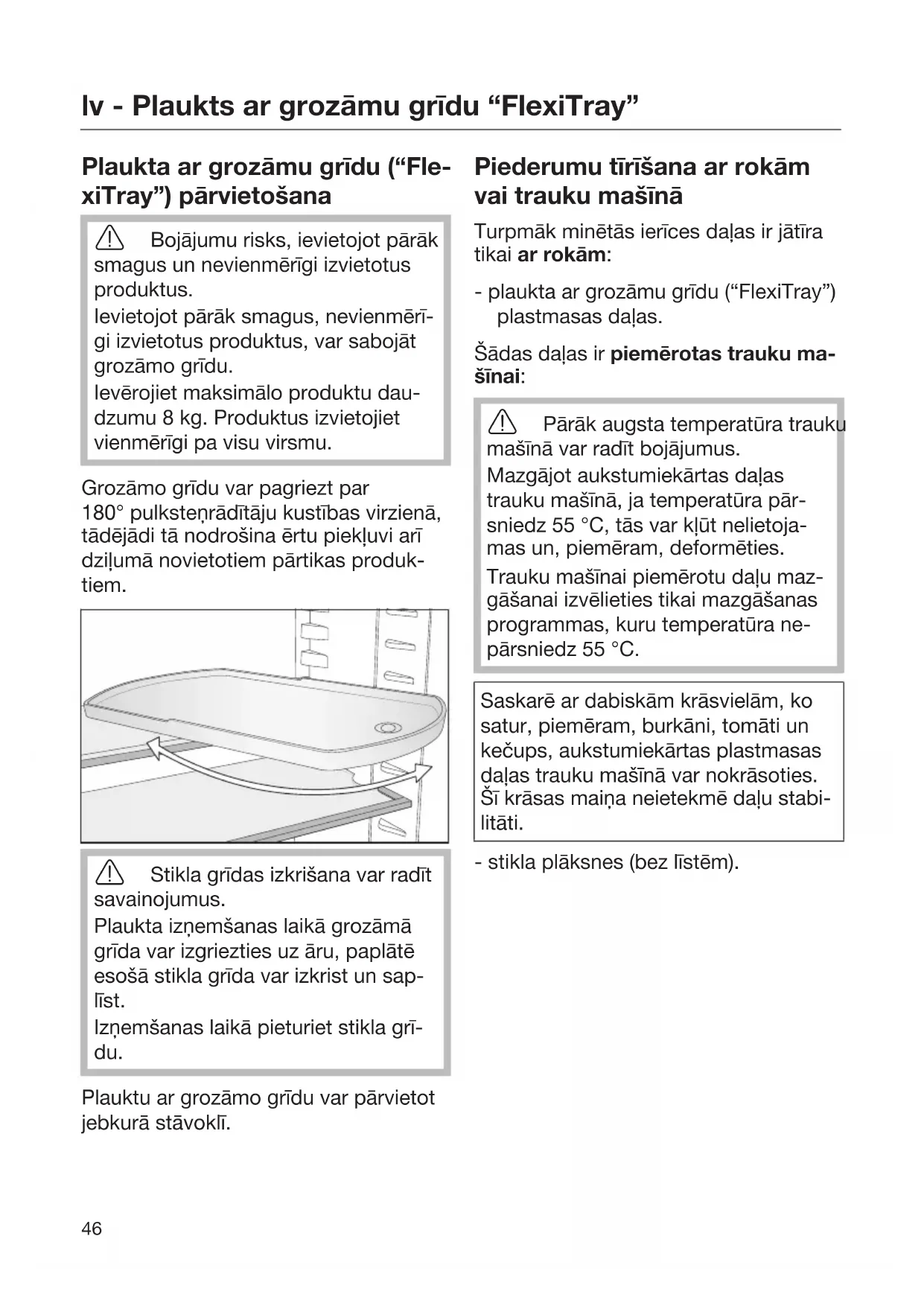 Plaukta ar grozāmu grīdu (“Fle- xiTray”) pārvietošana Bojājumu risks, ievietojot pārāk smagus un nevienmērīgi izvietotus produktus. Ievietojot pārāk smagus, nevienmērī- gi izvietotus produktus, var sabojāt grozāmo grīdu. Ievērojiet maksimālo produktu dau- dzumu 8kg. Produktus izvietojiet vienmērīgi pa visu virsmu. Grozāmo grīdu var pagriezt par 180°pulksteņrādītāju kustības virzienā, tādējādi tā nodrošina ērtu piekļuvi arī dziļumā novietotiem pārtikas produk- tiem. Stikla grīdas izkrišana var radīt savainojumus. Plaukta izņemšanas laikā grozāmā grīda var izgriezties uz āru, paplātē esošā stikla grīda var izkrist un sap- līst. Izņemšanas laikā pieturiet stikla grī- du. Plauktu ar grozāmo grīdu var pārvietot jebkurā stāvoklī. Piederumu tīrīšana ar rokām vai trauku mašīnā Turpmāk minētās ierīces daļas ir jātīra tikai ar rokām: - plaukta ar grozāmu grīdu (“FlexiTray”) plastmasas daļas. Šādas daļas ir piemērotas trauku ma- šīnai: Pārāk augsta temperatūra trauku mašīnā var radīt bojājumus. Mazgājot aukstumiekārtas daļas trauku mašīnā, ja temperatūra pār- sniedz 55°C, tās var kļūt nelietoja- mas un, piemēram, deformēties. Trauku mašīnai piemērotu daļu maz- gāšanai izvēlieties tikai mazgāšanas programmas, kuru temperatūra ne- pārsniedz 55°C. Saskarē ar dabiskām krāsvielām, ko satur, piemēram, burkāni, tomāti un kečups, aukstumiekārtas plastmasas daļas trauku mašīnā var nokrāsoties. Šī krāsas maiņa neietekmē daļu stabi- litāti. - stikla plāksnes (bez līstēm).lv - Plaukts ar grozāmu grīdu “FlexiTray”