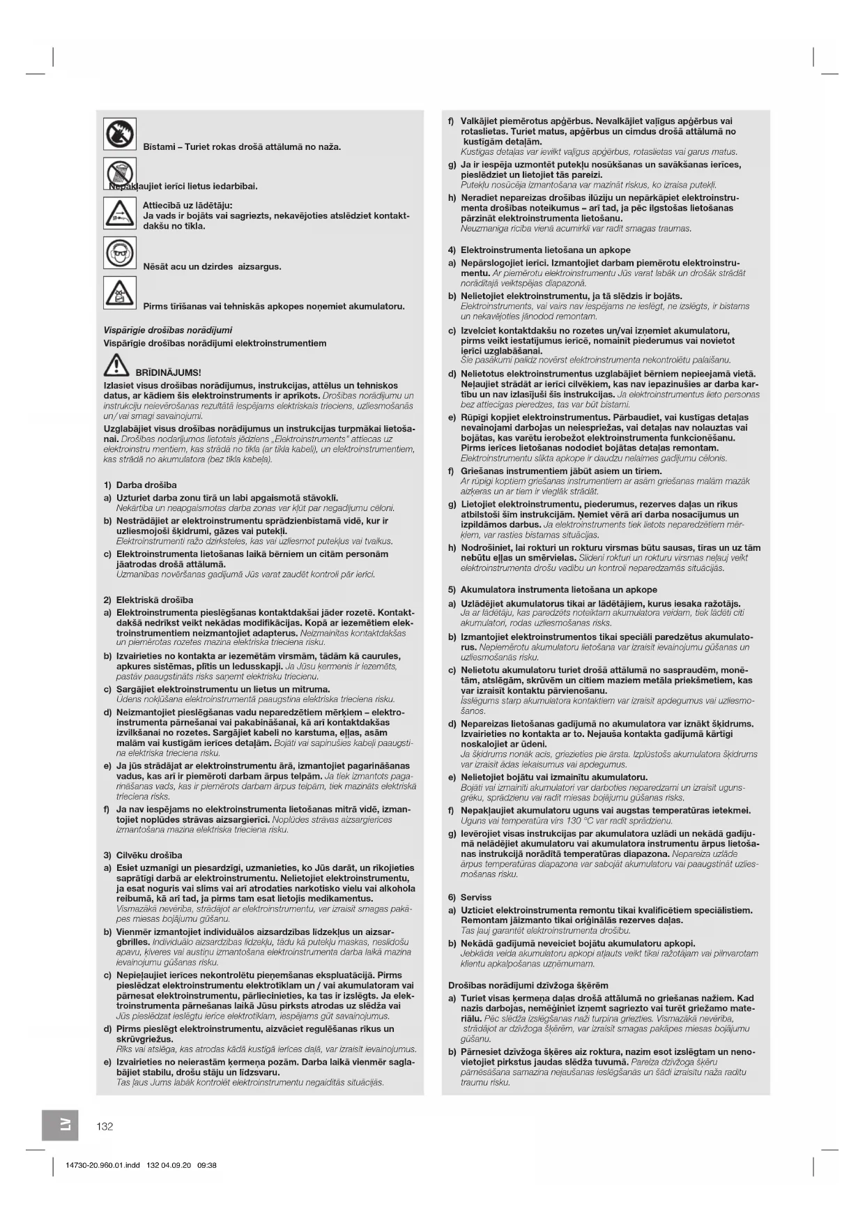 Pirms tīrīšanas vai tehniskās apkopes noņemiet akumulatoru. Vispārīgie drošības norādījumi Vispārīgie drošības norādījumi elektroinstrumentiem BRĪDINĀJUMS! Izlasiet visus drošības norādījumus, instrukcijas, attēlus un tehniskos datus, ar kādiem šis elektroinstruments ir aprīkots. Drošības norādījumu un instrukciju neievērošanas rezultātā iespējams elektriskais trieciens, uzliesmošanās un / vai smagi savainojumi. Uzglabājiet visus drošības norādījumus un instrukcijas turpmākai lietoša- nai. Drošības nodarījumos lietotais jēdziens „Elektroinstruments“ attiecas uz elektroinstru mentiem, kas strādā no tīkla (ar tīkla kabeli), un elektroinstrumentiem, kas strādā no akumulatora (bez tīkla kabeļa).