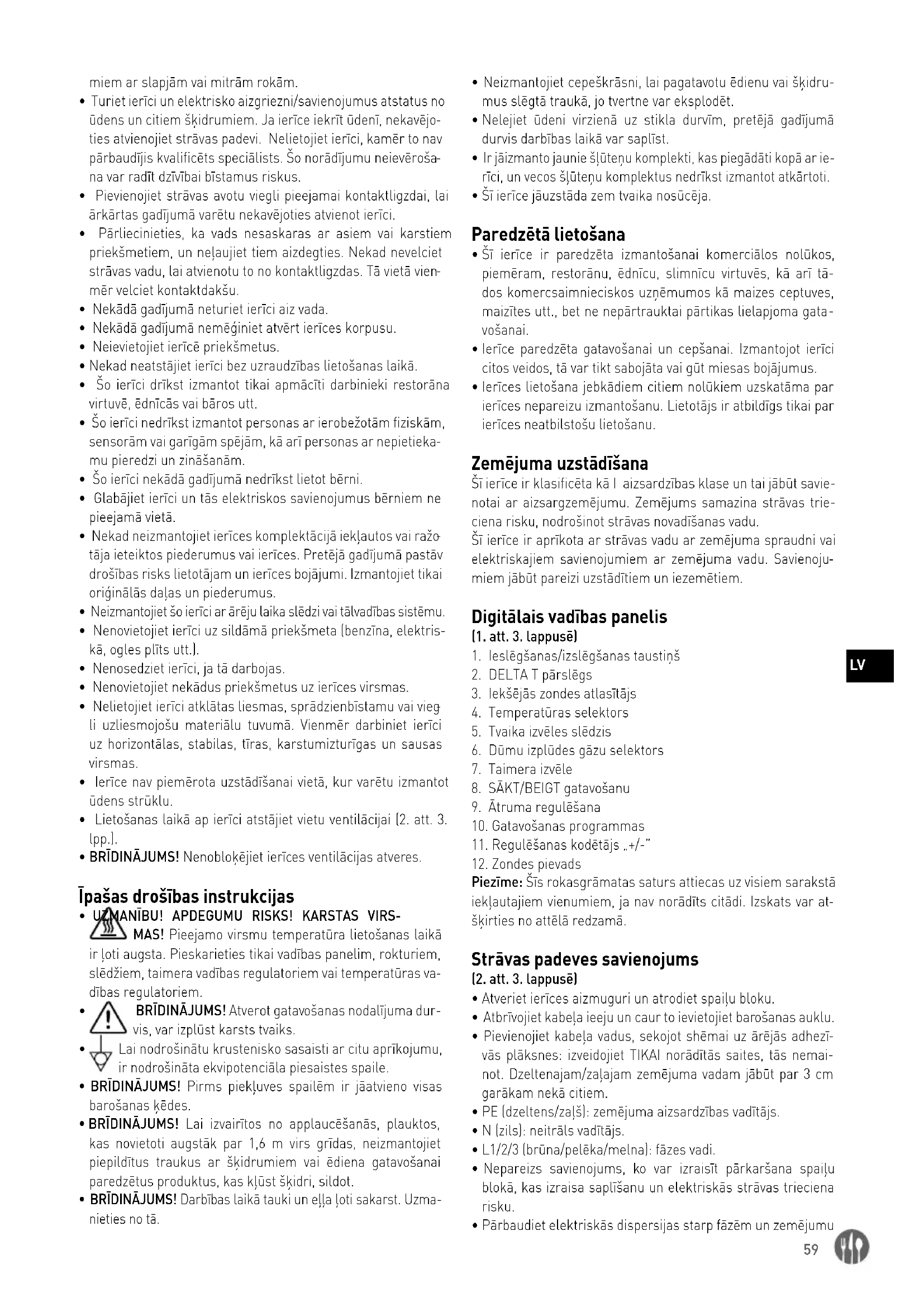 - UZMANĪBU! APDEGUMU RISKS! KARSTAS VIRS- MAS! Pieejamo virsmu temperatūra lietošanas laikā ir ļoti augsta. Pieskarieties tikai vadības panelim, rokturiem, slēdžiem, taimera vadības regulatoriem vai temperatūras va