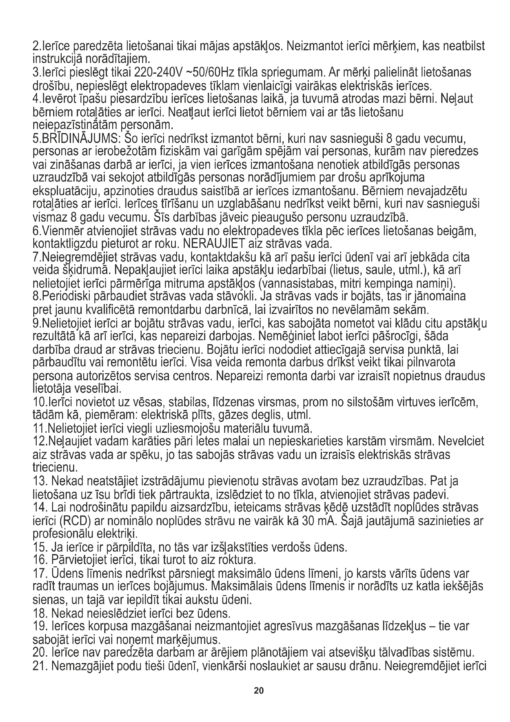 TECHNINIAI DUOMENYS: Vandens virinimo talpa: 1,0L Bendras tūris: 1,9L Įtampa: 220-240V ~50-60Hz Galia: 780-900W Rūpinantis aplinka. Kartono pakuotes atiduoti į makulatūrą. Polietileno (PE) maišelius mesti į plastikui skirtą konteinerį. Susidėvėjusį prietaisą atiduoti į atitinkamą atliekų surinkimo vietą, nes prietaise esančios pavojingos medžiagos gali kelti grėsmę aplinkai. Elektrinį prietaisą atiduoti tokį, kad nebūtų galima jo pakartotinai naudoti ir panaudoti. Jeigu prietaise yra baterijos, būtina jas išimti ir atskirai atiduoti į atliekų surinkimo vietą. Nemesti prietaiso į buitinių atliekų konteinerį! LATVIEŠU VISPĀRĪGI DROŠĪBAS NOTEIKUMI SVARĪGI DROŠAS IZMANTOŠANAS NORĀDĪJUMI. LŪDZU, UZMANĪGI IZLASIET UN SAGLABĀJIET Ja ierīce tiek izmantota komerciāliem nolūkiem, garantijas nosacījumi mainās. 1.Pirms ierīces lietošanas, uzmanīgi izlasīt lietošanas instrukciju un rīkoties saskaņā ar tās norādījumiem. Ražotājs nenes atbildību par bojājumiem, kas radušies ierīces nepareizas vai citādi neatbilstošas lietošanas rezultātā.20 2.Ierīce paredzēta lietošanai tikai mājas apstākļos. Neizmantot ierīci mērķiem, kas neatbilst instrukcijā norādītajiem. 3.Ierīci pieslēgt tikai 220-240V ~50/60Hz tīkla spriegumam. Ar mērķi palielināt lietošanas drošību, nepieslēgt elektropadeves tīklam vienlaicīgi vairākas elektriskās ierīces. 4.Ievērot īpašu piesardzību ierīces lietošanas laikā, ja tuvumā atrodas mazi bērni. Neļaut bērniem rotaļāties ar ierīci. Neatļaut ierīci lietot bērniem vai ar tās lietošanu neiepazīstinātām personām. 5.BRĪDINĀJUMS: Šo ierīci nedrīkst izmantot bērni, kuri nav sasnieguši 8 gadu vecumu, personas ar ierobežotām fiziskām vai garīgām spējām vai personas, kurām nav pieredzes vai zināšanas darbā ar ierīci, ja vien ierīces izmantošana nenotiek atbildīgās personas uzraudzībā vai sekojot atbildīgās personas norādījumiem par drošu aprīkojuma ekspluatāciju, apzinoties draudus saistībā ar ierīces izmantošanu. Bērniem nevajadzētu rotaļāties ar ierīci. Ierīces tīrīšanu un uzglabāšanu nedrīkst veikt bērni, kuri nav sasnieguši vismaz 8 gadu vecumu. Šīs darbības jāveic pieaugušo personu uzraudzībā. 6.Vienmēr atvienojiet strāvas vadu no elektropadeves tīkla pēc ierīces lietošanas beigām, kontaktligzdu pieturot ar roku. NERAUJIET aiz strāvas vada. 7.Neiegremdējiet strāvas vadu, kontaktdakšu kā arī pašu ierīci ūdenī vai arī jebkāda cita veida šķidrumā. Nepakļaujiet ierīci laika apstākļu iedarbībai (lietus, saule, utml.), kā arī nelietojiet ierīci pārmērīga mitruma apstākļos (vannasistabas, mitri kempinga namiņi). 8.Periodiski pārbaudiet strāvas vada stāvokli. Ja strāvas vads ir bojāts, tas ir jānomaina pret jaunu kvalificētā remontdarbu darbnīcā, lai izvairītos no nevēlamām sekām. 9.Nelietojiet ierīci ar bojātu strāvas vadu, ierīci, kas sabojāta nometot vai klādu citu apstākļu rezultātā kā arī ierīci, kas nepareizi darbojas. Nemēģiniet labot ierīci pāšrocīgi, šāda darbība draud ar strāvas triecienu. Bojātu ierīci nododiet attiecīgajā servisa punktā, lai pārbaudītu vai remontētu ierīci. Visa veida remonta darbus drīkst veikt tikai pilnvarota persona autorizētos servisa centros. Nepareizi remonta darbi var izraisīt nopietnus draudus lietotāja veselībai. 10.Ierīci novietot uz vēsas, stabilas, līdzenas virsmas, prom no silstošām virtuves ierīcēm, tādām kā, piemēram: elektriskā plīts, gāzes deglis, utml. 11.Nelietojiet ierīci viegli uzliesmojošu materiālu tuvumā. 12.Neļaujiet vadam karāties pāri letes malai un nepieskarieties karstām virsmām. Nevelciet aiz strāvas vada ar spēku, jo tas sabojās strāvas vadu un izraisīs elektriskās strāvas triecienu.
