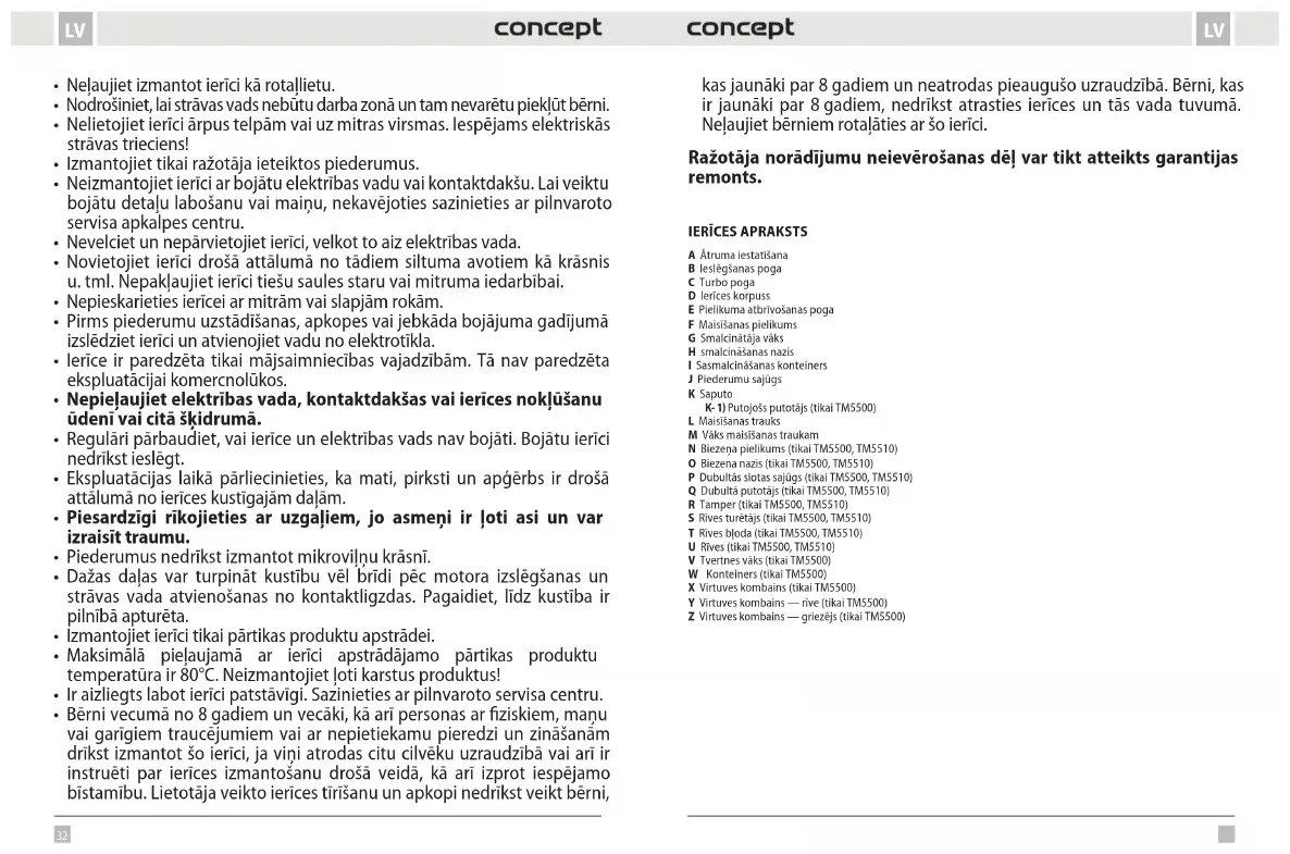 - Polietilēna (PE) maisiņus nododiet otrreizējai pārstrādei paredzēto materiālu savākšanas punktā. Ierīces otrreizējā pārstrāde tās kalpošanas laika beigās Šī ierīce ir marķēta saskaņā ar Eiropas Parlamenta un Padomes Direktīvu 2012/19/ES par elektrisko un elektronisko iekārtu atkritumiem (EEIA). Simbols uz izstrādājuma vai tā iepakojuma norāda, ka šis izstrādājums nepieder sadzīves atkritumiem. Tas jānogādā elektrisko un elektronisko iekārtu otrreizējās pārstrādes savākšanas punktā. Nodrošinot šā izstrādājuma pareizu iznīcināšanu, tiks novērsta nelabvēlīga ietekme uz vidi un cilvēku veselību, ko var izraisīt nepareiza ierīces iznīcināšana. Iznīcināšana jāveic saskaņā ar noteikumiem par atkritumu apstrādi. Lai iegūtu papildu informāciju par šīs ierīces otrreizēju pārstrādi, lūdzu, sazinieties ar vietējās pašvaldības sadzīves atkritumu iznīcināšanas dienestu vai veikalu, kurā iegādājāties izstrādājumu. Šis izstrādājums atbilst visām piemērojamo ES direktīvu pamatprasībām. Izmaiņas tekstā, konstrukcijā un tehniskajās specifikācijās var tikt veiktas bez iepriekšēja brīdinājuma, un mēs paturam tiesības veikt šīs izmaiņas.38 39 ENEN ACKNOWLEDGMENT Thank you for purchasing a Concept product. We wish you much joy with your new appliance every day you use it. Please read the instruction manual carefully before initial use. To refer to this manual any time you need to, we recommend you to keep it in a safe place. And please pass it to any future owner of the appliance. Technical specifications Voltage 220–240 V ~ 50 Hz Input 1500 W Continuous operating time with a stick attachment 1 min with a chopping attachment 10 s with a whisk attachment 2 min with a purée attachment 1 min with a double whisk 2 min with a food processor 15 s Noise ≤75 dB (A) The declared noise levels represent the A-level acoustic power, with respect to a reference acoustic power of 1 pW.