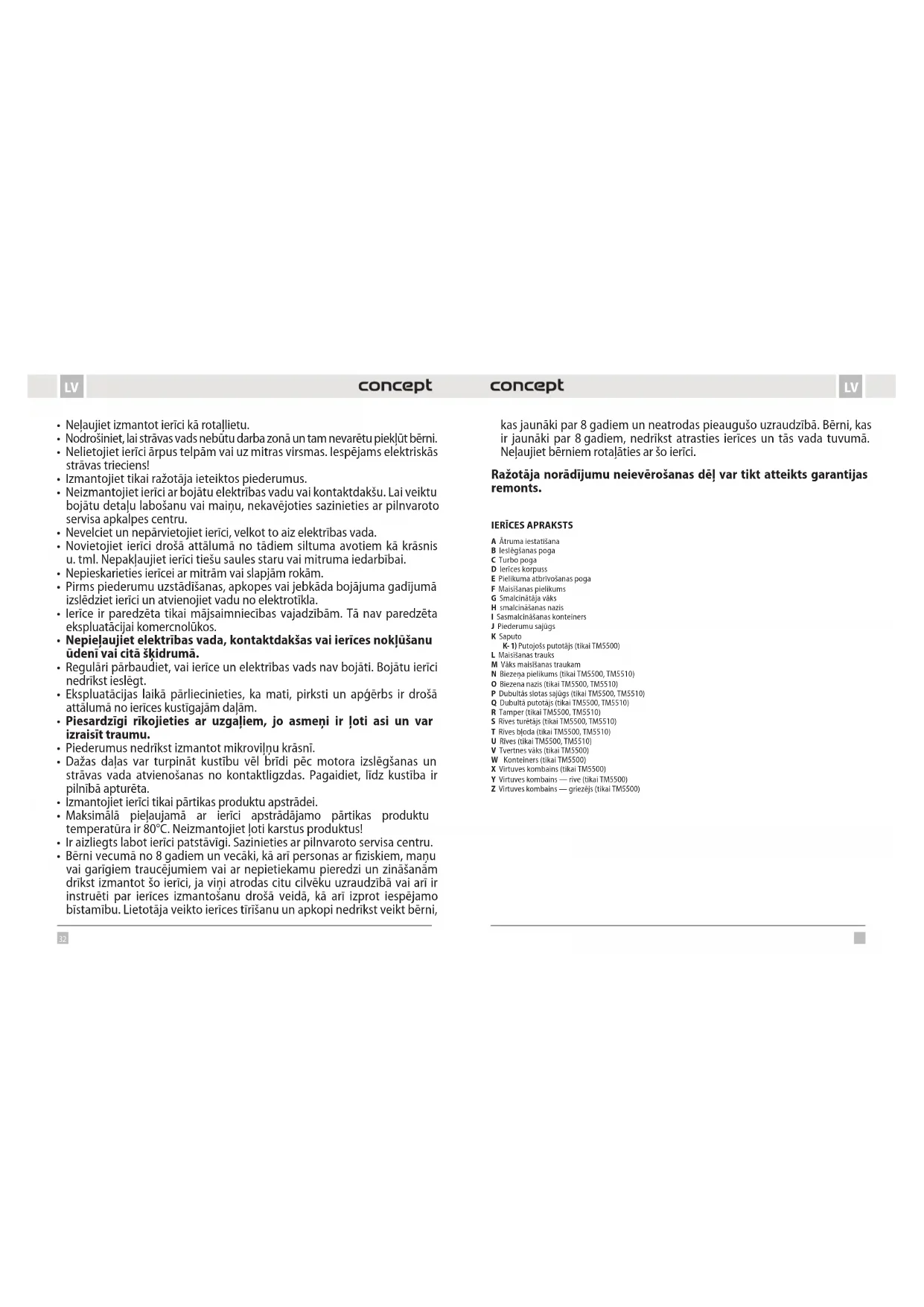 A Ātruma iestatīšana B Ieslēgšanas poga C Turbo poga D Ierīces korpuss E Pielikuma atbrīvošanas poga F Maisīšanas pielikums G Smalcinātāja vāks H smalcināšanas nazis I Sasmalcināšanas konteiners J Piederumu sajūgs K Saputo K- 1) Putojošs putotājs (tikai TM5500) L Maisīšanas trauks M Vāks maisīšanas traukam N Biezeņa pielikums (tikai TM5500, TM5510) O Biezena nazis (tikai TM5500, TM5510) P Dubultās slotas sajūgs (tikai TM5500, TM5510) Q Dubultā putotājs (tikai TM5500, TM5510) R Tamper (tikai TM5500, TM5510) S Rīves turētājs (tikai TM5500, TM5510) T Rīves bļoda (tikai TM5500, TM5510) U Rīves (tikai TM5500, TM5510) V Tvertnes vāks (tikai TM5500) W Konteiners (tikai TM5500) X Virtuves kombains (tikai TM5500) Y Virtuves kombains — rīve (tikai TM5500) Z Virtuves kombains — griezējs (tikai TM5500)34 35 LVLV