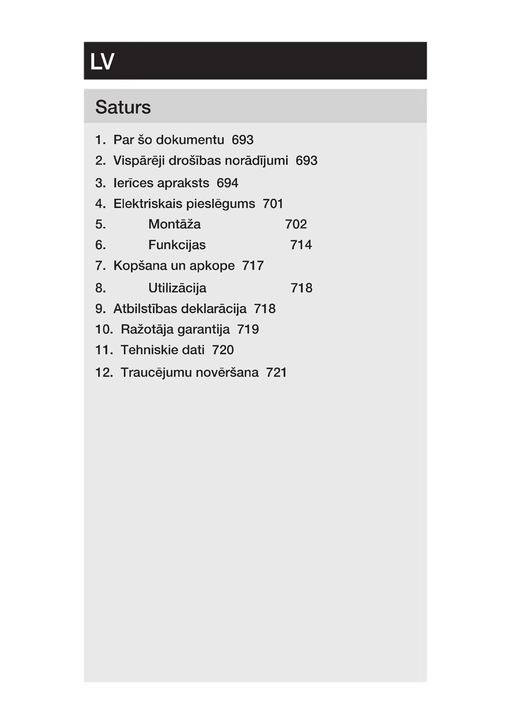 - Uzglabājiet pieejamā vietā. – Darbošanās ar elektrisko strāvu var izraisīt bīstamas si- tuācijas. Pieskaršanās strāvu vadošām daļām var izraisīt šoku, apdegumus vai nāvi. – Darbu ar elektrotīkla spriegumu jāveic profesionāli kvalificētam personālam. – Jāievēro vietējo instalēšanas un pieslēgšanas tehnisko priekšrakstu prasības (piem., D: VDE 0100, A: ÖVE-ÖNORM E8001-1, CH: SEV 1000). – Izmantojiet tikai oriģinālās detaļas. – Remontu drīkst veikt tikai specializētas darbnīcas.– 694 – Saturs