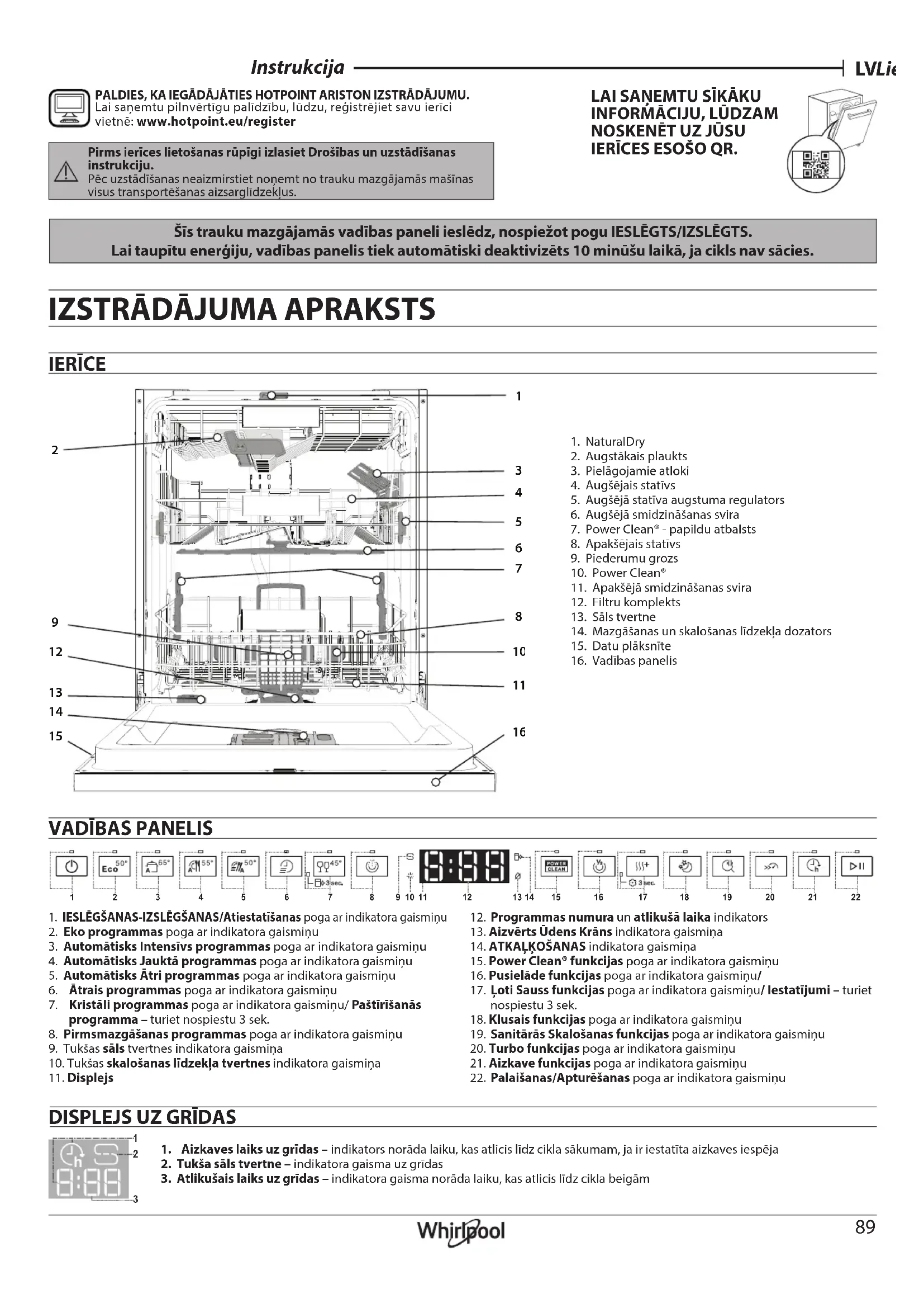 IERĪCES ESOŠO QR. PALDIES, KA IEGĀDĀJĀTIES HOTPOINT ARISTON IZSTRĀDĀJUMU. Lai saņemtu pilnvērtīgu palīdzību, lūdzu, reģistrējiet savu ierīci vietnē: www.hotpoint.eu/register1. IESLĒGŠANAS-IZSLĒGŠANAS/Atiestatīšanas poga ar indikatora gaismiņu2. Eko programmas poga ar indikatora gaismiņu3. Automātisks Intensīvs programmas poga ar indikatora gaismiņu4. Automātisks Jauktā programmas poga ar indikatora gaismiņu5. Automātisks Ātri programmas poga ar indikatora gaismiņu