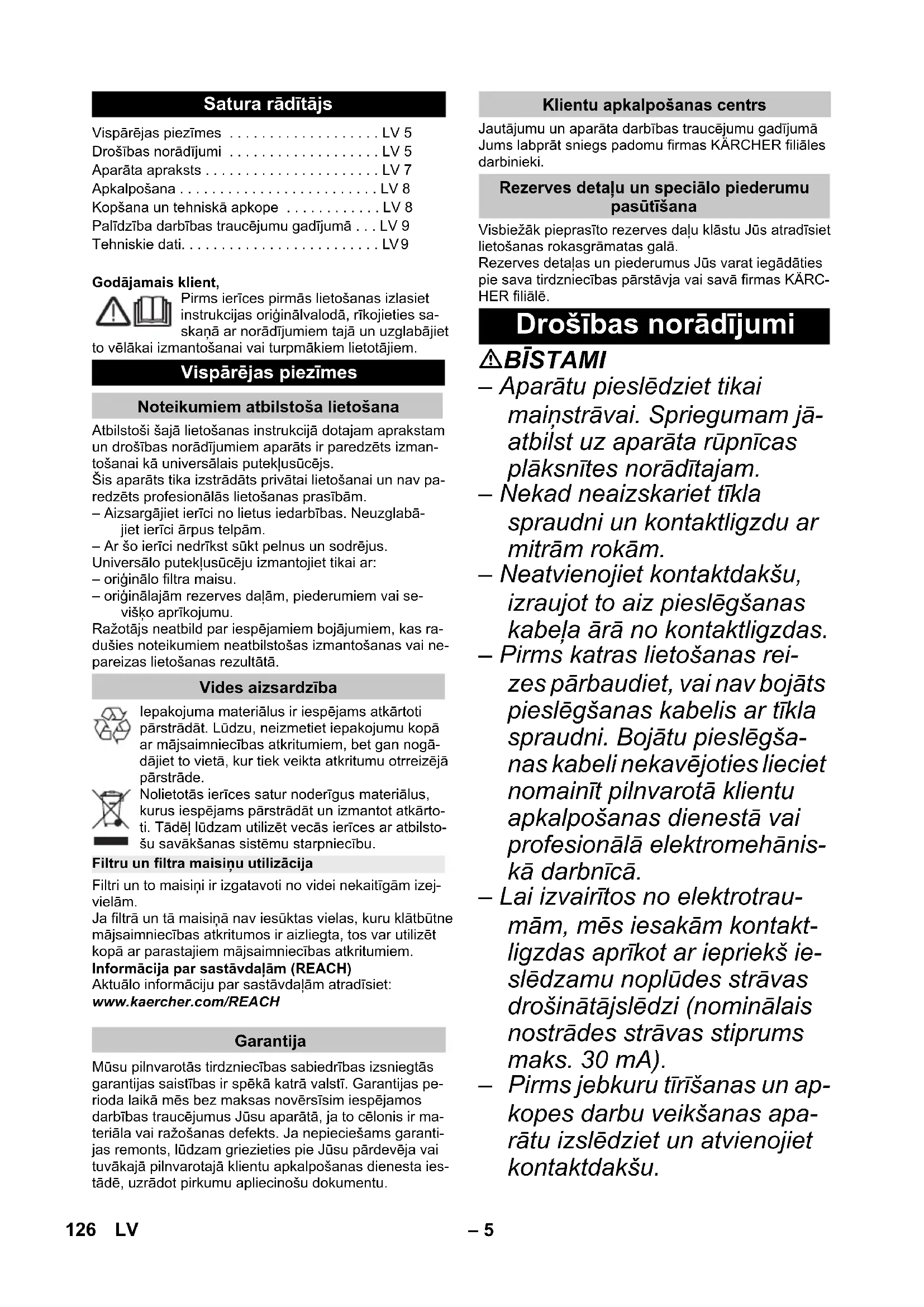 ām, mēs iesakām kontakt- ligzdas aprīkot ar iepriekš ie- slēdzamu noplūdes strāvas drošinātājslēdzi (nominālais nostrādes strāvas stiprums maks. 30 mA). – Pirms jebkuru tīrīšanas un ap- kopes darbu veikšanas apa- rātu izslēdziet un atvienojiet kontaktdakšu. Satura rādītājs Vispārējas piezīmes . . . . . . . . . . . . . . . . . . . LV 5 Drošības norādījumi . . . . . . . . . . . . . . . . . . . LV 5 Aparāta apraksts . . . . . . . . . . . . . . . . . . . . . . LV 7 Apkalpošana . . . . . . . . . . . . . . . . . . . . . . . . . LV 8 Kopšana un tehniskā apkope . . . . . . . . . . . . LV 8 Palīdzība darbības traucējumu gadījumā . . . LV 9 Tehniskie dati. . . . . . . . . . . . . . . . . . . . . . . . . LV 9 Vispārējas piezīmes Noteikumiem atbilstoša lietošana Vides aizsardzība Filtru un filtra maisiņu utilizācija Garantija Klientu apkalpošanas centrs Rezerves detaļu un speciālo piederumu pasūtīšana Drošības norādījumi 126 LV– 6 – Jebkurus elektrisko sastāv- daļu remontus drīkst veikt ti- kai pilnvarots klientu apkalpo- šanas dienests.
