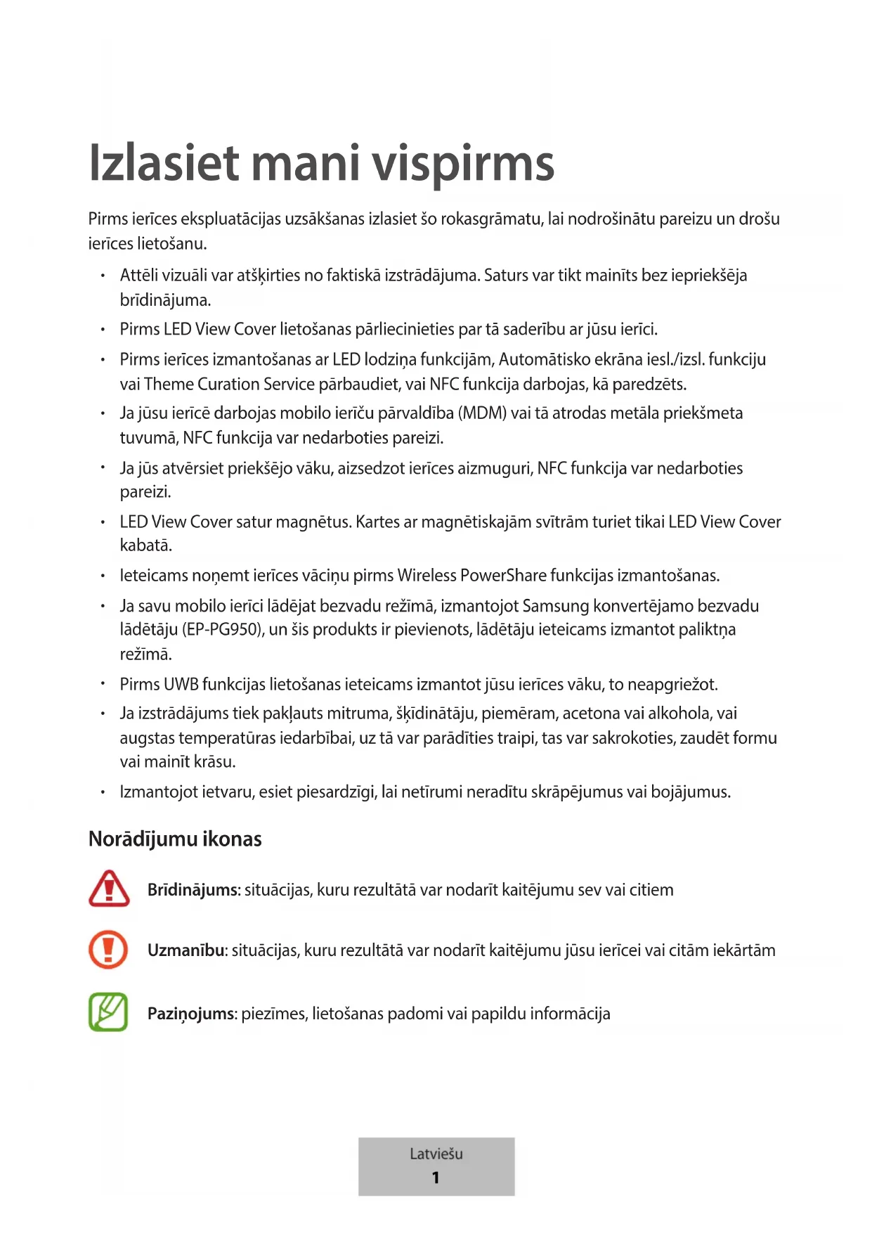 Izmantojot ietvaru, esiet piesardzīgi, lai netīrumi neradītu skrāpējumus vai bojājumus. Norādījumu ikonas Brīdinājums: situācijas, kuru rezultātā var nodarīt kaitējumu sev vai citiem Uzmanību: situācijas, kuru rezultātā var nodarīt kaitējumu jūsu ierīcei vai citām iekārtām Paziņojums: piezīmes, lietošanas padomi vai papildu informācija Latviešu
