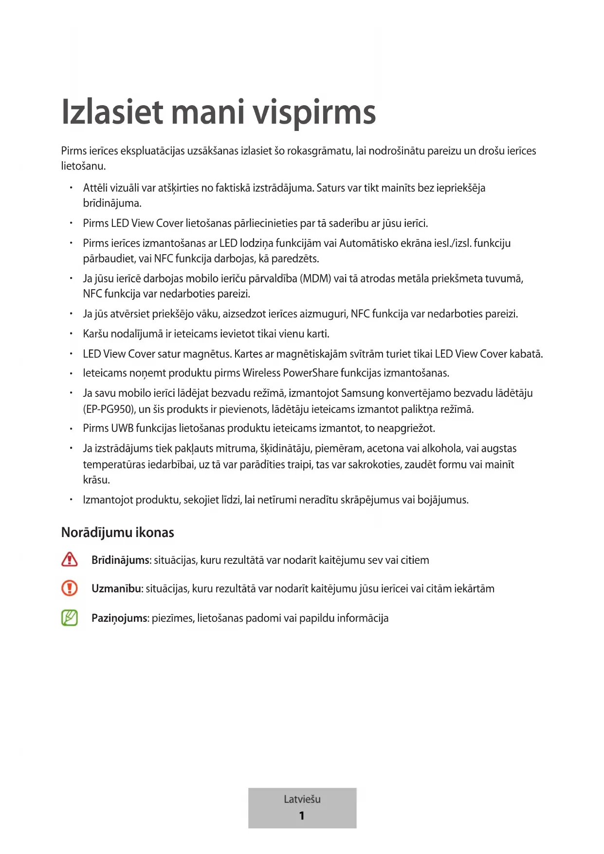 Izmantojot produktu, sekojiet līdzi, lai netīrumi neradītu skrāpējumus vai bojājumus. Norādījumu ikonas Brīdinājums: situācijas, kuru rezultātā var nodarīt kaitējumu sev vai citiem Uzmanību: situācijas, kuru rezultātā var nodarīt kaitējumu jūsu ierīcei vai citām iekārtām Paziņojums: piezīmes, lietošanas padomi vai papildu informācija Latviešu