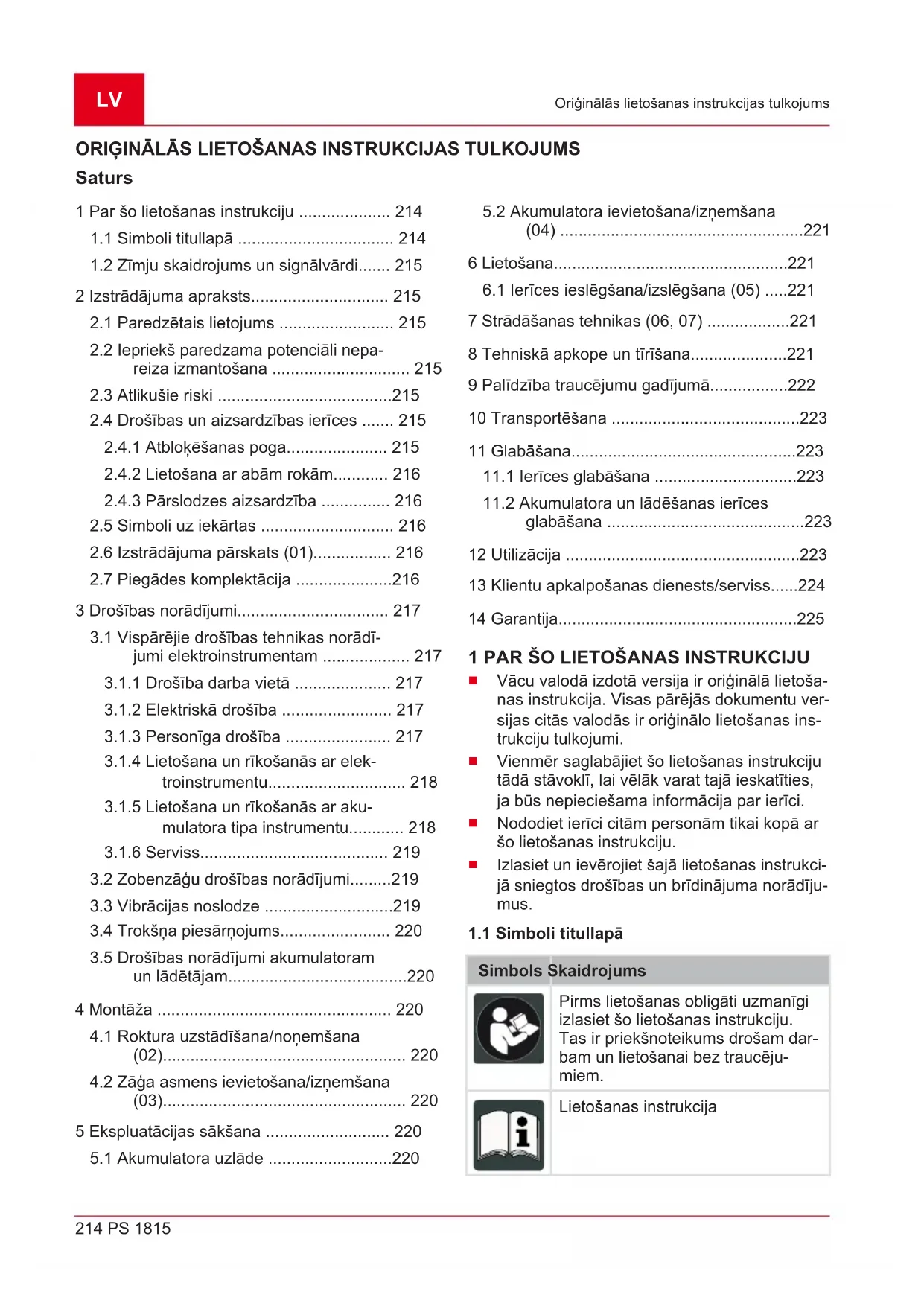 Simbols Skaidrojums Pirms lietošanas obligāti uzmanīgi izlasiet šo lietošanas instrukciju. Tas ir priekšnoteikums drošam dar- bam un lietošanai bez traucēju- miem. Lietošanas instrukcija443170_a 215 Izstrādājuma apraksts Simbols Skaidrojums