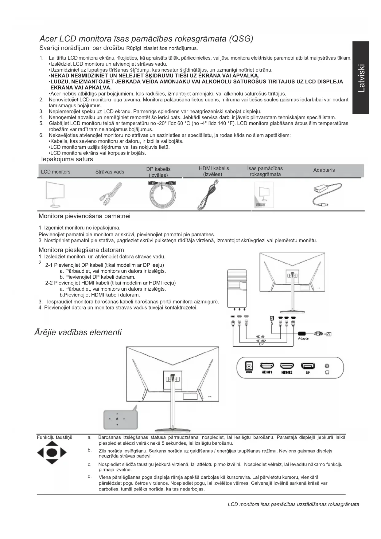 Hz;Latviski /&'PRQLWRUDƯVDVSDPƗFƯEDVX]VWƗGƯãDQDVURNDVJUƗPDWD ƖUƝMLH YDGƯEDV HOHPHQWL $cer/&'PRQLWRUDƯVDVSDPƗFƯEDVURNDVJUƗPDWD46* Svarīgi norādījumi par drošību Rūpīgi izlasiet šos norādījumus. LCD monitors Strāvas vads DP kabelis (izvēles)HDMI kabelis (izvēles)Īsas pamācības rokasgrāmata Monitora pievienošana pamatnei