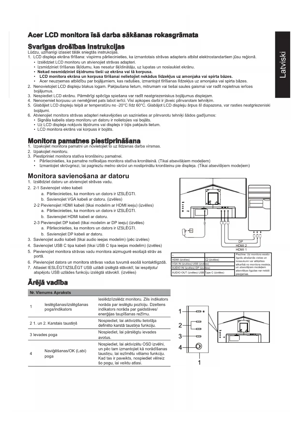 Ievade Izvēlne/Naviģēšanas/OK Funkcijas Spilgtums Kontrasts Blāva zilā gaisma Melnās krāsas pastiprināšana ACM HDR Izcils asums Gamma Krāsu temperatūra Režīmi Krāstelpa Pelēktoņu režīms Sešu asu nokrāsa Sešu asu piesātinājums Skaļums Izslēgt skaņu Over Drive FreeSync Premium VRB Atsvaidzes intensitāte Īpaši zems latentums Mērķēšanas punkts Valoda Ekrāna displeja noildze Caurredzamība Ekrāna displeja bloķēšana Ievade Automātisks avots Platekrāna režīms Karsto taustiņu piešķiršana DDC/CI HDMI melnās krāsas līmenis Ātrās palaišanas režīms Informācija Atiestatīt visus iestatījumus Specifikācijas atšķiras atkarībā no modeļa un / vai modeļa. Acer izstrādājuma rokasgrāmatas un citi dokumenti ir pieejami oficiālajā Acer atbalsta tīmekļa vietnē. HDMI: 31,469-270,000KHz DP: 31,469-281,250KHz (Uz pulkste iem)ņ DP: 1920x1080 pie 250Hz 16,7 miljoni krāsu HDMI: 48-240Hz HDMI: 594,000MHz DP: 48-250Hz (Uz pulksteņiem) DP: 618,750MHz (Uz pulksteņiem) HDMI: 1920x1080 pie 240HzHrvatski Vodič za brzo pokretanje Acer LCD monitora (QSG) Važne sigurnosne upute Pažljivo pročitajte upute u nastavku. 1. Čišćenje LCD monitora: najprije provjerite odgovara li mrežni adapter normama za električne instalacije u vašoj regiji.
