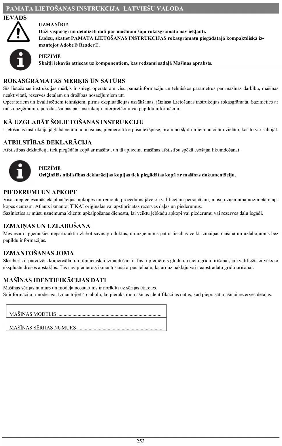 Mašīnas sērijas numurs un modeļa nosaukums ir norādīti uz sērijas etiķetes. Šī informācija ir noderīga. Izmantojiet šo tabulu, lai pierakstītu mašīnas identifikācijas datus, kad pieprasāt mašīnai rezerves detaļas. MAŠĪNAS MODELIS ..................................................................................