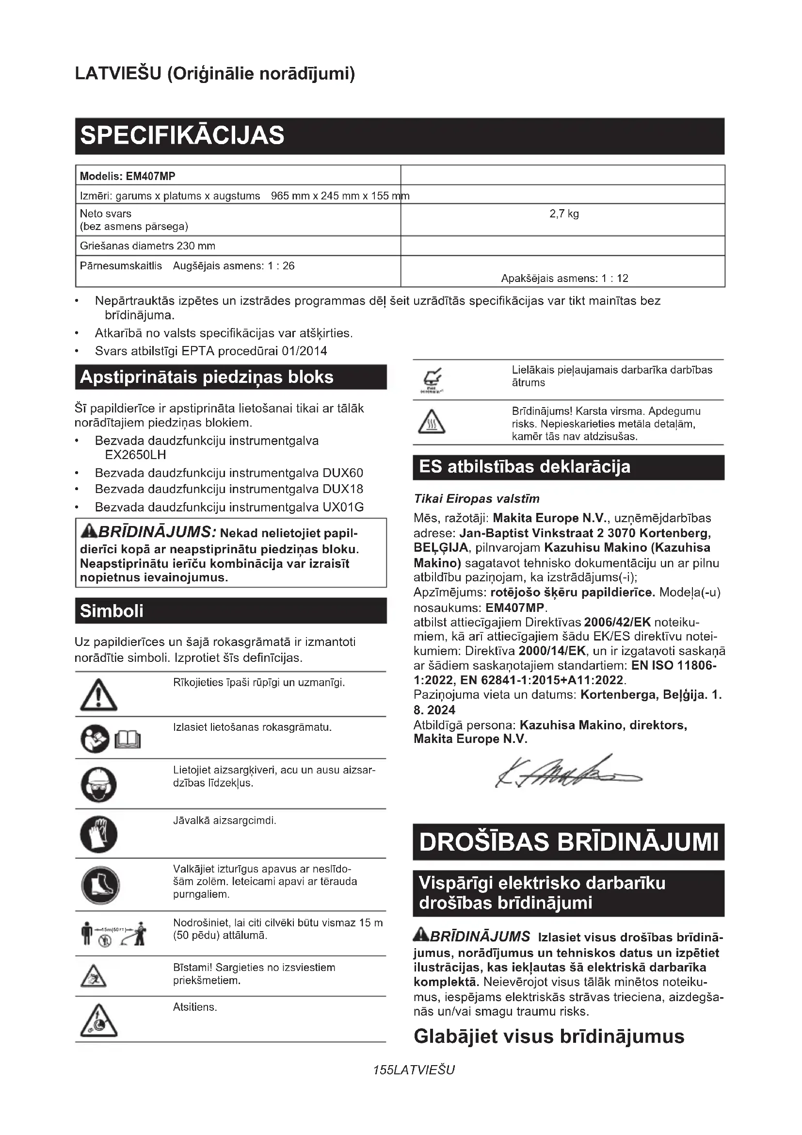 Nodrošiniet,laiciticilvēkibūtuvismaz15m(50pēdu)attālumā.Bīstami!Sargietiesnoizsviestiempriekšmetiem.Atsitiens.LielākaispieļaujamaisdarbarīkadarbībasātrumsBrīdinājums!Karstavirsma.Apdegumurisks.Nepieskarietiesmetāladetaļām,kamērtāsnavatdzisušas. ES atbilstības deklarācija Tikai Eiropas valstīmMēs,ražotāji:Makita Europe N.V.,uzņēmējdarbībasadrese: Jan-Baptist Vinkstraat 2 3070 Kortenberg, BEĻĢIJA,pilnvarojamKazuhisu Makino (Kazuhisa Makino)sagatavottehniskodokumentācijuunarpilnuatbildībupaziņojam,kaizstrādājums(-i);Apzīmējums:rotējošo šķēru papildierīce.Modeļa(-u)nosaukums: EM407MP. atbilstattiecīgajiemDirektīvas2006/42/EK noteiku- miem,kāarīattiecīgajiemšāduEK/ESdirektīvunotei-kumiem:Direktīva2000/14/EK,unirizgatavotisaskaņāaršādiemsaskaņotajiemstandartiem:EN ISO 11806-1:2022, EN 62841-1:2015+A11:2022.Paziņojumavietaundatums:Kortenberga, Beļģija. 1. 8. 2024 Atbildīgāpersona:Kazuhisa Makino, direktors, Makita Europe N.V.