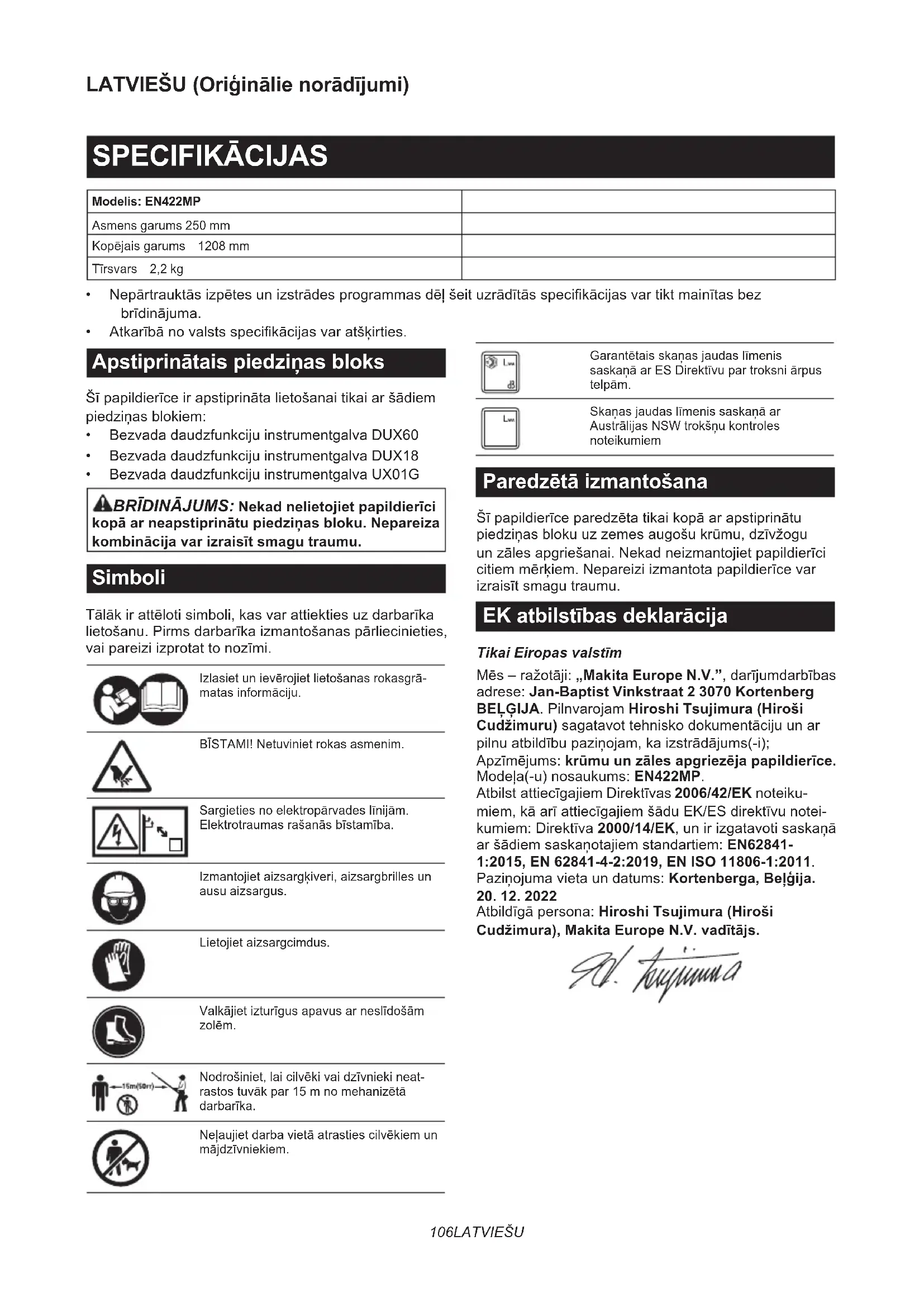 - BezvadadaudzfunkcijuinstrumentgalvaUX01G BRĪDINĀJUMS: Nekad nelietojiet papildierīci kopā ar neapstiprinātu piedziņas bloku. Nepareiza kombinācija var izraisīt smagu traumu. Simboli Tālākirattēlotisimboli,kasvarattiektiesuzdarbarīka lietošanu.Pirmsdarbarīkaizmantošanaspārliecinieties, vaipareiziizprotattonozīmi. Izlasietunievērojietlietošanasrokasgrā- matasinformāciju. BĪSTAMI!Netuvinietrokasasmenim. Sargietiesnoelektropārvadeslīnijām. Elektrotraumasrašanāsbīstamība. Izmantojietaizsargķiveri,aizsargbrillesun ausu aizsargus. Lietojietaizsargcimdus. Valkājietizturīgusapavusarneslīdošām zolēm. Nodrošiniet,laicilvēkivaidzīvniekineat- rastostuvākpar15mnomehanizētā darbarīka. Neļaujietdarbavietāatrastiescilvēkiemun mājdzīvniekiem. Garantētaisskaņasjaudaslīmenis saskaņāarESDirektīvupartroksniārpus telpām. Skaņasjaudaslīmenissaskaņāar AustrālijasNSWtrokšņukontroles noteikumiem Paredzētā izmantošana Šīpapildierīceparedzētatikaikopāarapstiprinātu piedziņasblokuuzzemesaugošukrūmu,dzīvžogu unzālesapgriešanai.Nekadneizmantojietpapildierīci citiemmērķiem.Nepareiziizmantotapapildierīcevar izraisītsmagutraumu. EK atbilstības deklarācija Tikai Eiropas valstīm Mēs–ražotāji:„Makita Europe N.V.”,darījumdarbības adrese: Jan-Baptist Vinkstraat 2 3070 Kortenberg BEĻĢIJA.PilnvarojamHiroshi Tsujimura (Hiroši Cudžimuru)sagatavottehniskodokumentācijuunar pilnuatbildībupaziņojam,kaizstrādājums(-i); Apzīmējums:krūmu un zāles apgriezēja papildierīce. Modeļa(-u)nosaukums:EN422MP. AtbilstattiecīgajiemDirektīvas2006/42/EK noteiku- miem,kāarīattiecīgajiemšāduEK/ESdirektīvunotei- kumiem:Direktīva2000/14/EK,unirizgatavotisaskaņā aršādiemsaskaņotajiemstandartiem:EN62841- 1:2015, EN 62841-4-2:2019, EN ISO 11806-1:2011. Paziņojumavietaundatums:Kortenberga, Beļģija.