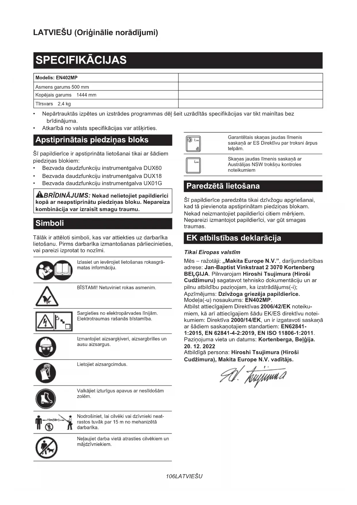 - BezvadadaudzfunkcijuinstrumentgalvaUX01G BRĪDINĀJUMS: Nekad nelietojiet papildierīci kopā ar neapstiprinātu piedziņas bloku. Nepareiza kombinācija var izraisīt smagu traumu. Simboli Tālākirattēlotisimboli,kasvarattiektiesuzdarbarīka lietošanu.Pirmsdarbarīkaizmantošanaspārliecinieties, vaipareiziizprotattonozīmi. Izlasietunievērojietlietošanasrokasgrā- matasinformāciju. BĪSTAMI!Netuvinietrokasasmenim. Sargietiesnoelektropārvadeslīnijām. Elektrotraumasrašanāsbīstamība. Izmantojietaizsargķiveri,aizsargbrillesun ausu aizsargus. Lietojietaizsargcimdus. Valkājietizturīgusapavusarneslīdošām zolēm. Nodrošiniet,laicilvēkivaidzīvniekineat- rastostuvākpar15mnomehanizētā darbarīka. Neļaujietdarbavietāatrastiescilvēkiemun mājdzīvniekiem. Garantētaisskaņasjaudaslīmenis saskaņāarESDirektīvupartroksniārpus telpām. Skaņasjaudaslīmenissaskaņāar AustrālijasNSWtrokšņukontroles noteikumiem Paredzētā lietošana Šīpapildierīceparedzētatikaidzīvžoguapgriešanai, kadtāpievienotaapstiprinātampiedziņasblokam. Nekadneizmantojietpapildierīcicitiemmērķiem. Nepareiziizmantojotpapildierīci,vargūtsmagas traumas. EK atbilstības deklarācija Tikai Eiropas valstīm Mēs–ražotāji:„Makita Europe N.V.”,darījumdarbības adrese: Jan-Baptist Vinkstraat 2 3070 Kortenberg BEĻĢIJA.PilnvarojamHiroshi Tsujimura (Hiroši Cudžimuru)sagatavottehniskodokumentācijuunar pilnuatbildībupaziņojam,kaizstrādājums(-i); Apzīmējums:Dzīvžoga griezēja papildierīce. Modeļa(-u)nosaukums:EN402MP. AtbilstattiecīgajiemDirektīvas2006/42/EK noteiku- miem,kāarīattiecīgajiemšāduEK/ESdirektīvunotei- kumiem:Direktīva2000/14/EK,unirizgatavotisaskaņā aršādiemsaskaņotajiemstandartiem:EN62841- 1:2015, EN 62841-4-2:2019, EN ISO 11806-1:2011. Paziņojumavietaundatums:Kortenberga, Beļģija.