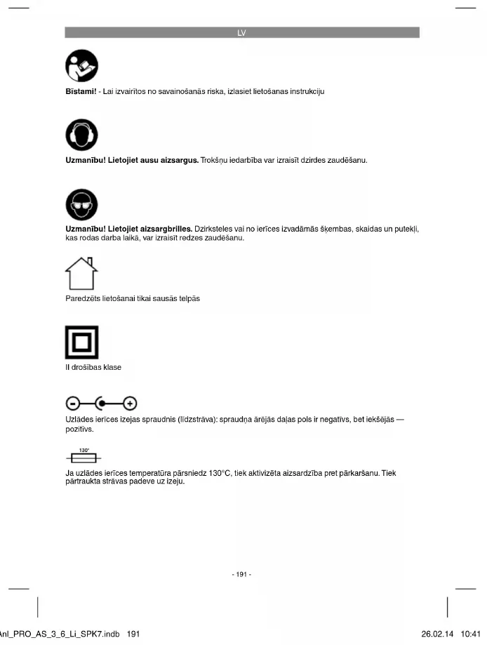 Bīstami! - Lai izvairītos no savainošanās riska, izlasiet lietošanas instrukciju Uzmanību! Lietojiet ausu aizsargus. Trokšņu iedarbība var izraisīt dzirdes zaudēšanu. Uzmanību! Lietojiet aizsargbrilles. Dzirksteles vai no ierīces izvadāmās šķembas, skaidas un putekļi, kas rodas darba laikā, var izraisīt redzes zaudēšanu. Paredzēts lietošanai tikai sausās telpās II drošības klase Uzlādes ierīces izejas spraudnis (līdzstrāva): spraudņa ārējās daļas pols ir negatīvs, bet iekšējās — pozitīvs. 130° Ja uzlādes ierīces temperatūra pārsniedz 130°C, tiek aktivizēta aizsardzība pret pārkaršanu. Tiek pārtraukta strāvas padeve uz izeju. Anl_PRO_AS_3_6_Li_SPK7.indb 191Anl_PRO_AS_3_6_Li_SPK7.indb 191 26.02.14 10:4126.02.14 10:41LV
