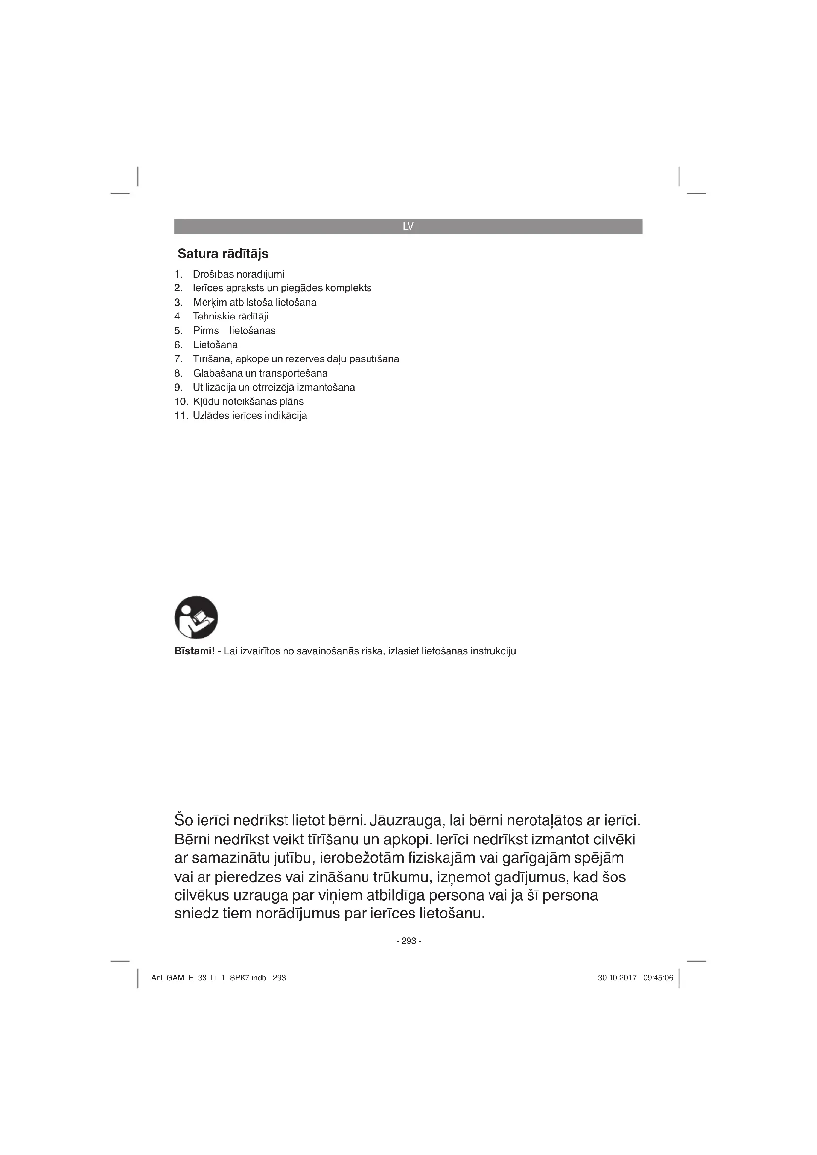 Satura rādītājs Šo ierīci nedrīkst lietot bērni. Jāuzrauga, lai bērni nerotaļātos ar ierīci. Bērni nedrīkst veikt tīrīšanu un apkopi. Ierīci nedrīkst izmantot cilvēki ar samazinātu jutību, ierobežotām fi ziskajām vai garīgajām spējām vai ar pieredzes vai zināšanu trūkumu, izņemot gadījumus, kad šos cilvēkus uzrauga par viņiem atbildīga persona vai ja šī persona sniedz tiem norādījumus par ierīces lietošanu. Bīstami! - Lai izvairītos no savainošanās riska, izlasiet lietošanas instrukciju