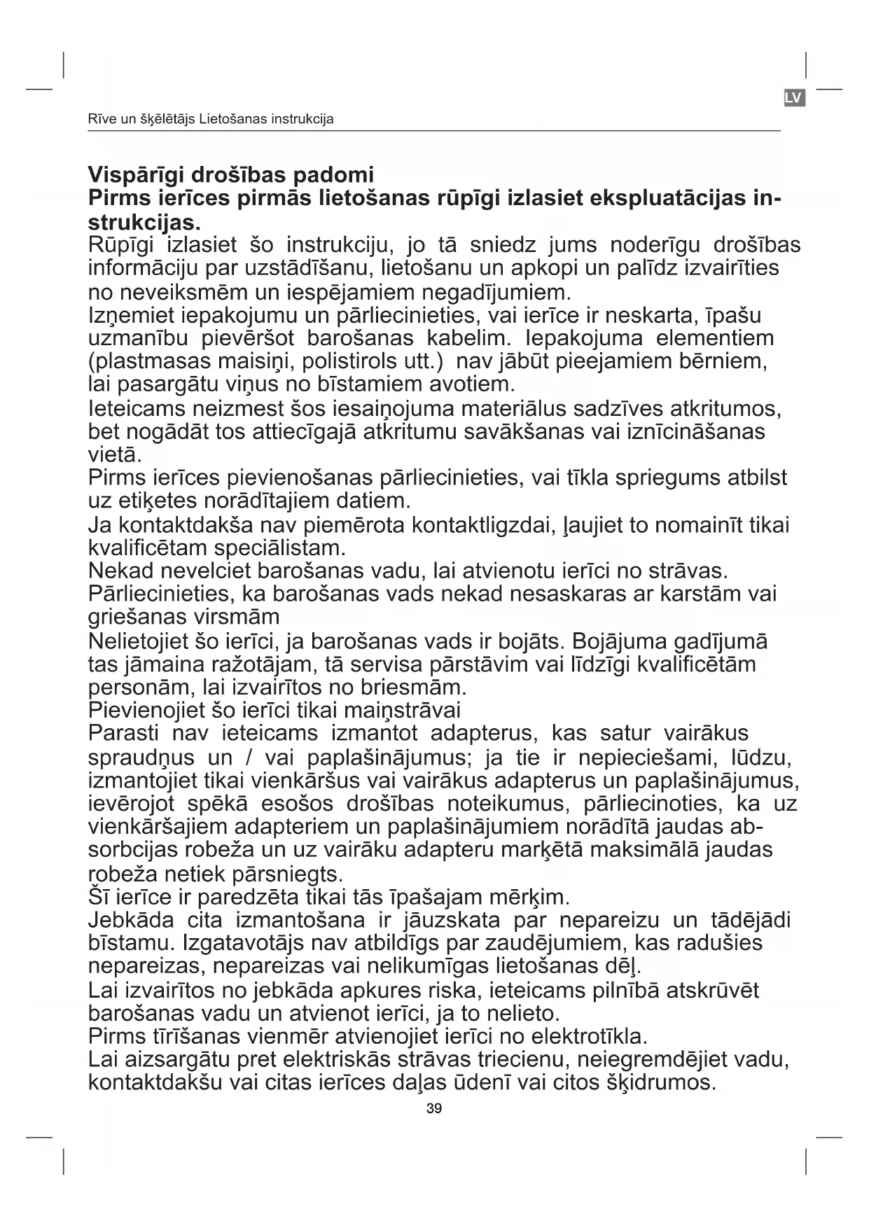 Neturiet ierīci ar mitrām rokām Nepakļaujiet ierīci atmosfēras iedarbībai, tādiem kā, lietus, vējš, sniegs, krusa. Nelietojiet ierīci sprāgstvielu, viegli uzliesmojošu materiālu, gāzu, degošas liesmas, sildītāju tuvumā. Neļaujiet bērniem, invalīdiem vai visiem cilvēkiem bez pieredzes vai tehniskām iespējām lietot ierīci, ja viņi netiek pienācīgi uzraudzīti. Cieša uzraudzība ir nepieciešama, ja jebkuru ierīci lieto bērni. Pārliecinieties, ka bērni nespēlē ar šo ierīci. Ja jūs nolemjat vairs nelietot ierīci, padariet to nelie- tojamu, izslēdziet un atvienojiet no strāvas Visas bīstamās ierīces daļas atslēdziet un glabājiet bērniem nepieejamā vietā. Lietošanas brīdinājumi Lietošanas laikā novietojiet ierīci uz horizontālas virsmas. Lietošanas laikā uzmanieties, lai strāvas vads nekarātos virs galda malas. Kad ierīce netiek lietota un pirms jebkādām tīrīšanas darbībām, izslēdziet to un atvienojiet strāvas vadu no kontaktligzdas. Nelietojiet ierīci nepārtraukti ilgāk par 5 minūtēm. Ierīces konusi ir ļoti asi; esiet uzmanīgs un piesardzīgi rīkojieties ar asmeņiem. Nekad nepieskarieties ierīces kustīgajām daļām. Nekad neatstājiet ierīci bez uzraudzības, kamēr tā darbojas. Neizņemiet apstrādātos produktus no uzpildes caurules, kamēr asmeņi pārvietojas. Vienmēr gaidiet, līdz asmeņi pilnībā apstājas. Nelietojiet ierīci tukšā stāvoklī. Nenoņemiet konusus, pirms motors nav pilnībā apstājies. Darbības laikā nelieciet rokas vai citus priekšmetus uzpildes carulē. Nekad nemērciet motora korpusu, kontaktdakšu vai elektrības kabeli ūdenī vai citos šķidrumos. To tīrīšanai izmantojiet mitru drānu. Izmantojiet ierīci tikai tam mērķim, kuram tas ir paredzēts. Produkts paredzēts tikai mājas lietošanai.Rīve un šķēlētājs Lietošanas instrukcija