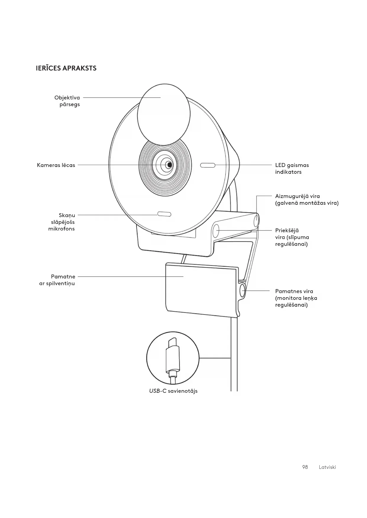 “Logi Tune” palīdz uzlabot tīmeka kameras sniegumu, regulāri nodrošinot programmatūras un aparātprogrammatūras atjauninājumus. Ieteicams atjaunināt tīmeka kameru unizmantot “Brio 300” lieliskās iespējas . Lai to izdarītu, lejupielādējiet “Logi Tune” vietnē www.logitech.com/tune “Logi Tune” Tīmekļa kamera Augstumsxplatumsxdziums: 65,63mm (2,58collas)x53,1mm (2,09collas)x45mm (1,78collas), ieskaitot stiprinājuma skavu Izstrādājuma svars: 74,6g (2,63unces), ieskaitot stiprinājuma skavu un kabeli Pievienotā kabeļa garums: 1,5m (5pēdas) IZMĒRI 101Latviski© 2023 “Logitech”. “Logitech”, “Logi” un “Logitech” logotips ir preču zīmes vai reistrētas preču zīmes, kas pieder uzēmumam “Logitech Europe S.A.” un/vai tā struktūrvienībām ASV un citās valstīs. “USB-C” un visas pārējās preču zīmes pieder to attiecīgajiem īpašniekiem. Uzēmums “Logitech” neuzemas nekādu atbildību par kūdām, kas var būt atrodamas šajā rokasgrāmatā. Šeit ietvertā informācija var tikt mainīta bez brīdinājuma. www.logitech.com/support/Brio300SUSIPAŽINKITE SU SAVO PRODUKTU LED indikacinė lemputė Priekinis vyris (pakreipimo reguliavimo) Kojelės vyris (monitoriaus kampo reguliavimo) Galinis vyris (pagrindinis tvirtinimo vyris) Privatumo uždanga Vaizdo kameros objektyvas Triukšmą slopinantis mikrofonas Paminkštinta kojelė USB C jungtis 103 LietuviųUSB-C