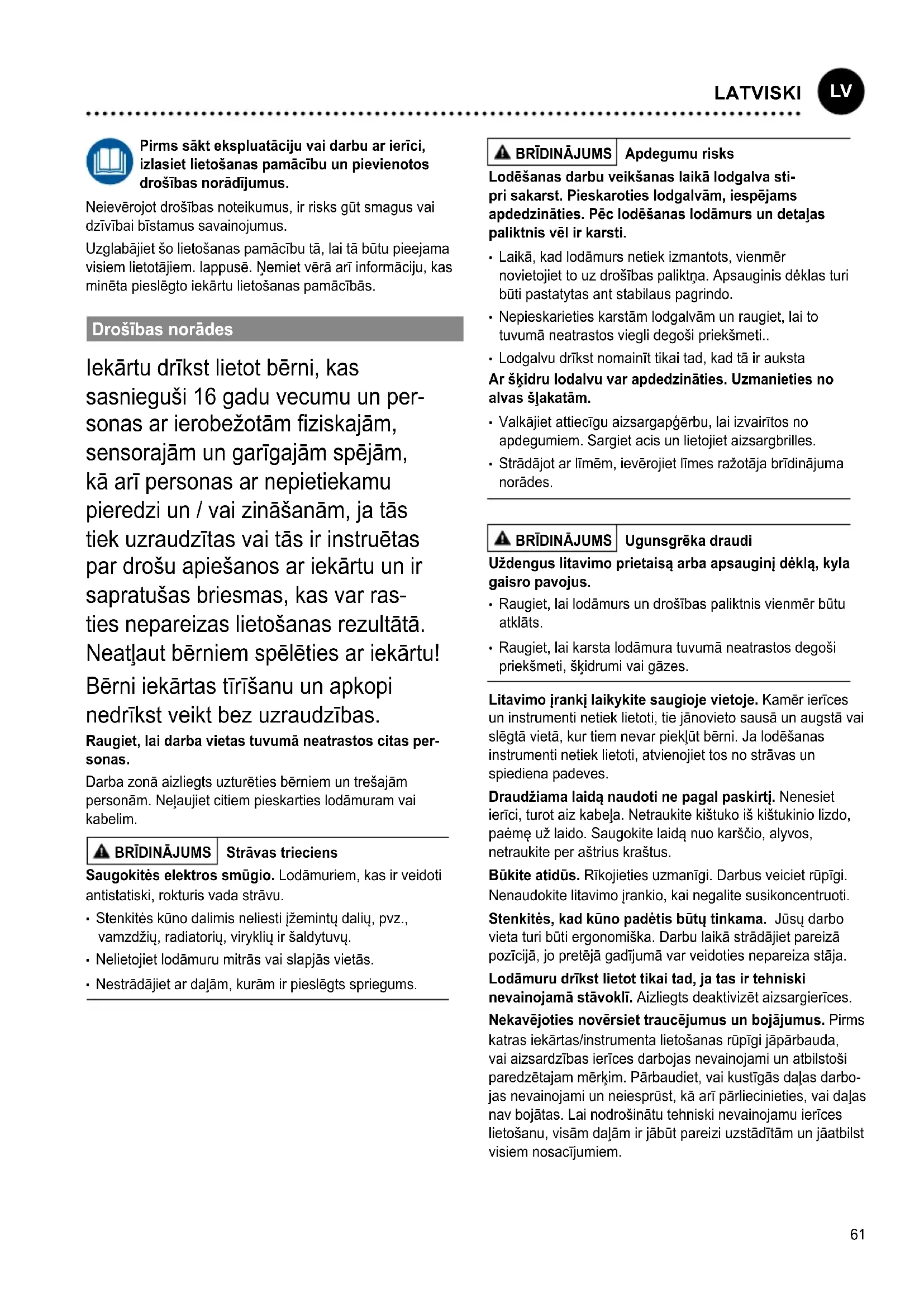 - Nepieskarieties karstām lodgalvām un raugiet, lai to tuvumā neatrastos viegli degoši priekšmeti..