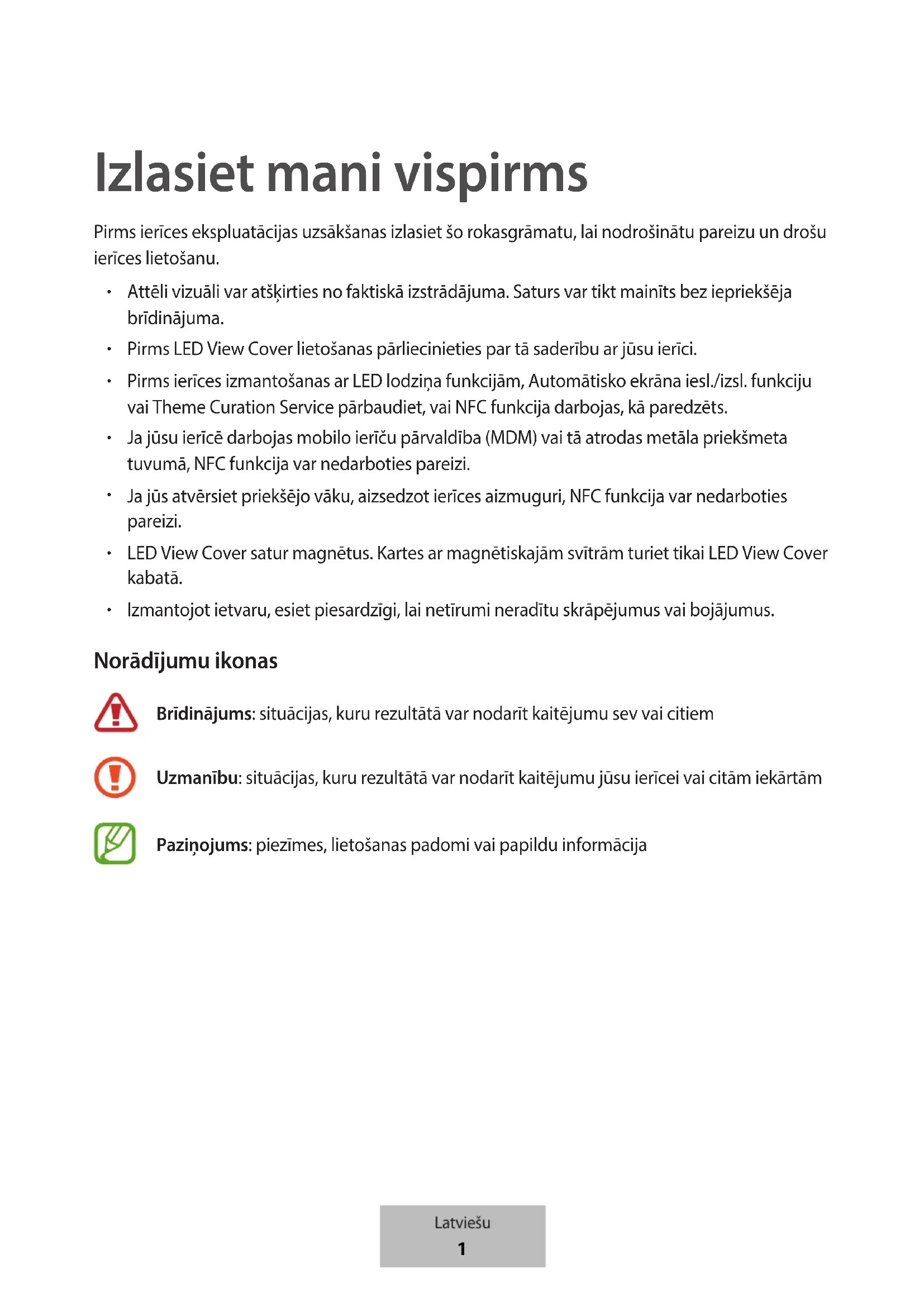 Izmantojot ietvaru, esiet piesardzīgi, lai netīrumi neradītu skrāpējumus vai bojājumus. Norādījumu ikonas Brīdinājums: situācijas, kuru rezultātā var nodarīt kaitējumu sev vai citiem Uzmanību: situācijas, kuru rezultātā var nodarīt kaitējumu jūsu ierīcei vai citām iekārtām Paziņojums: piezīmes, lietošanas padomi vai papildu informācija Latviešu