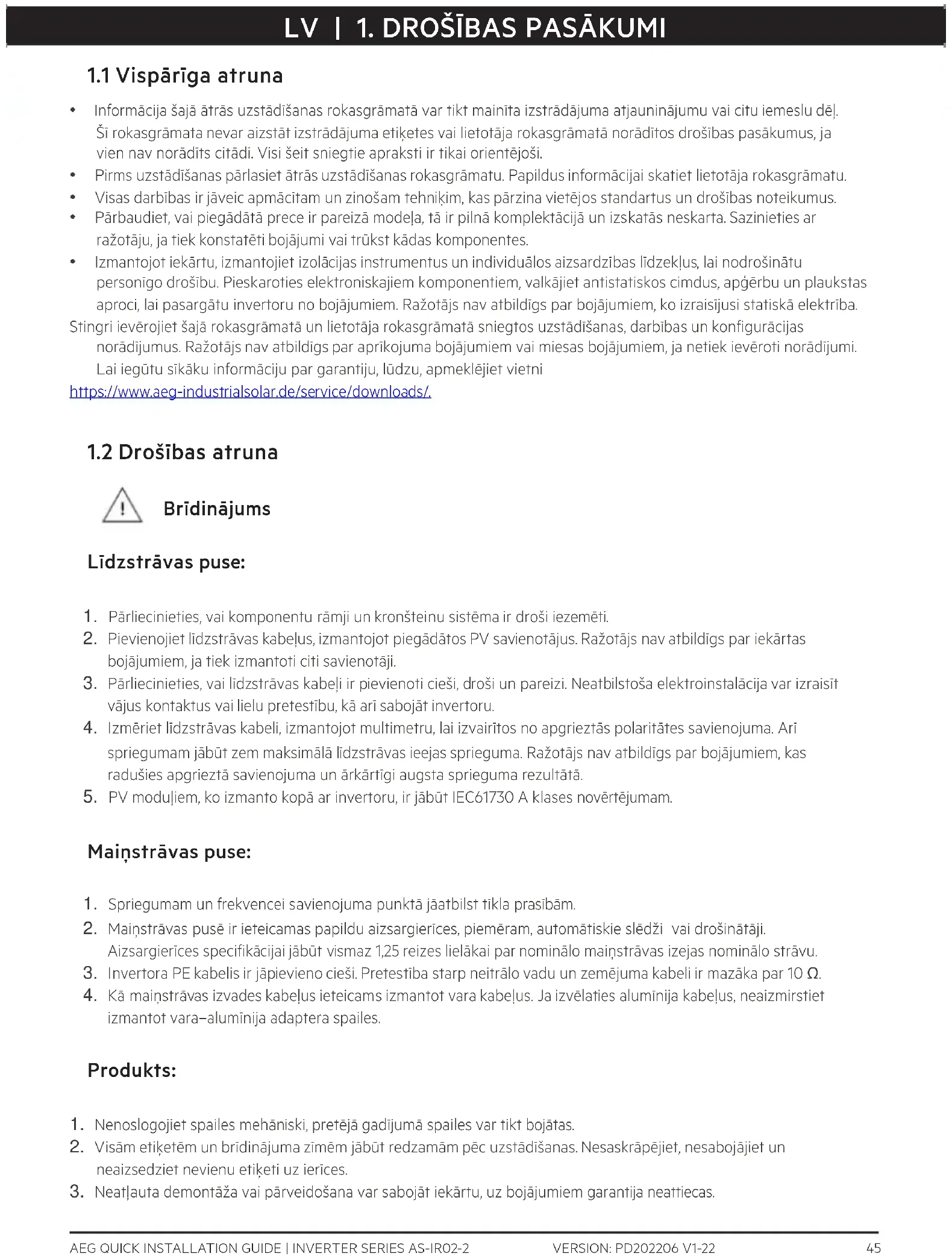 - Izmantojot iekārtu, izmantojiet izolācijas instrumentus un individuālos aizsardzības līdzekļus, lai nodrošinātu personīgo drošību. Pieskaroties elektroniskajiem komponentiem, valkājiet antistatiskos cimdus, apģērbu un plaukstas aproci, lai pasargātu invertoru no bojājumiem. Ražotājs nav atbildīgs par bojājumiem, ko izraisījusi statiskā elektrība. Stingri ievērojiet šajā rokasgrāmatā un lietotāja rokasgrāmatā sniegtos uzstādīšanas, darbības un konfigurācijas norādījumus. Ražotājs nav atbildīgs par aprīkojuma bojājumiem vai miesas bojājumiem, ja netiek ievēroti norādījumi. Lai iegūtu sīkāku informāciju par garantiju, lūdzu, apmeklējiet vietni https://www.aeg-industrialsolar.de/service/downloads/.