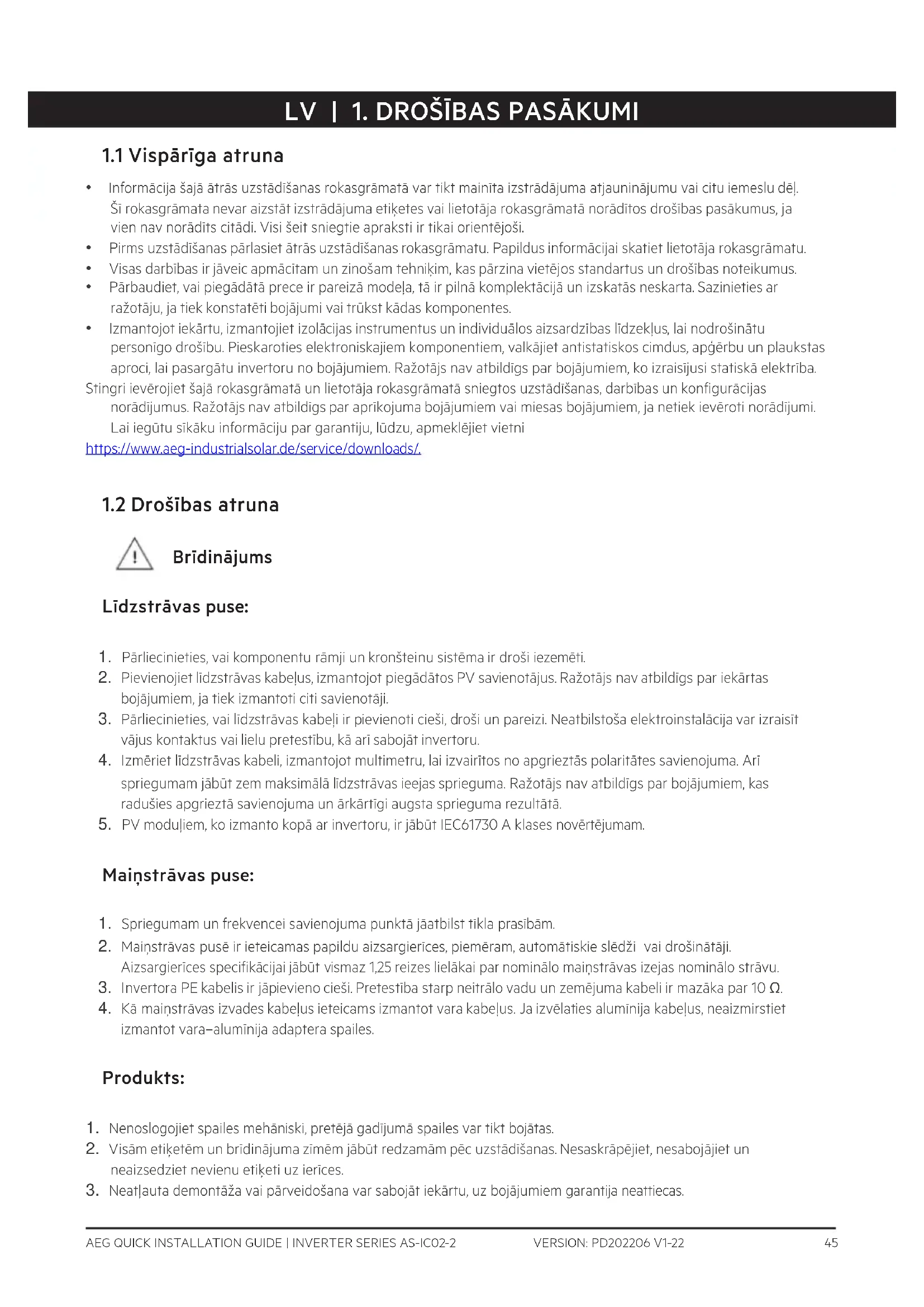 neaizsedziet nevienu etiķeti uz ierīces. 3. Neatļauta demontāža vai pārveidošana var sabojāt iekārtu, uz bojājumiem garantija neattiecas.AEG QUICK INSTALLATION GUIDE | INVERTER SERIES AS-IC02-2 VERSION: PD202206 V1-22 46