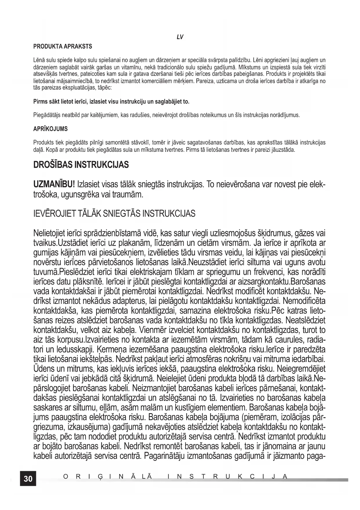 PRODUKTA APRAKSTS Lēnā sulu spiede kalpo sulu spiešanai no augļiem un dārzeņiem ar speciāla svārpsta palīdzību. Lēni apgriezieni ļauj augļiem un dārzeņiem saglabāt vairāk garšas un vitamīnu, nekā tradicionālo sulu spiežu gadījumā. Mīkstums un izspiestā sula tiek virzīti atsevišķās tvertnes, pateicoties kam sula ir gatava dzeršanai tieši pēc ierīces darbības pabeigšanas. Produkts ir projektēts tikai lietošanai mājsaimniecībā, to nedrīkst izmantot komerciāliem mērķiem. Pareiza, uzticama un droša ierīces darbība ir atkarīga no tās pareizas ekspluatācijas, tāpēc: Pirms sākt lietot ierīci, izlasiet visu instrukciju un saglabājiet to. Pieg ādātājs neatbild par kaitējumiem, kas radušies, neievērojot drošības noteikumus un šīs instrukcijas norādījumus. APRĪKOJUMS Produkts tiek piegādāts pilnīgi samontētā stāvoklī, tomēr ir jāveic sagatavošanas darbības, kas aprakstītas tālākā instrukcijas daļā. Kopā ar produktu tiek piegādātas sula un mīkstuma tvertnes. Pirms tā lietošanas tvertnes ir pareizi jāuzstāda.