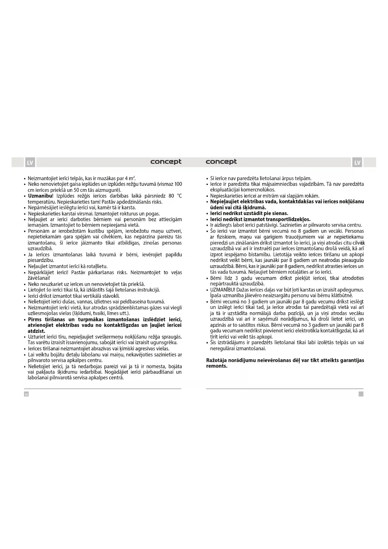 PATEICĪBA Pateicamies par šīs “Concept” ierīces iegādi. Ceram, ka būsiet apmierināti ar šo izstrādājumu visu tā izmantošanas laiku. Pirms lietošanas rūpīgi izlasiet šo lietošanas instrukciju un uzglabājiet to drošā vietā, lai nepieciešamības gadījumā varētu pārlasīt. Nodrošiniet, lai arī citi cilvēki, kuri izmantos šo ierīci, pirms tās lietošanas būtu iepazinušies ar norādījumiem. Tehniskie dati Spriegums 220–240 V ~ 50 Hz Power 2 000 W Frekvenču diapazons 2412-2472 MHz Maksimālā raidītāja jauda ≤18 dBm